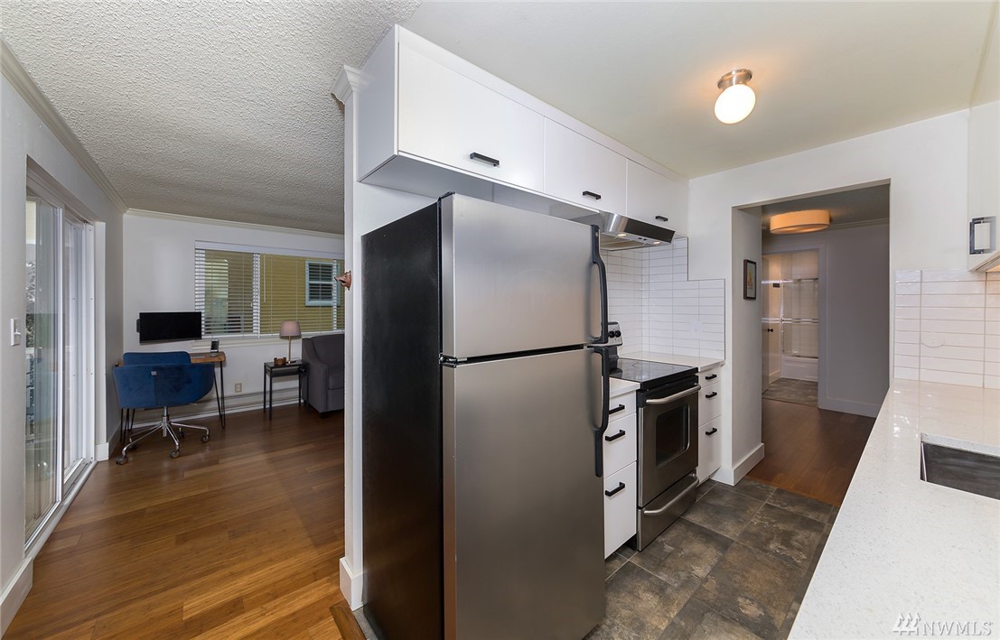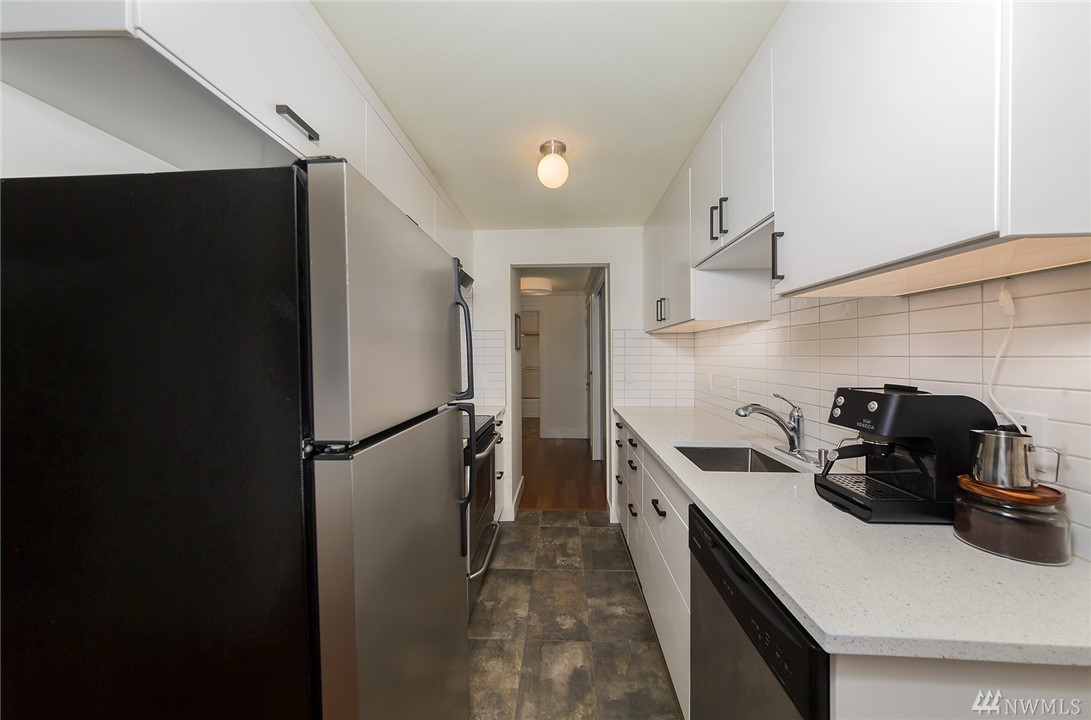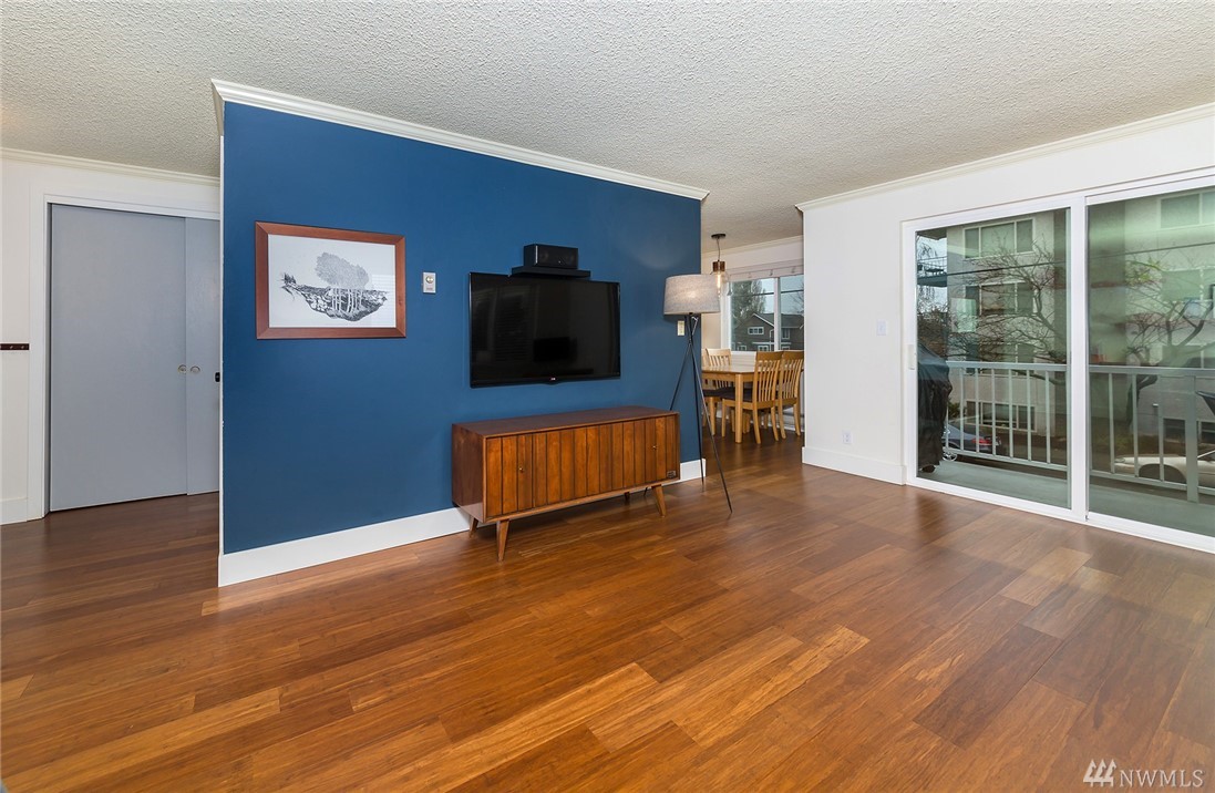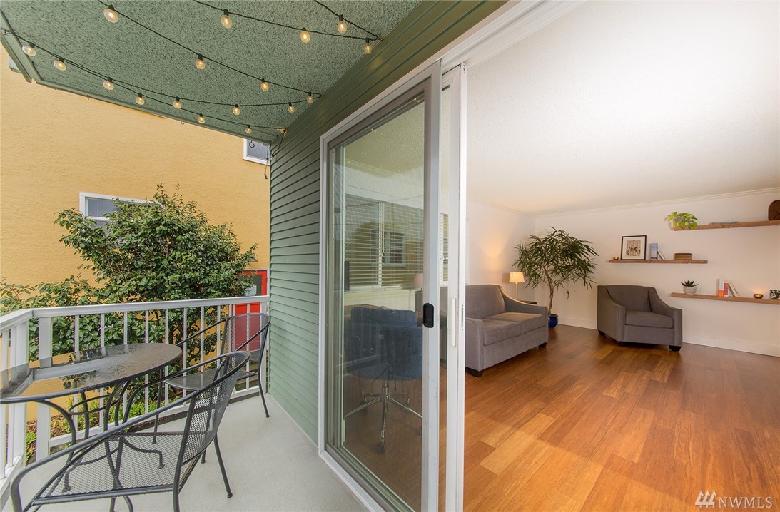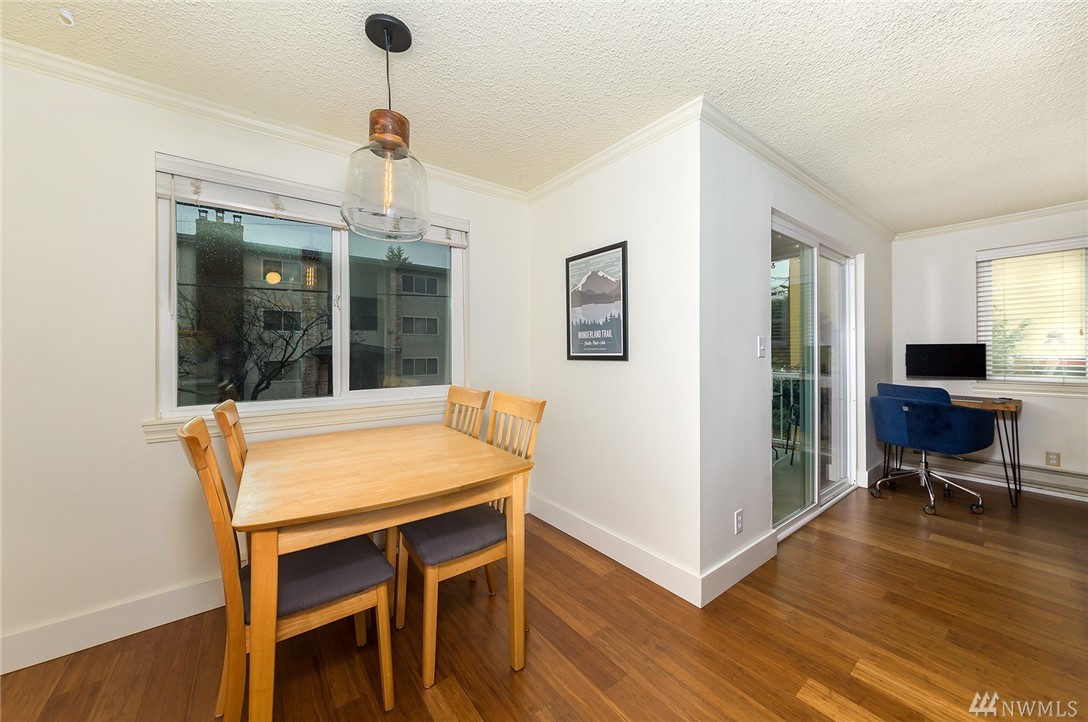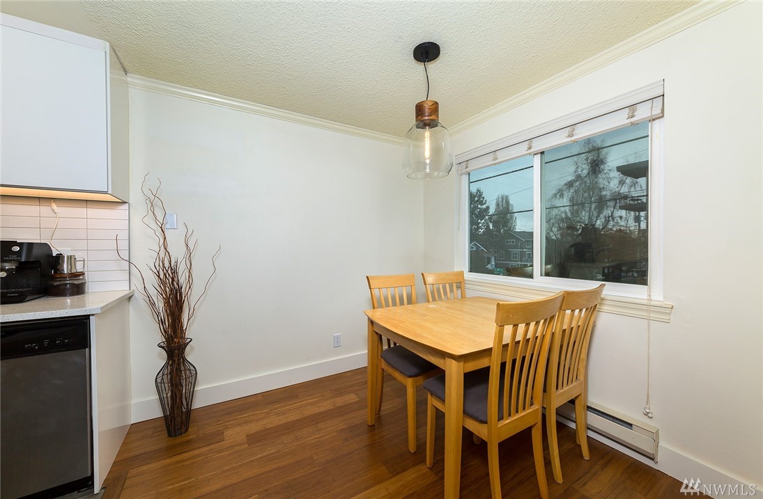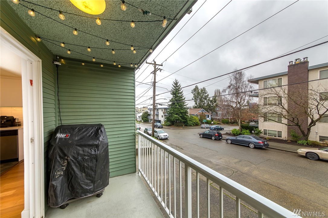 Sunny one-bedroom corner condo in desirable upper Fremont features quartz countertops, subway tile backsplash, stainless steel appliances, gorgeous bamboo and tile flooring, crown moulding, double-pane vinyl windows, and updated bathroom. Unit includes private south-facing deck, plus one assigned parking spot, on-site laundry and dedicated storage unit. Well-run seven-unit building, close to bus, shopping, coffee, dining and more!
