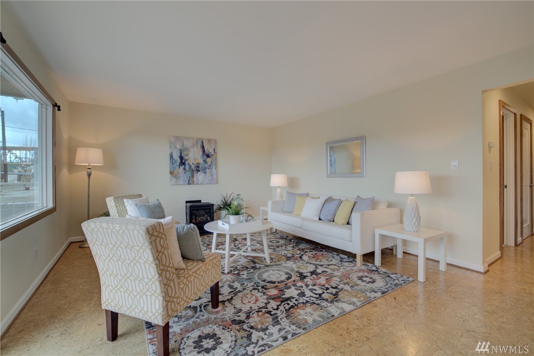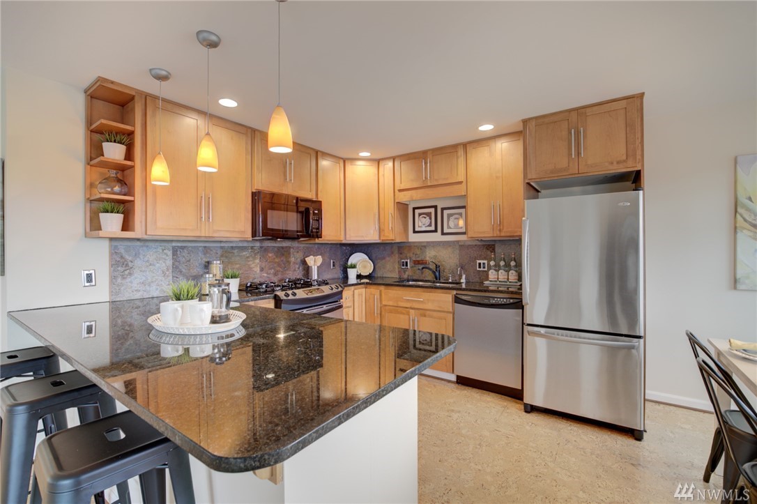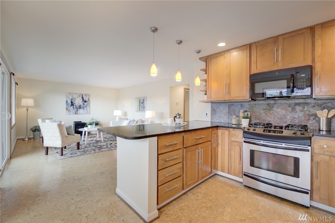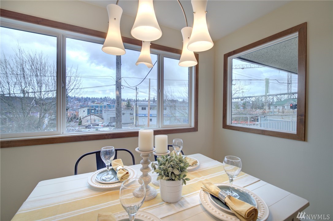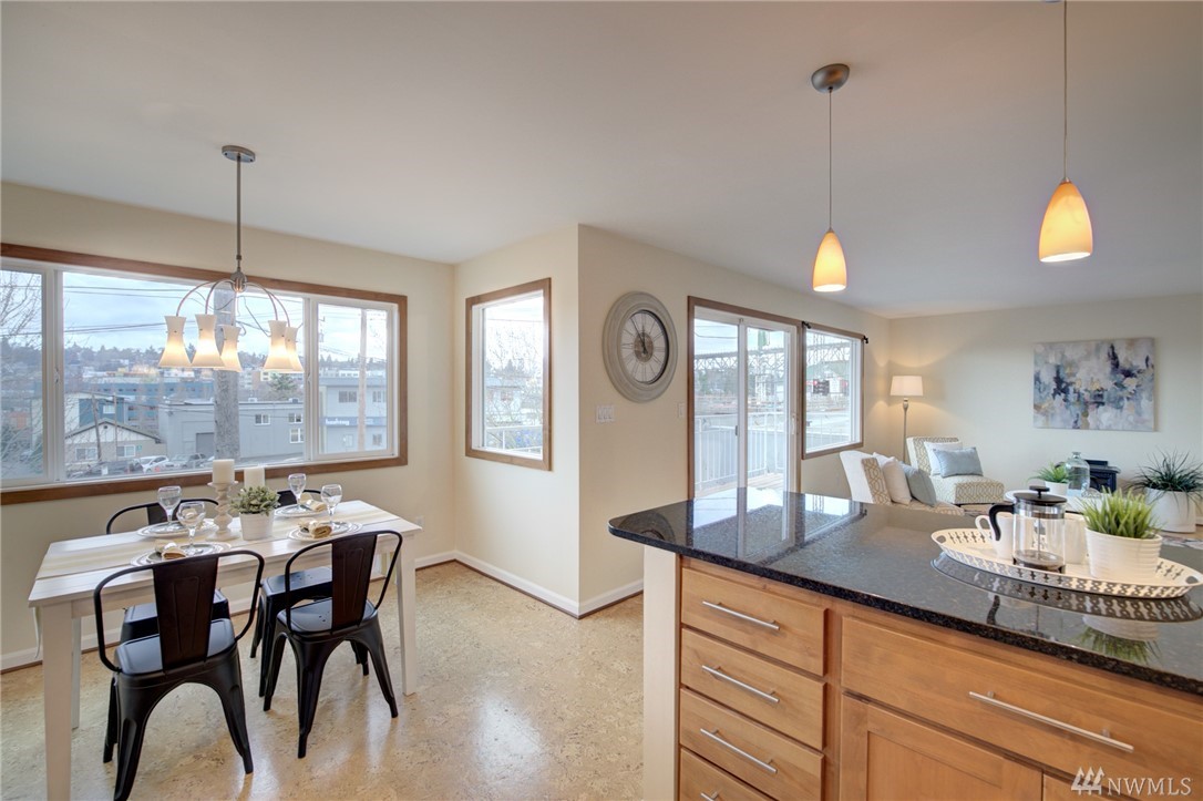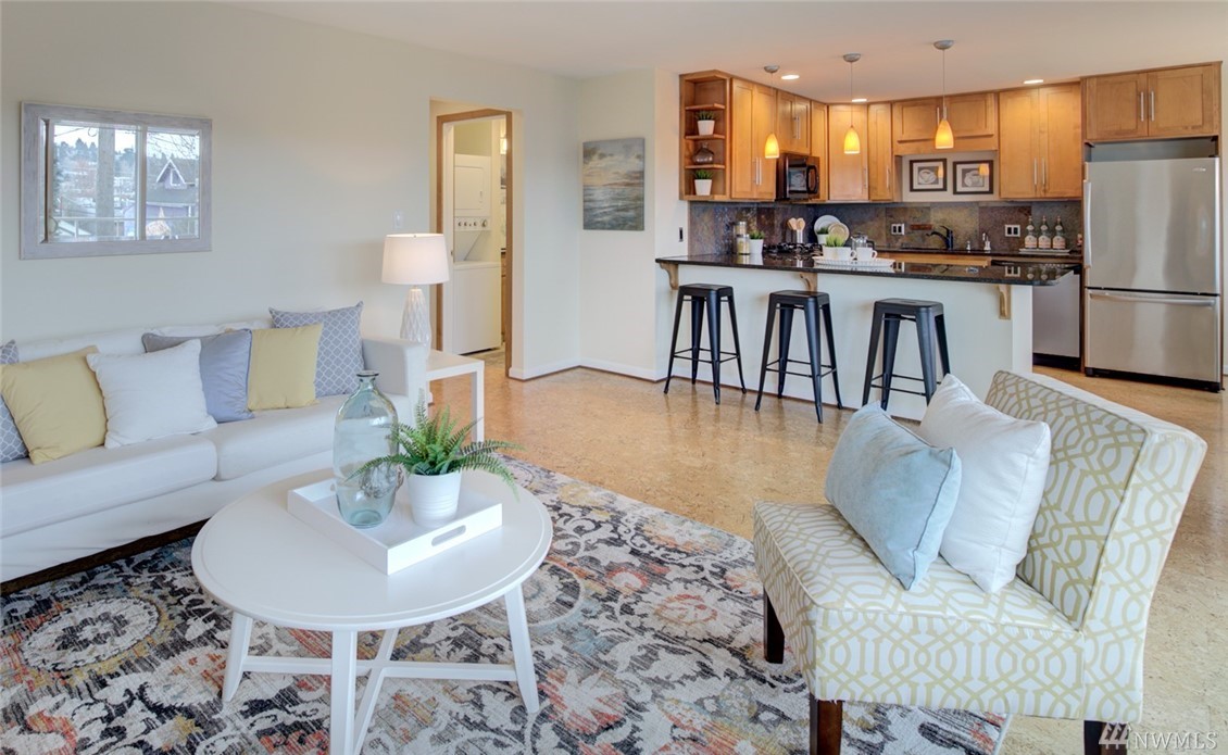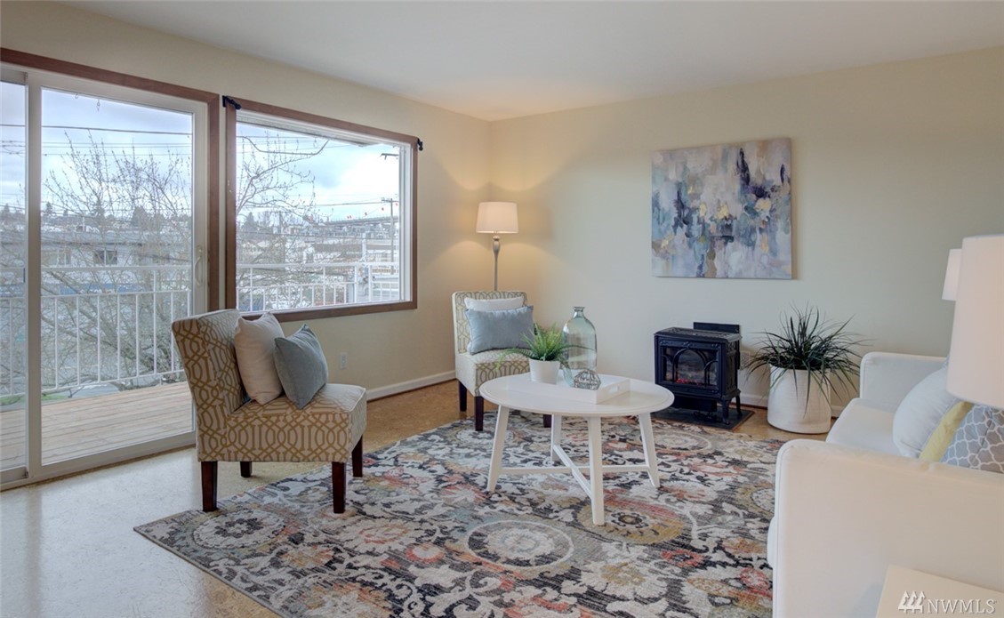 Spacious, bright, open, level-entry condo in small, private 4-plex on Queen Anne side of Fremont Bridge. House-sized kitchen opens to spacious living & dining rooms. Gas cooking. Two 3/4 baths with heated stone floors. Jotul gas free-standing stove in LR. Burl cork flooring. In-unit W/D. Enjoy all that Queen Anne & Fremont have to offer. 1 block to Burke-Gilman. Watch the Fremont Bridge go up and down. Don't street appraise. HOA incls earthquake. 2 prking spots right by front door. Pet friendly.
