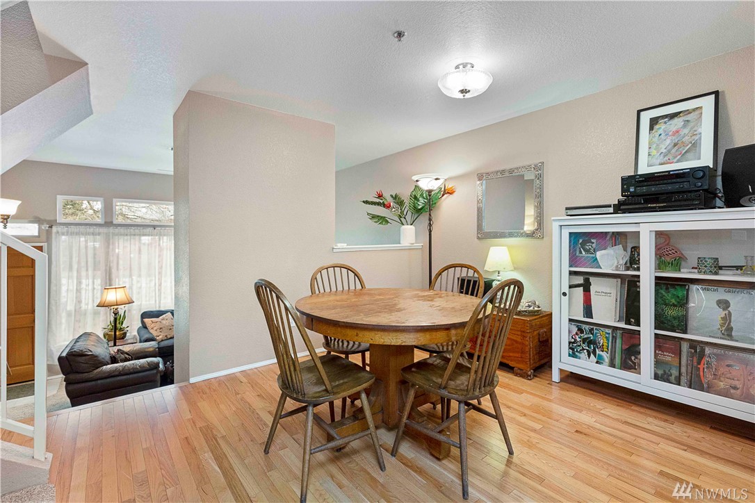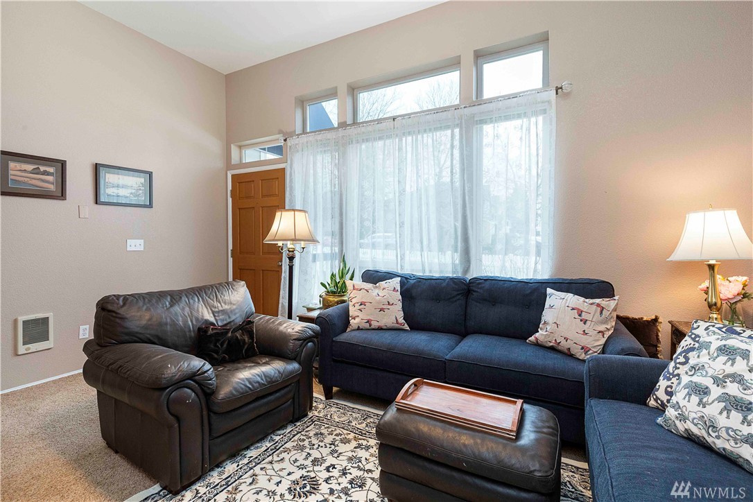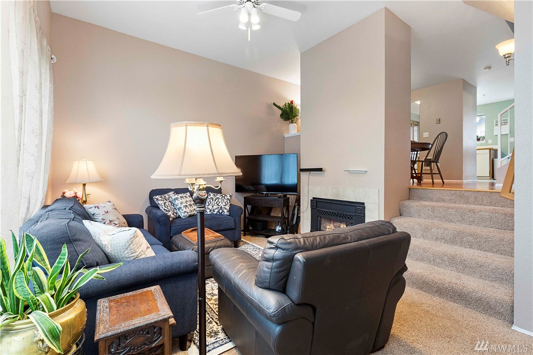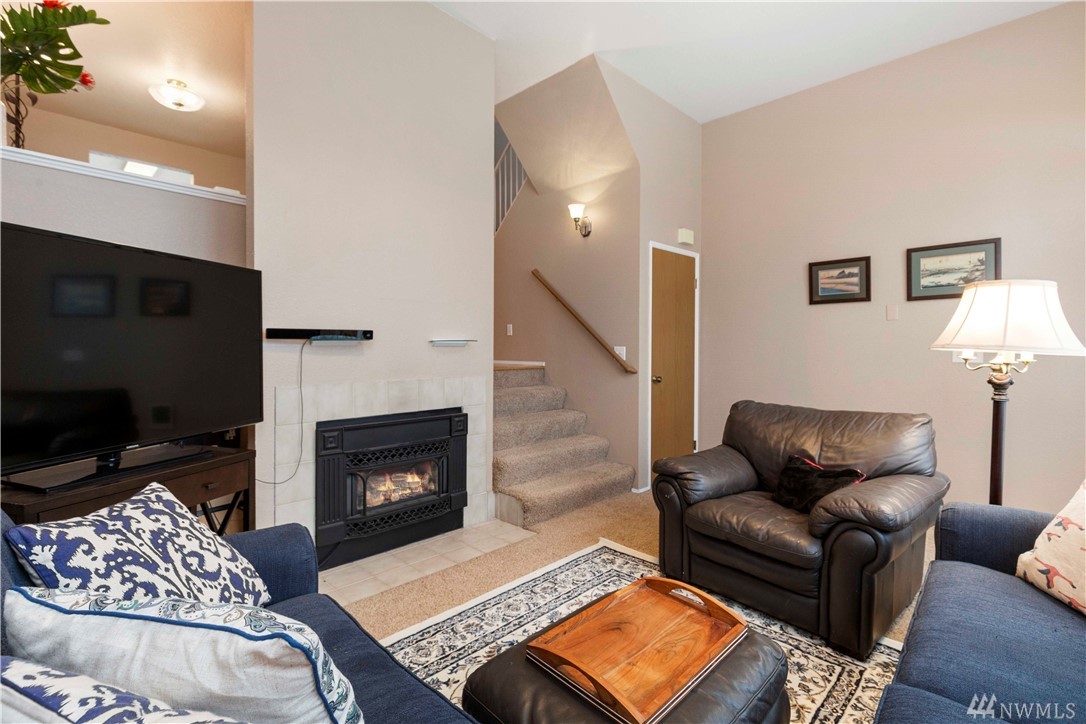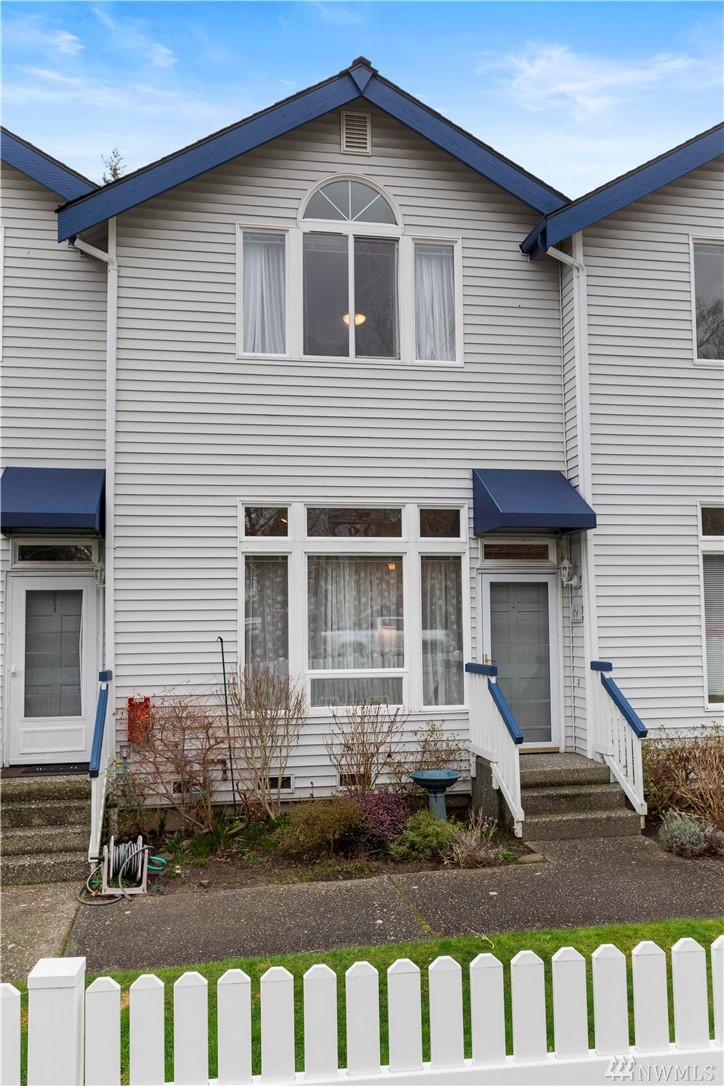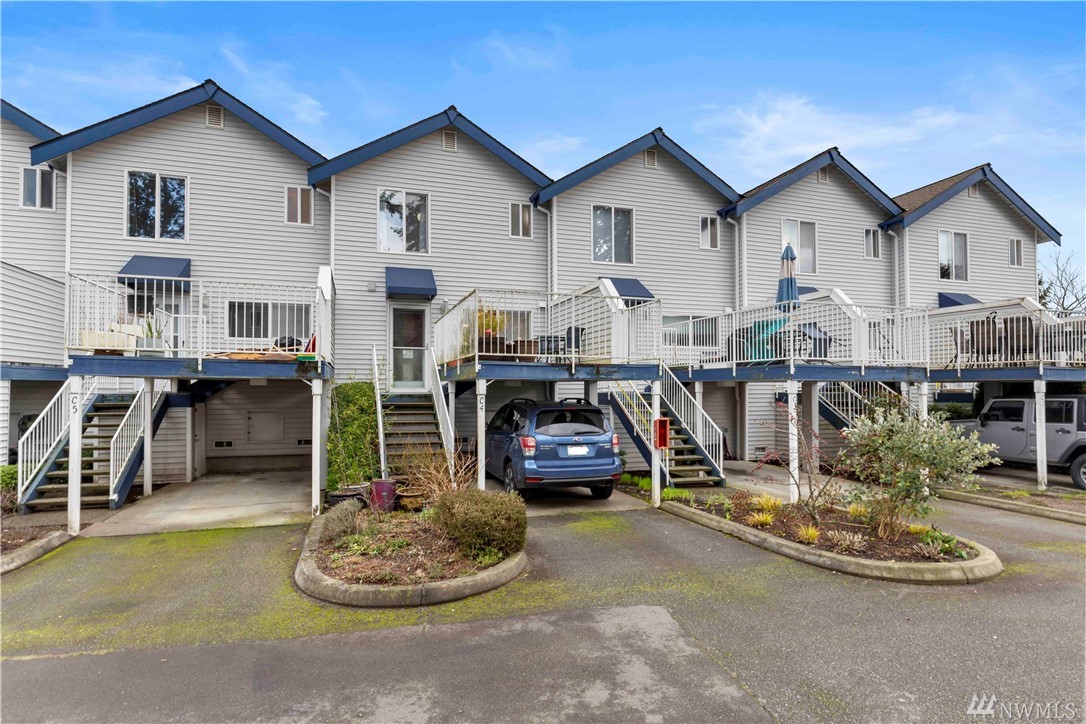Terrific location & desirable community. Perfect layout; entry level living room with high ceilings, gas fireplace and large windows. Good sized kitchen with extra nook, separate dining, hardwoods & powder room. Upstairs offers 2 Bdrms both with en-suites, vaulted ceilings, master walk-in & laundry. Generous deck - great for entertaining. Close to shopping, restaurants, I-5, 405, Paine Field. Covered parking. An inviting, quiet home. Perfect for years to come. Great price, don't miss this home!!