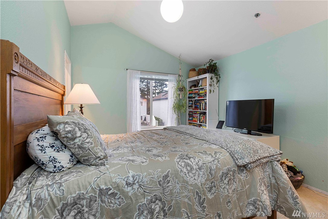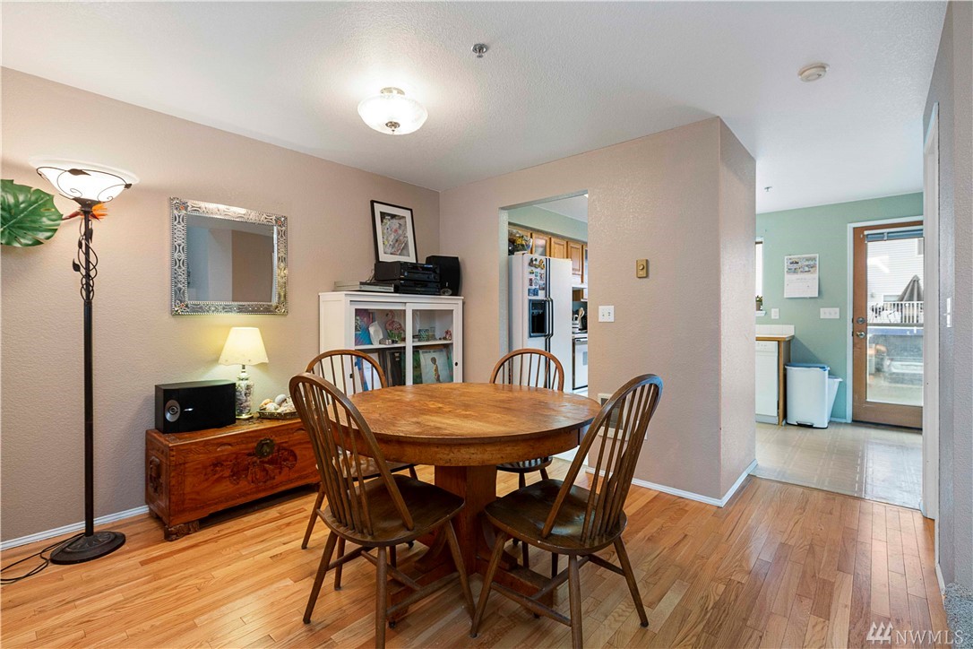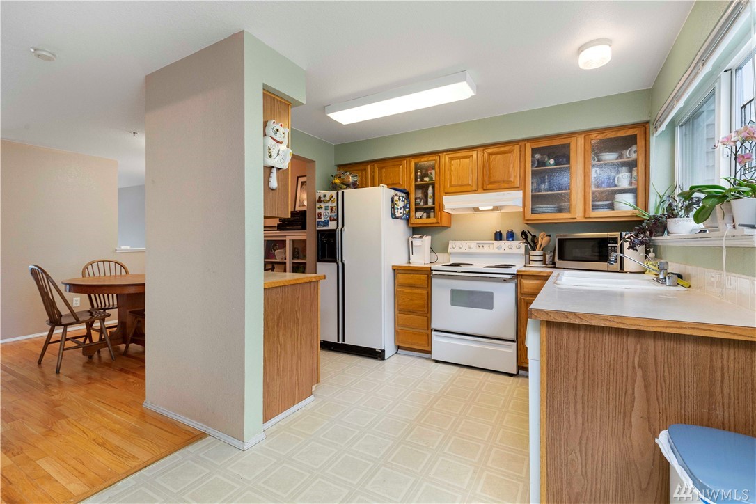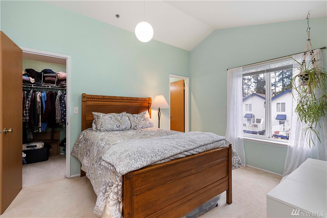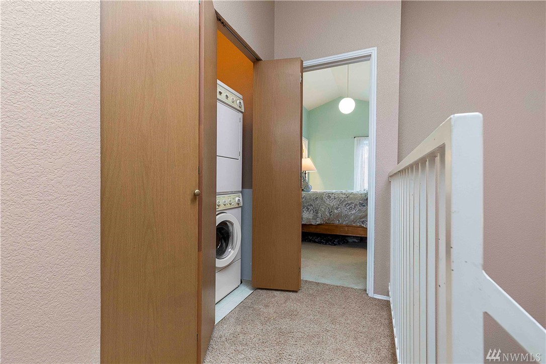 Terrific location & desirable community. Perfect layout; entry level living room with high ceilings, gas fireplace and large windows. Good sized kitchen with extra nook, separate dining, hardwoods & powder room. Upstairs offers 2 Bdrms both with en-suites, vaulted ceilings, master walk-in & laundry. Generous deck - great for entertaining. Close to shopping, restaurants, I-5, 405, Paine Field. Covered parking. An inviting, quiet home. Perfect for years to come. Great price, don't miss this home!!