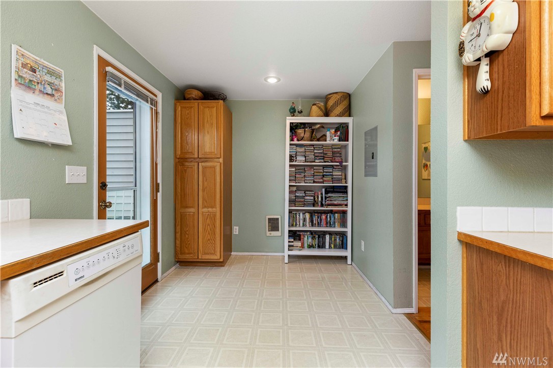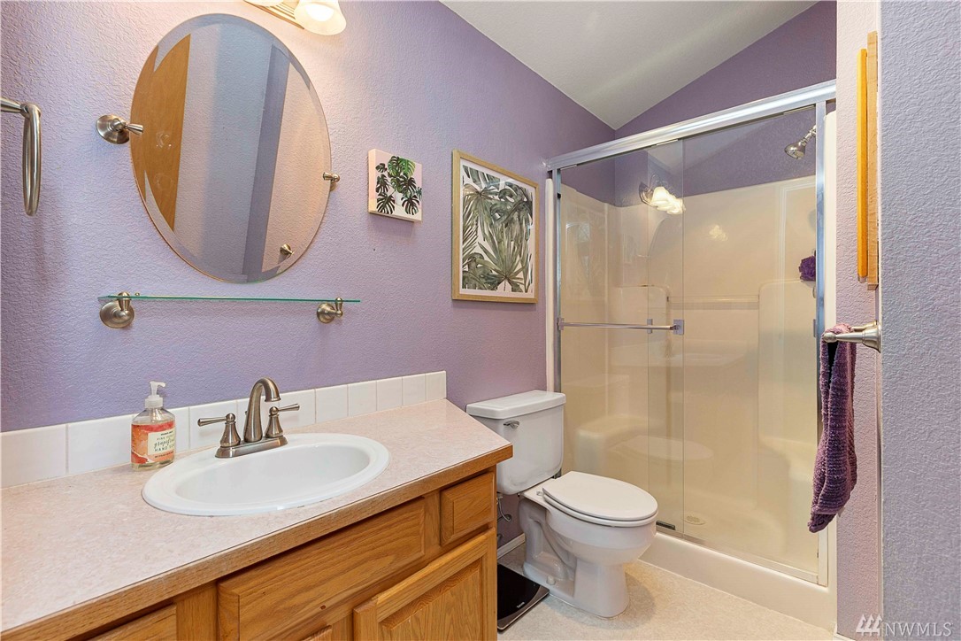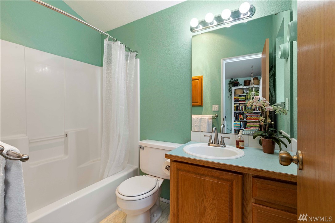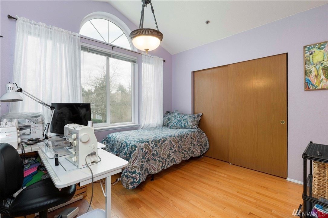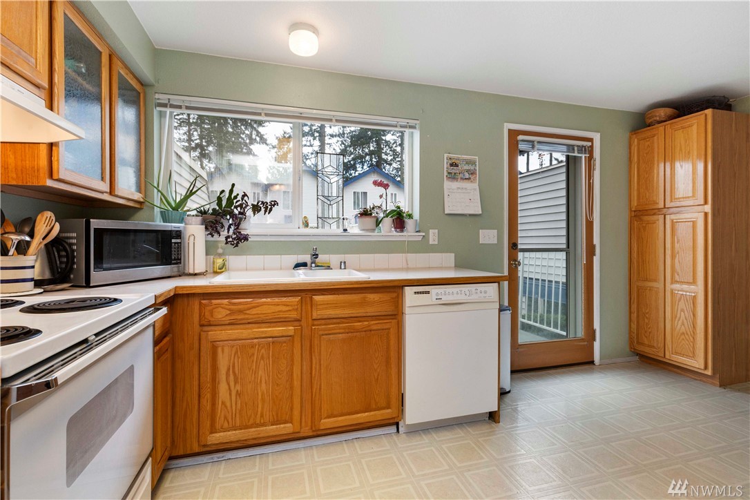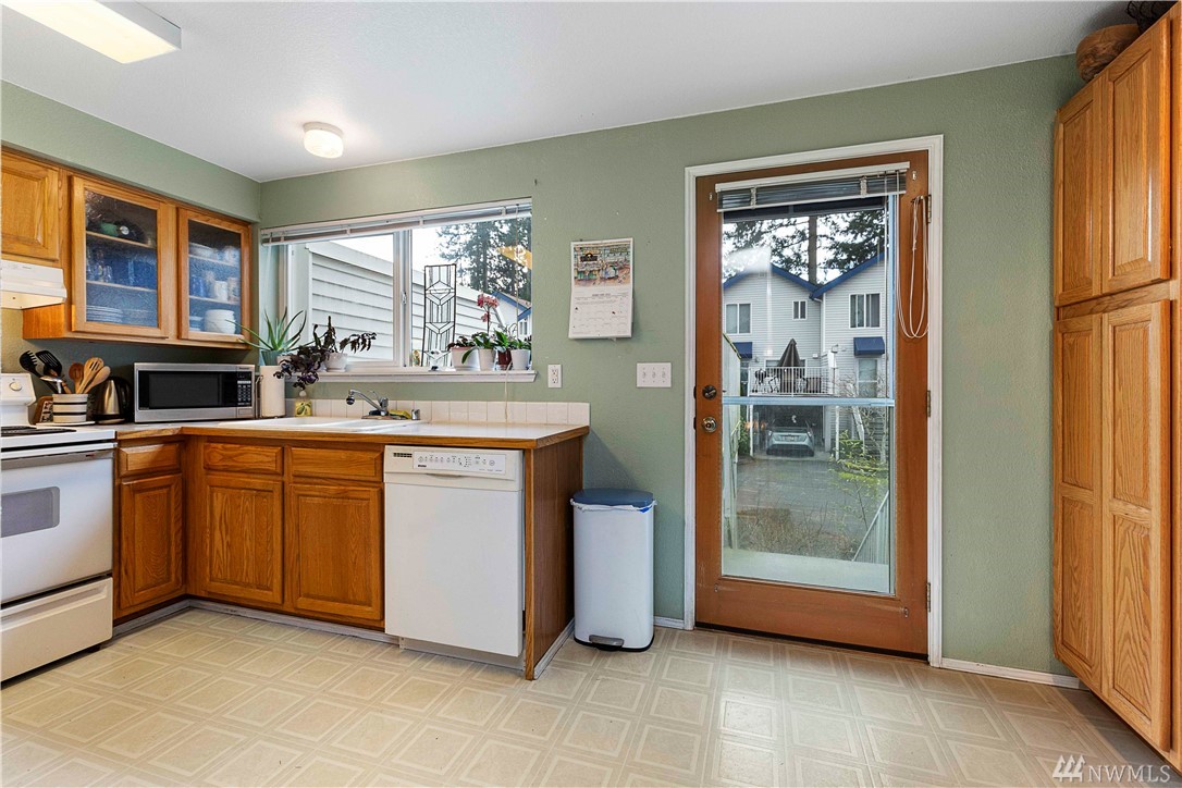 Terrific location & desirable community. Perfect layout; entry level living room with high ceilings, gas fireplace and large windows. Good sized kitchen with extra nook, separate dining, hardwoods & powder room. Upstairs offers 2 Bdrms both with en-suites, vaulted ceilings, master walk-in & laundry. Generous deck - great for entertaining. Close to shopping, restaurants, I-5, 405, Paine Field. Covered parking. An inviting, quiet home. Perfect for years to come. Great price, don't miss this home!!