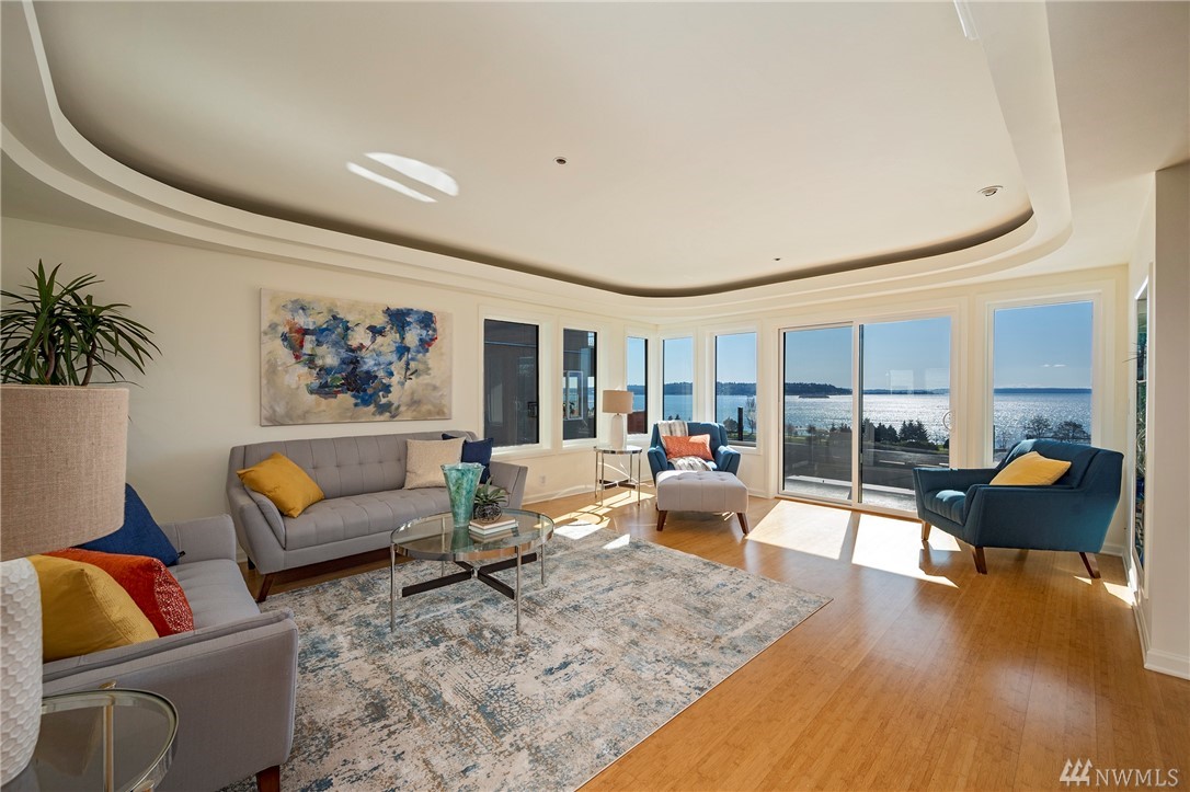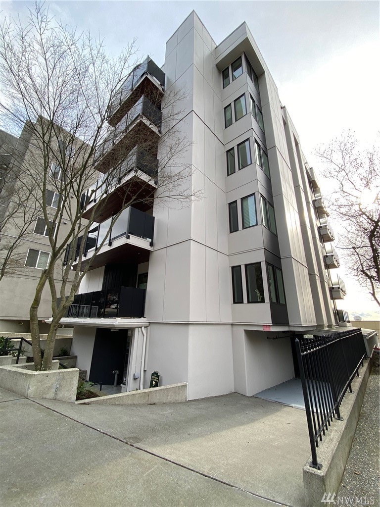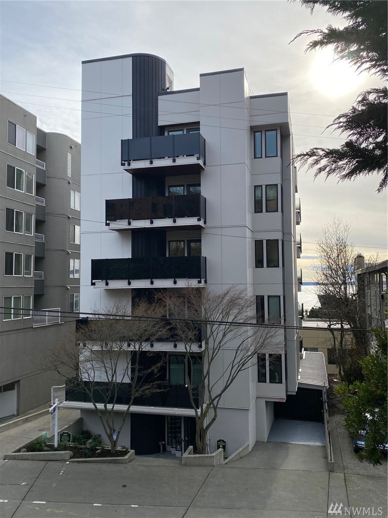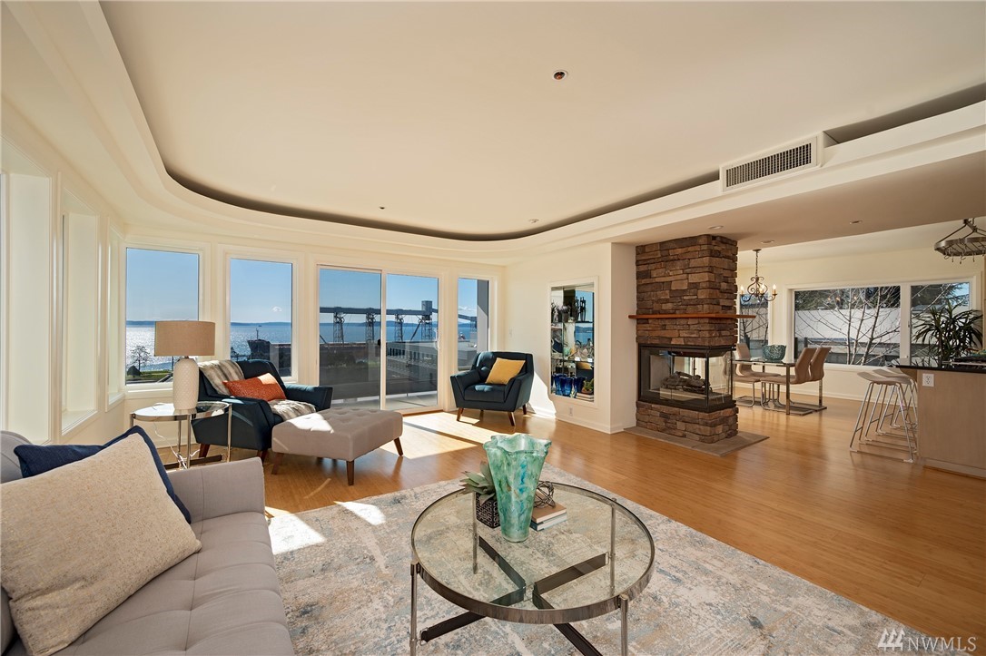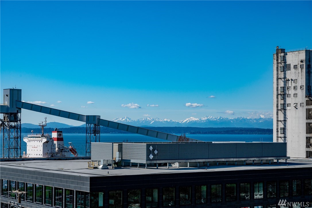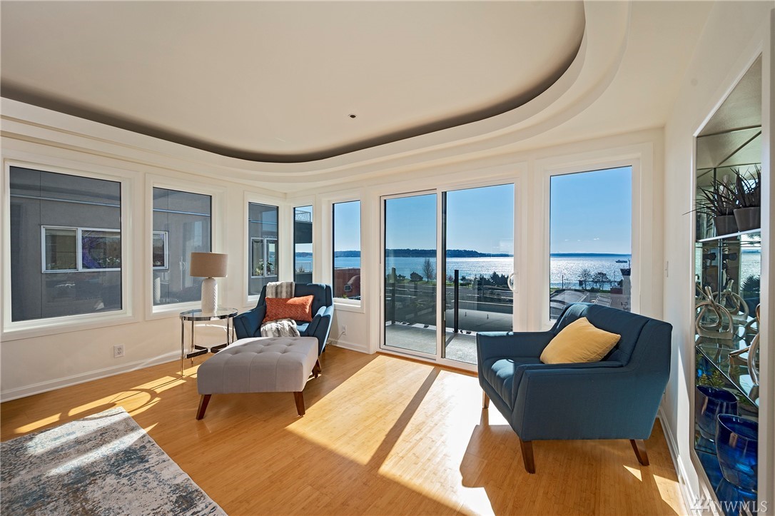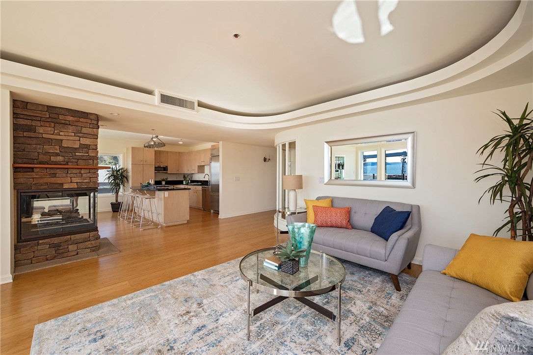 Distinctive full-floor 4th floor condo with protected Elliott Bay, Puget Sound & mountain views. Feels like a single family residence with elevator entrance direct to your unit. Wide open floor plan has 2 bedrooms, 2 baths, den/office, updated kitchen with stainless appliances & quartz counters. Master suite has views, walk-in closet, jetted spa tub & glass shower. Large decks on two sides & 2 car secure garage parking. Boutique building is a short walk to shops, restaurants & the waterfront.