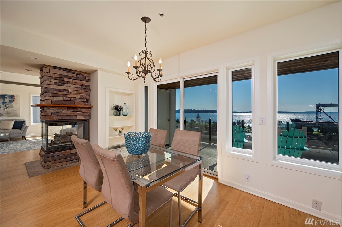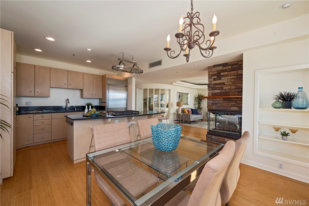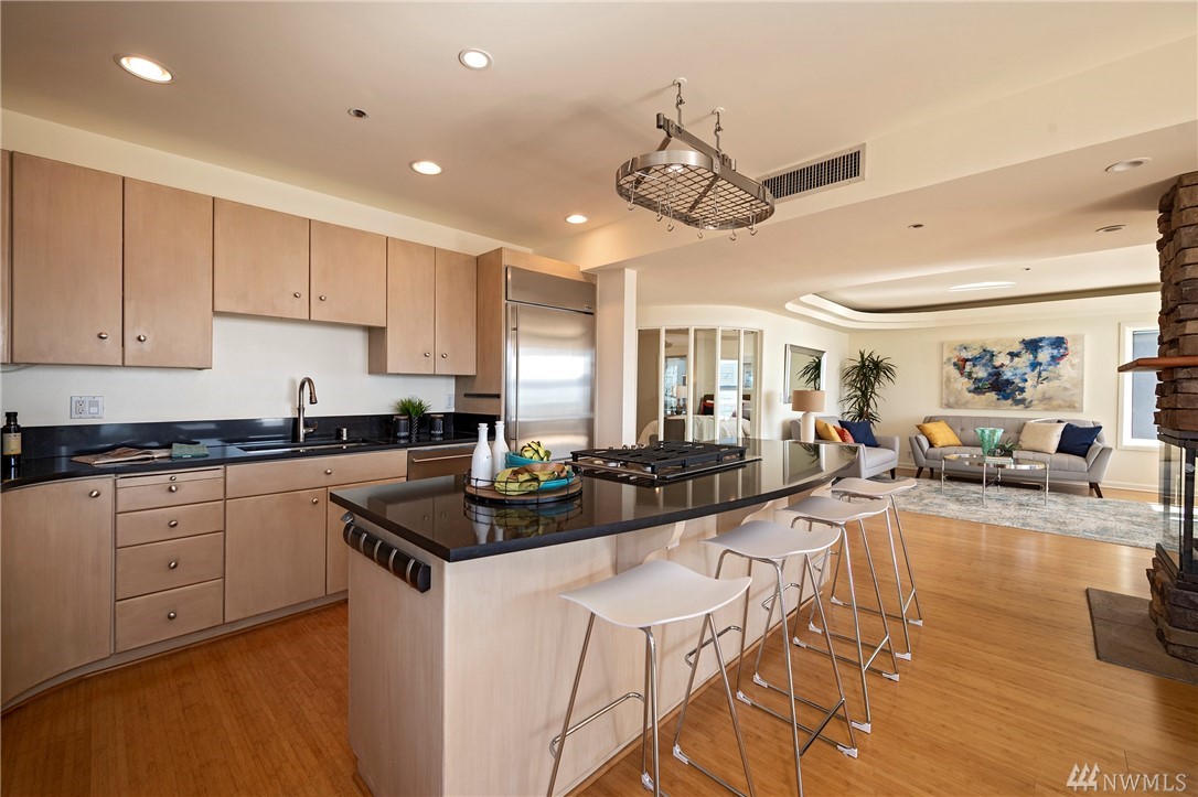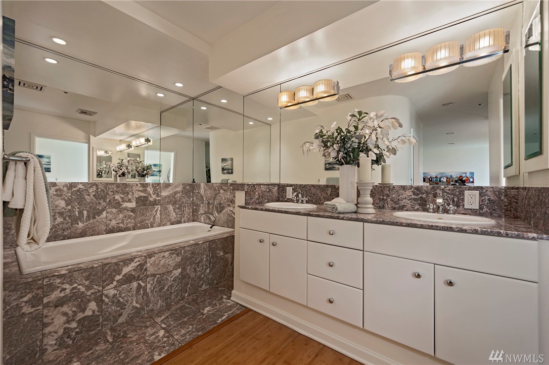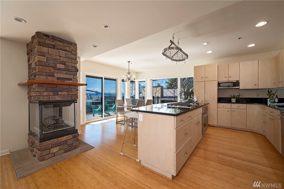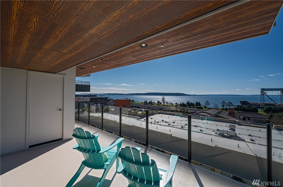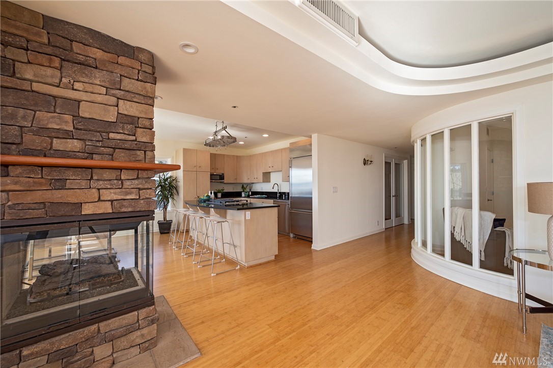 Distinctive full-floor 4th floor condo with protected Elliott Bay, Puget Sound & mountain views. Feels like a single family residence with elevator entrance direct to your unit. Wide open floor plan has 2 bedrooms, 2 baths, den/office, updated kitchen with stainless appliances & quartz counters. Master suite has views, walk-in closet, jetted spa tub & glass shower. Large decks on two sides & 2 car secure garage parking. Boutique building is a short walk to shops, restaurants & the waterfront.