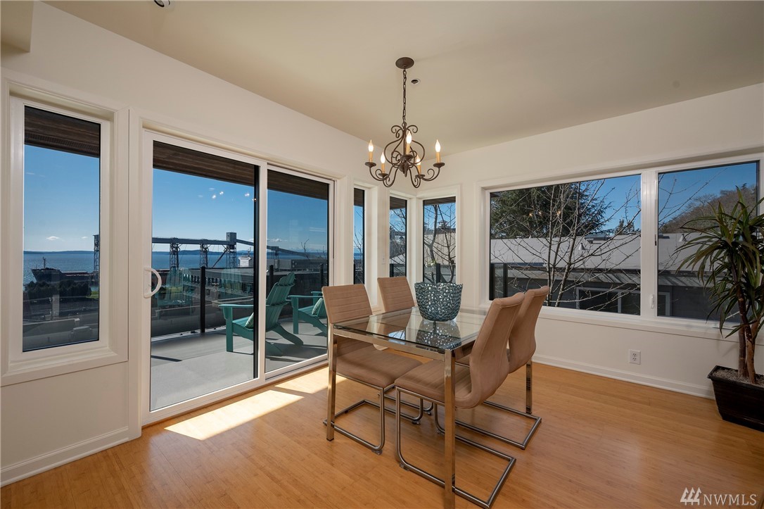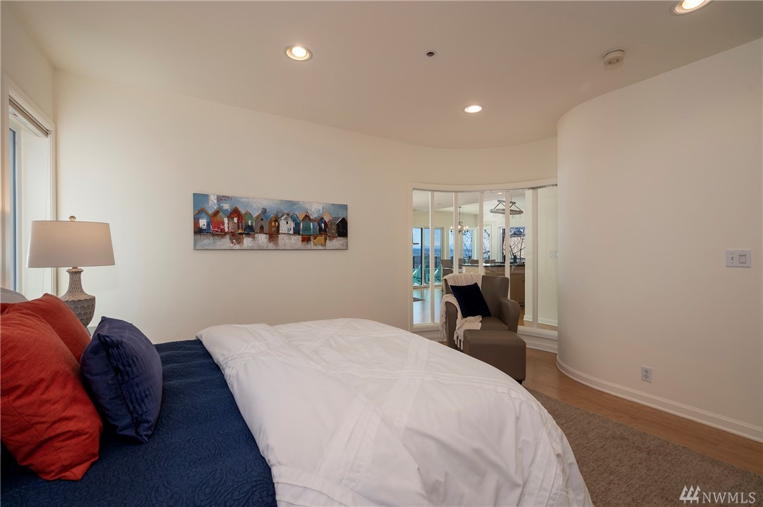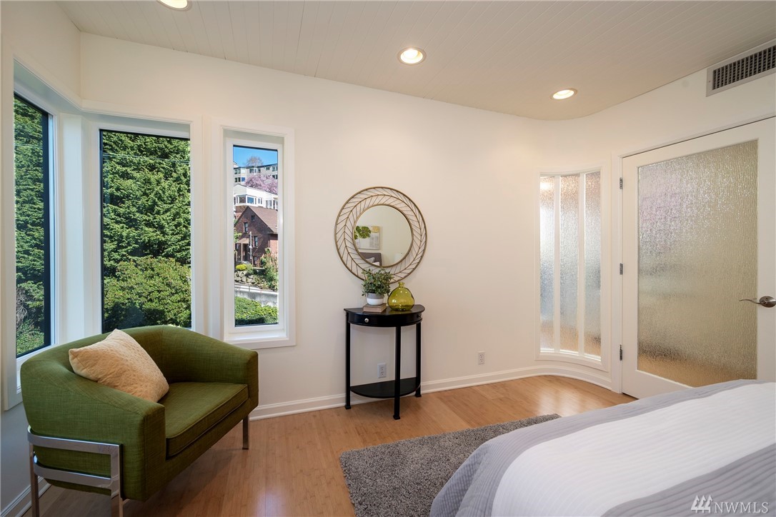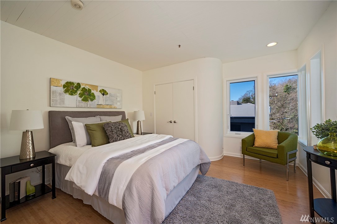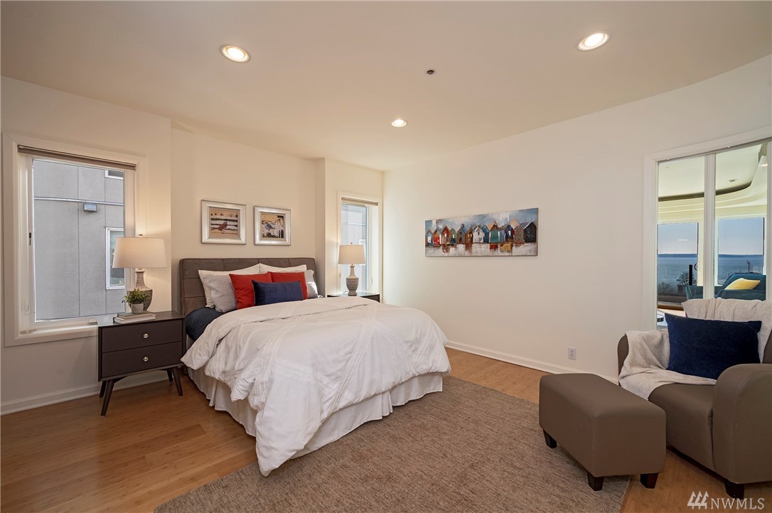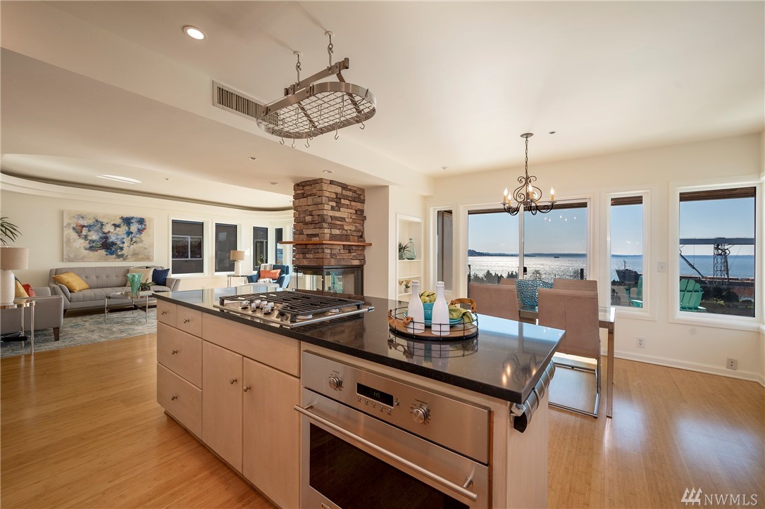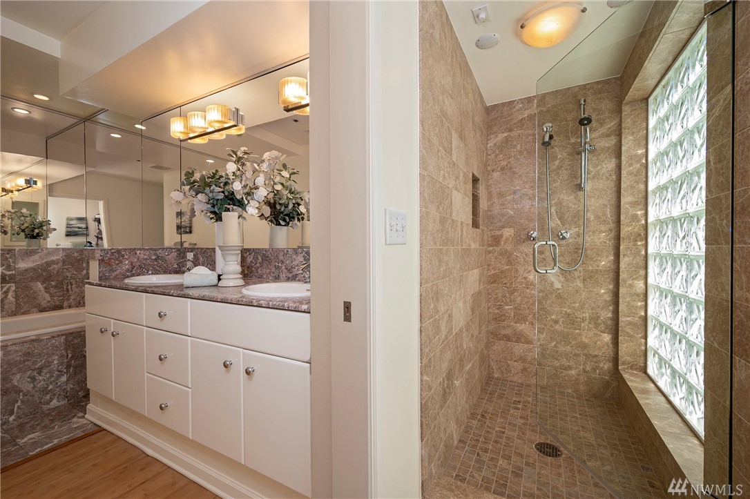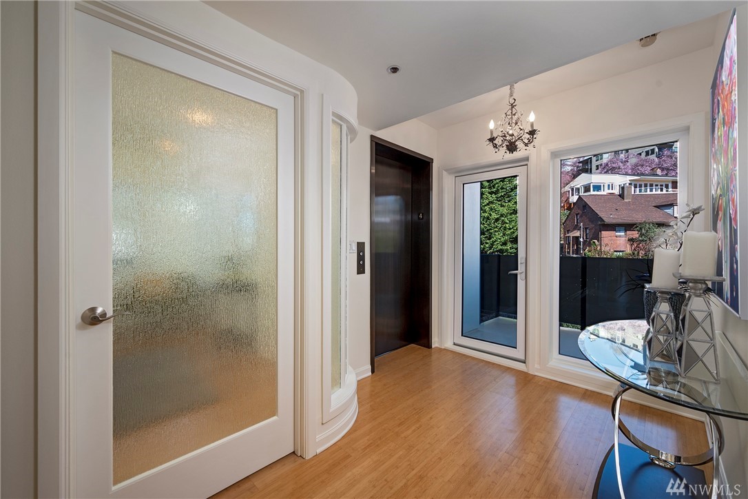 Distinctive full-floor 4th floor condo with protected Elliott Bay, Puget Sound & mountain views. Feels like a single family residence with elevator entrance direct to your unit. Wide open floor plan has 2 bedrooms, 2 baths, den/office, updated kitchen with stainless appliances & quartz counters. Master suite has views, walk-in closet, jetted spa tub & glass shower. Large decks on two sides & 2 car secure garage parking. Boutique building is a short walk to shops, restaurants & the waterfront.