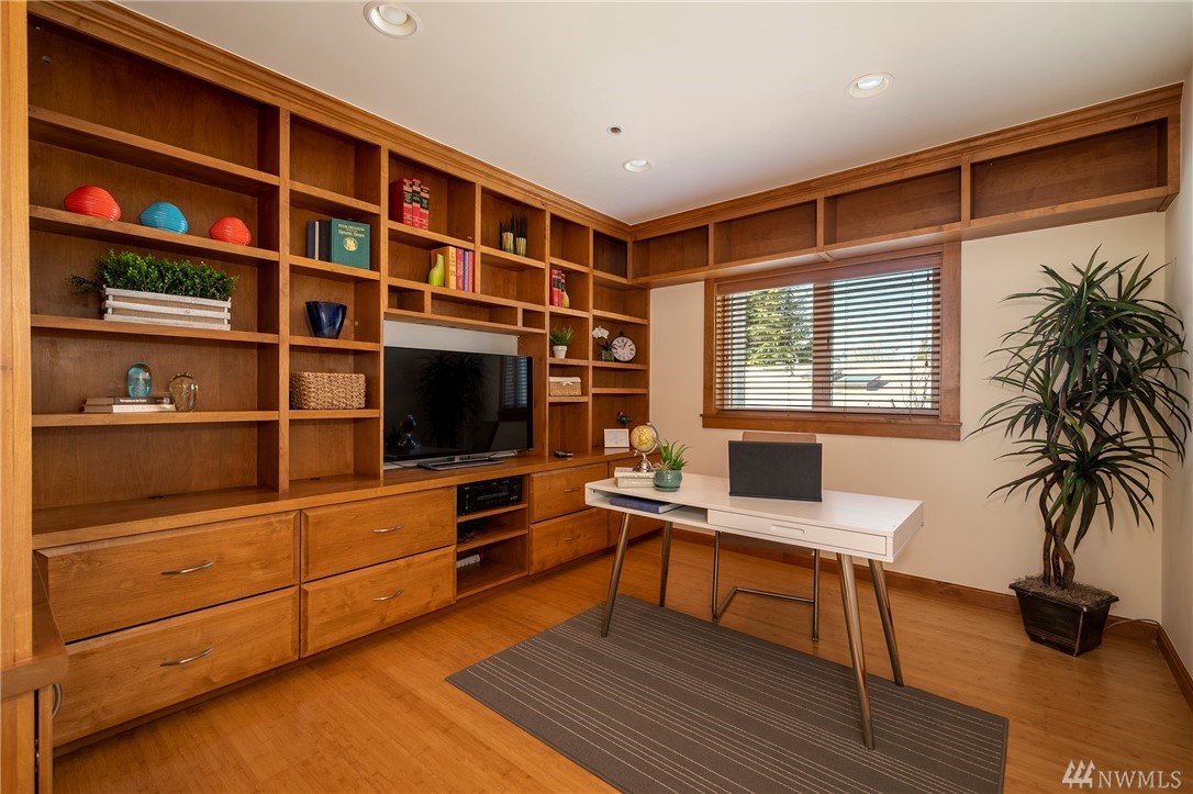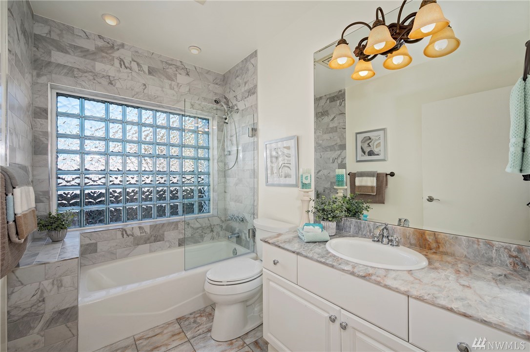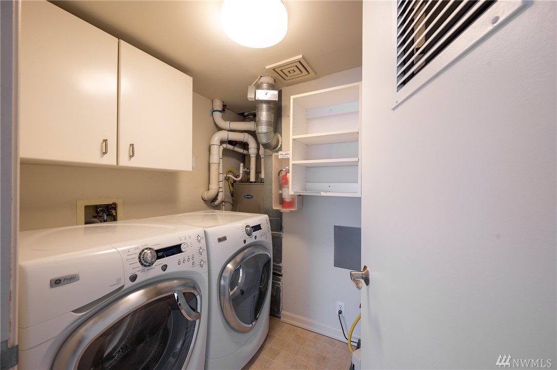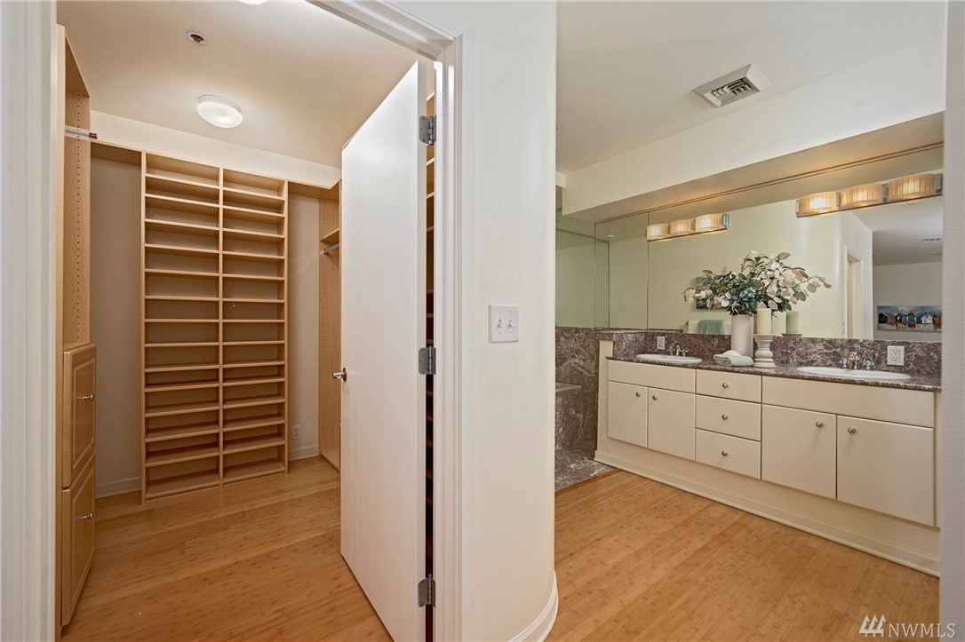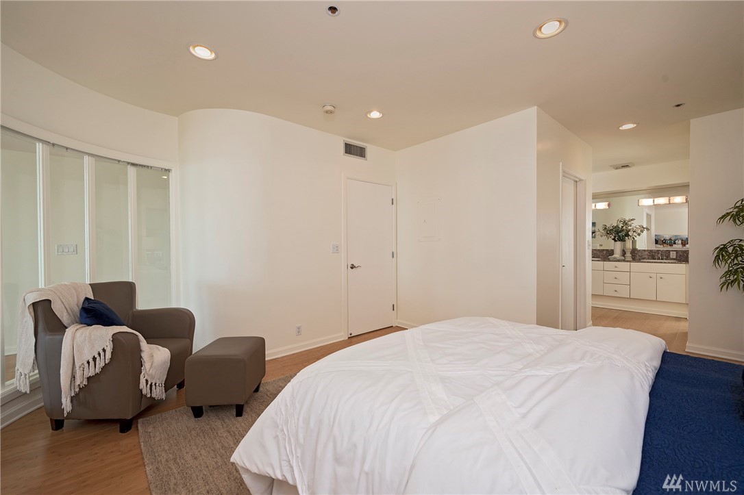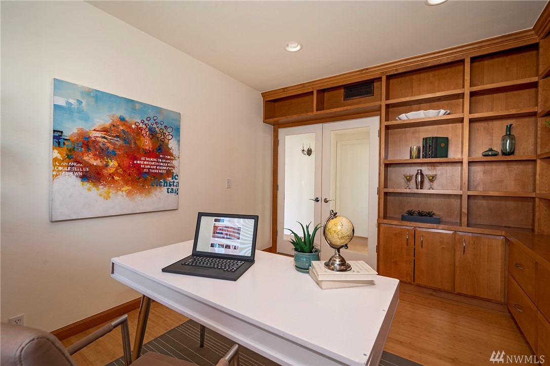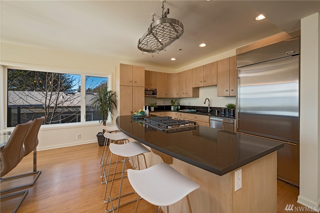 Distinctive full-floor 4th floor condo with protected Elliott Bay, Puget Sound & mountain views. Feels like a single family residence with elevator entrance direct to your unit. Wide open floor plan has 2 bedrooms, 2 baths, den/office, updated kitchen with stainless appliances & quartz counters. Master suite has views, walk-in closet, jetted spa tub & glass shower. Large decks on two sides & 2 car secure garage parking. Boutique building is a short walk to shops, restaurants & the waterfront.