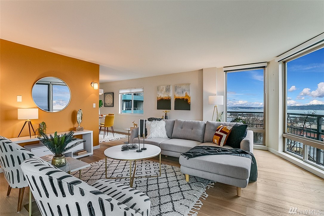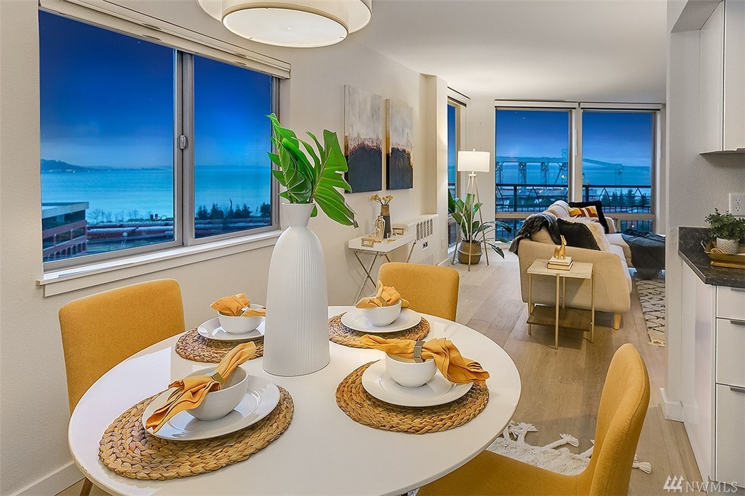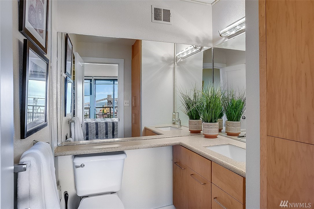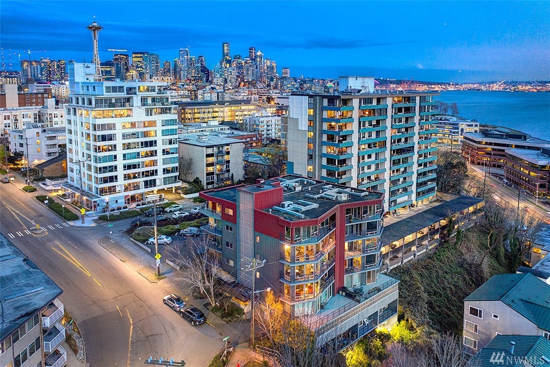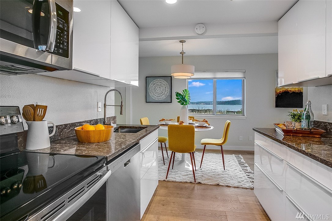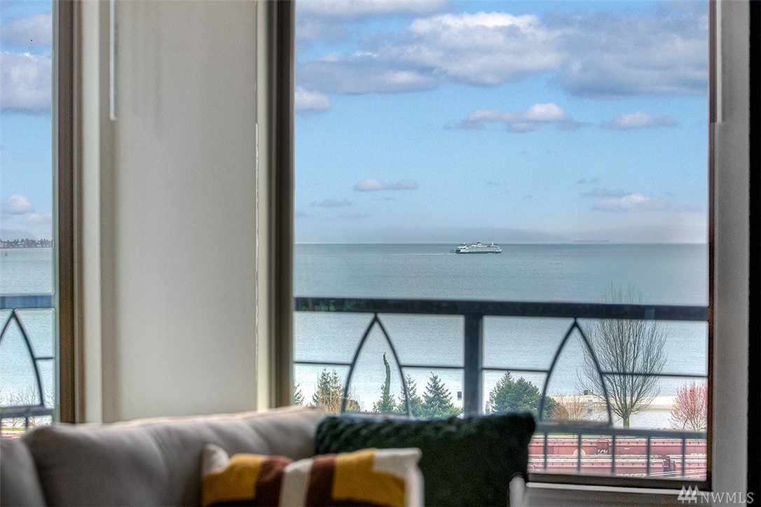 Style, space & stunning Sound views from this light-filled remodeled Queen Anne flat. Amazing private deck, beautiful wide-plank floors and mod kitchen featuring glossy cabinetry, stainless appl & quartz counters. The cool mid-century vibe is carried into the master & guest suites with custom-crafted wood & glass closet doors. Imagine relaxing sunsets as ships sail in and out of the bay. Quiet pet-friendly bldg w/exercise rm & underground prkg. Near Expedia, SLU, Seattle Ctr, shops & nightlife.