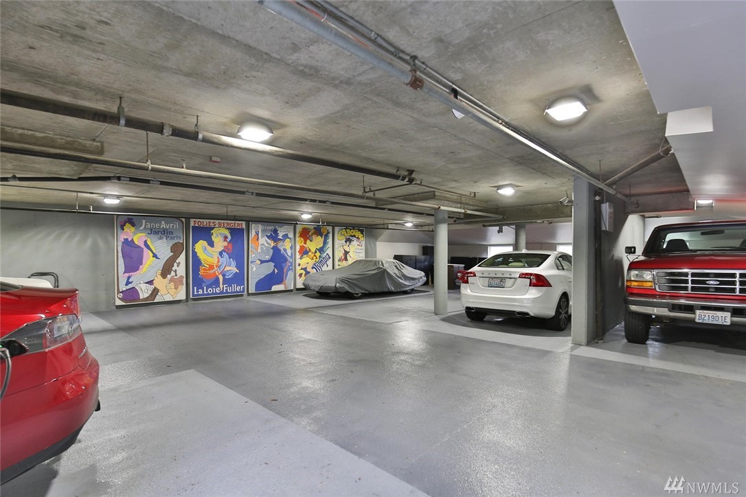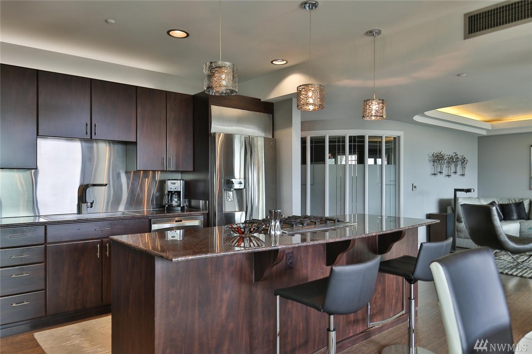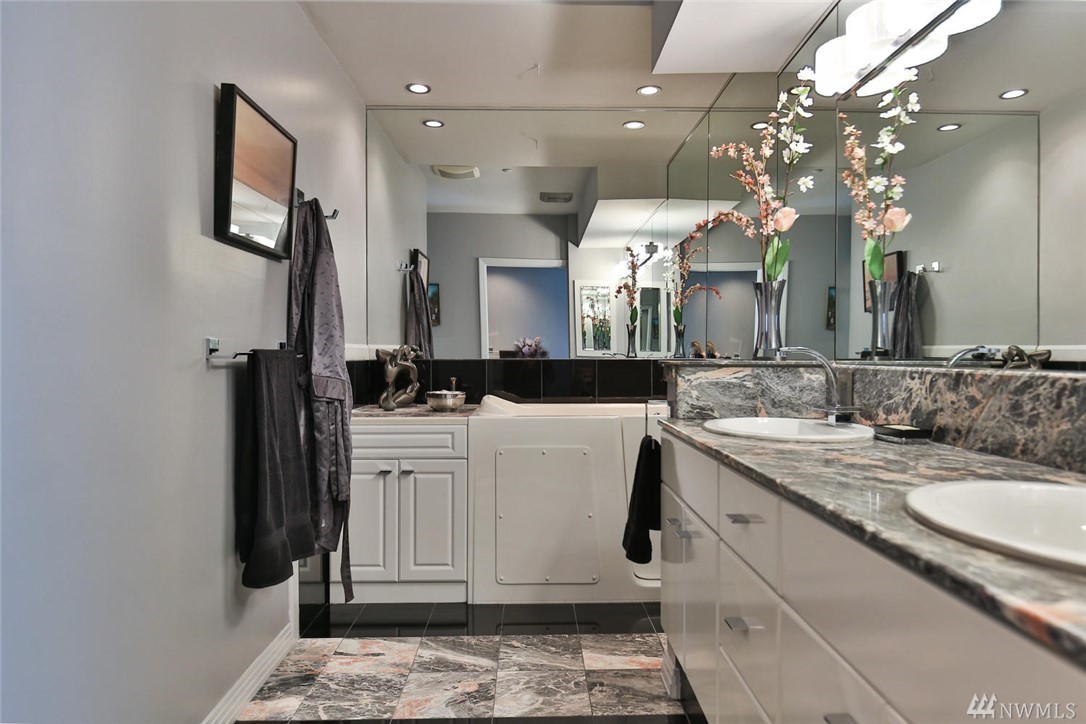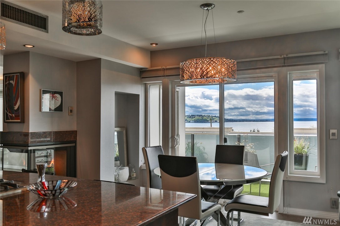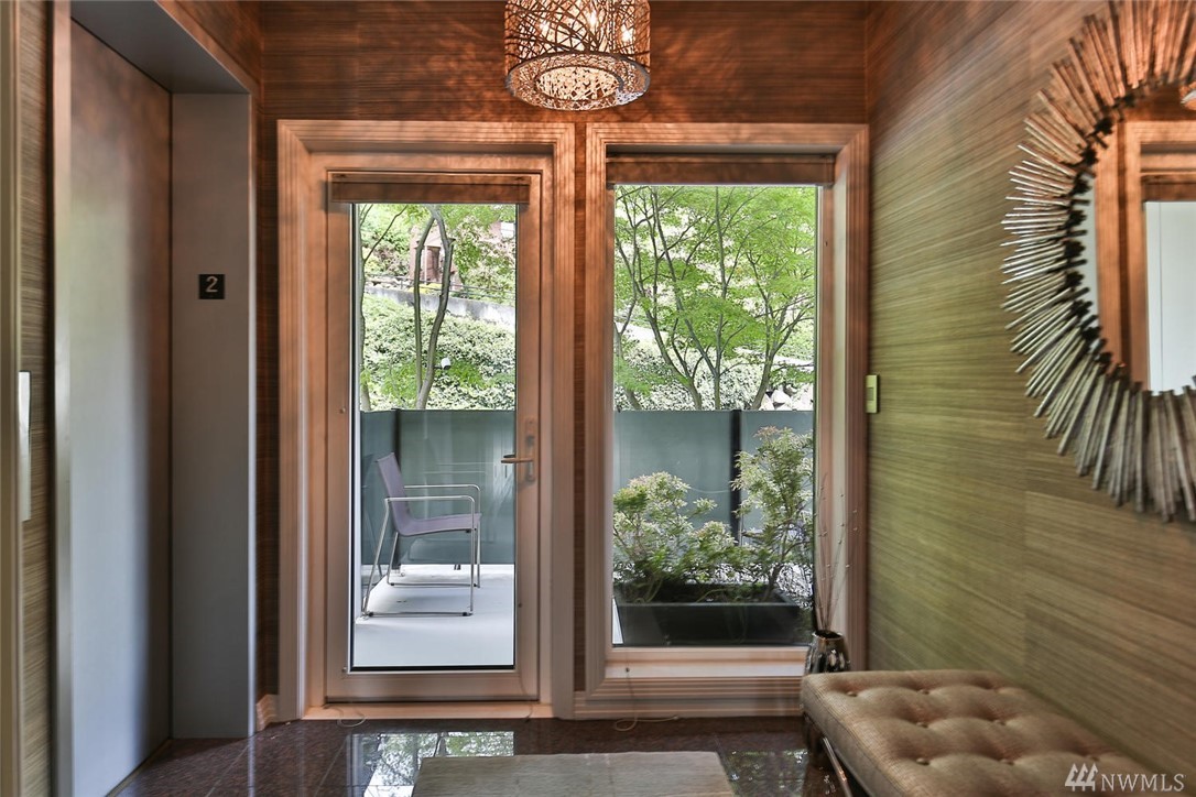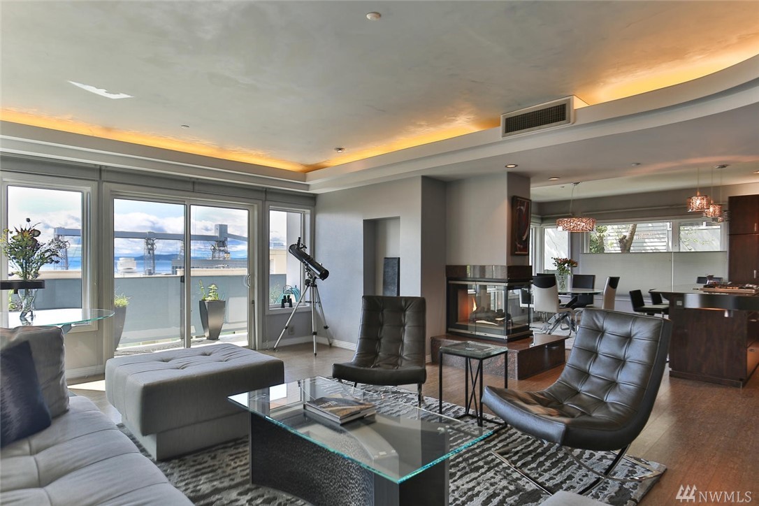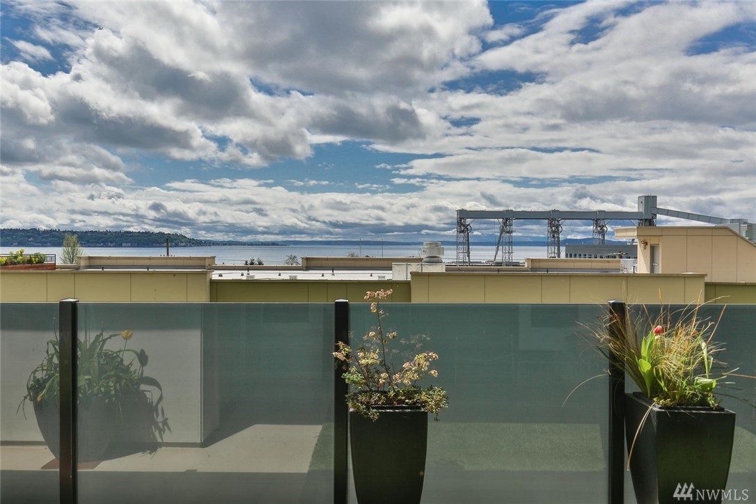 Enjoy expansive Sound, mountain, W. Sea. views in a spacious, light-filled, single-level home. Elevator opens into elegant granite-tiled entry. Open floorplan features beautifully remodeled kitchen w/new appl, lighting, & chic stainless backsplash. Master suite features WIC and spacious master bath w/recent upgrades. New hardwoods, carpet, tile, windows w/soundproofing, blinds, W/D, furnace, water tank & A/C. Own the whole floor incl 2 private decks and secure garage parking wired for your EV.