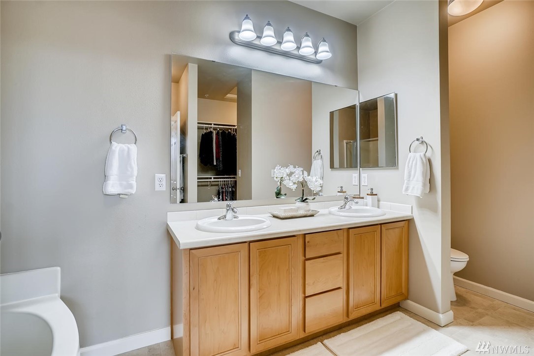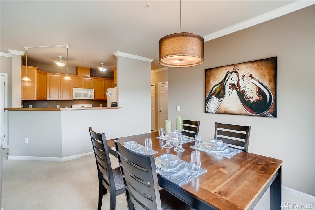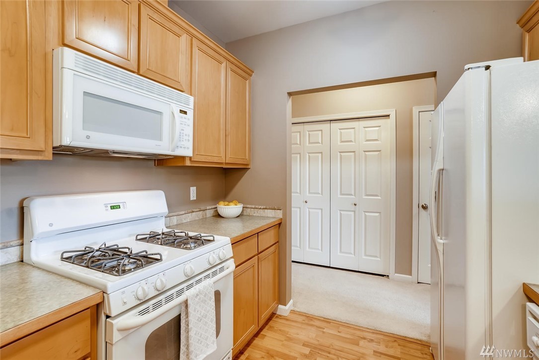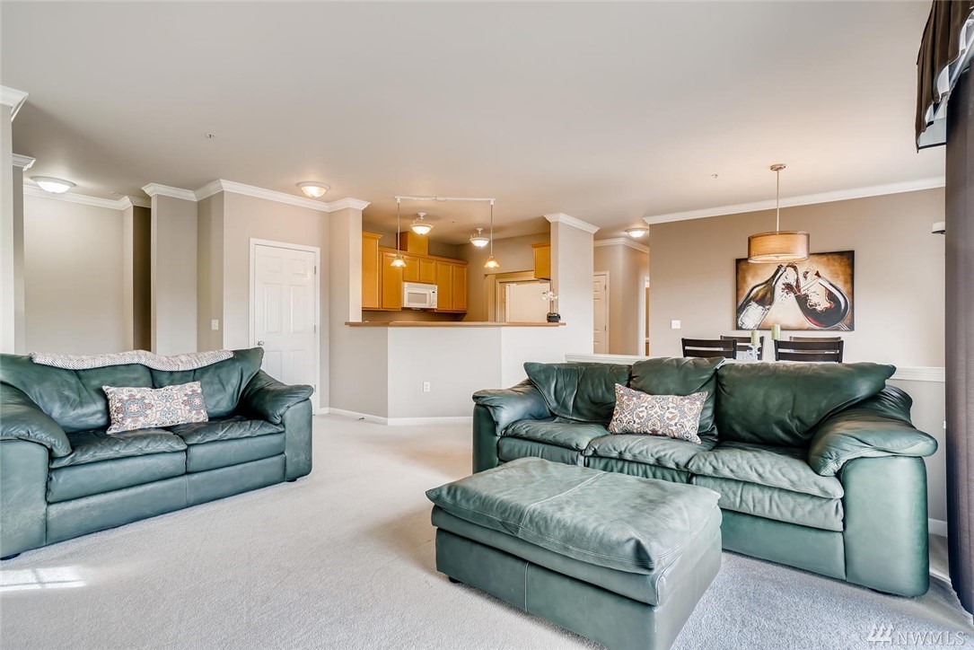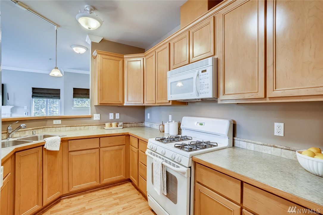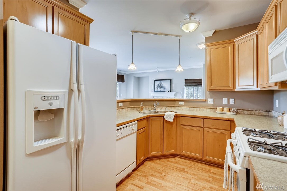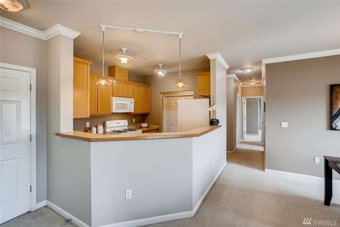 Beautiful, well maintained 2B/2b top floor end unit. Obvious pride of ownership throughout! Terrific open floorplan for exceptional entertaining. Living space boasts crown molding & gas fireplace heating. Pantry, gas R/O, 6 panel doors, WIC, soaking tub. View deck off LR. All window coverings/applcs stay! Pool/clubhouse/gym, etc. available/not in price. Gated entry for additional security. 1 car att’d garage. Just inspected! Exceptional commuting location w/easy access to SeaTac Int’l, 167 & I-5
