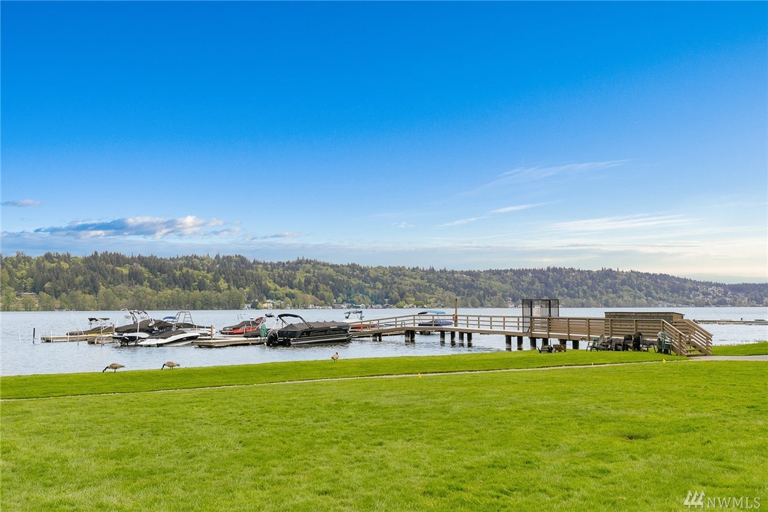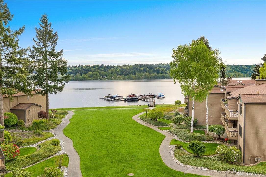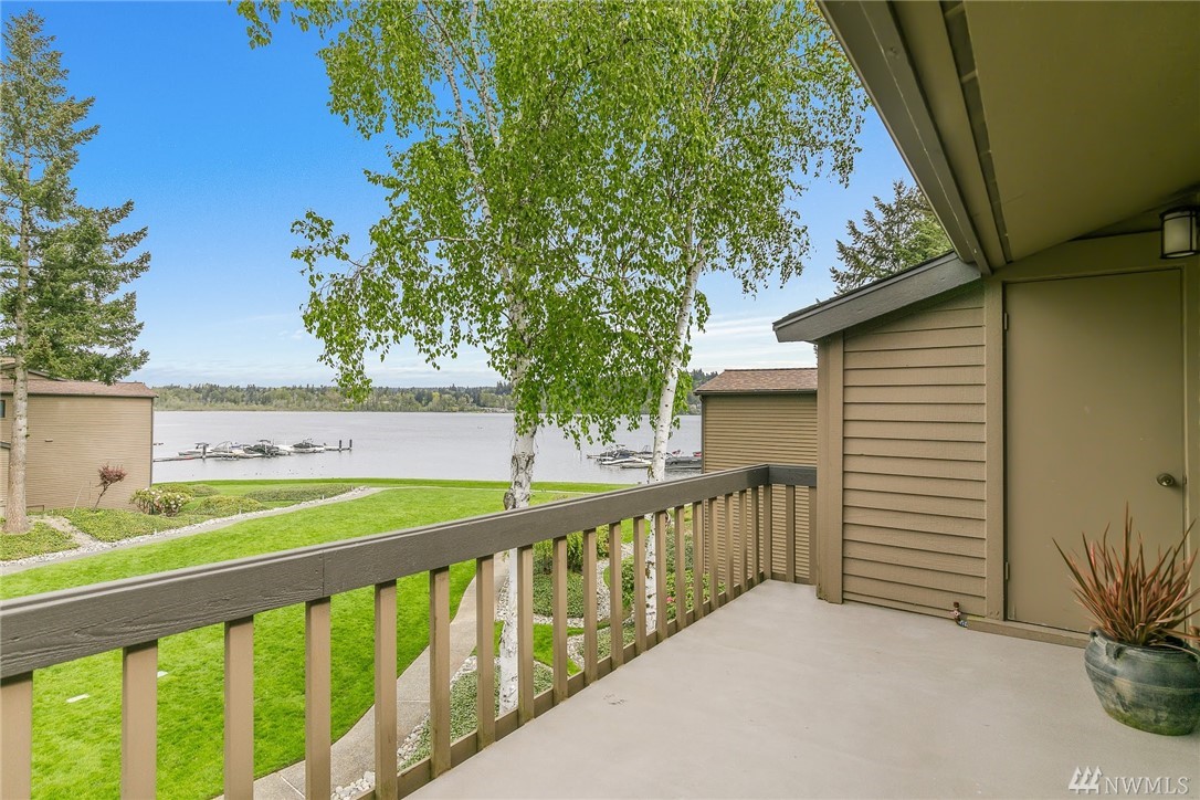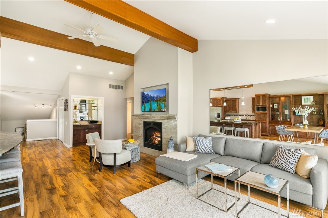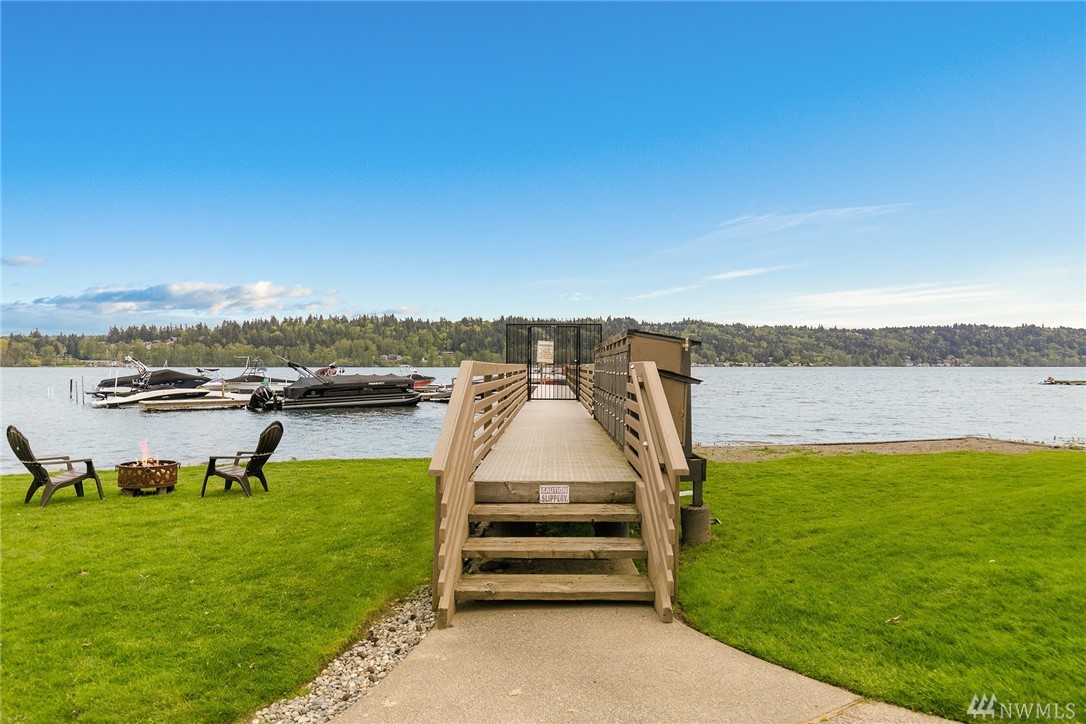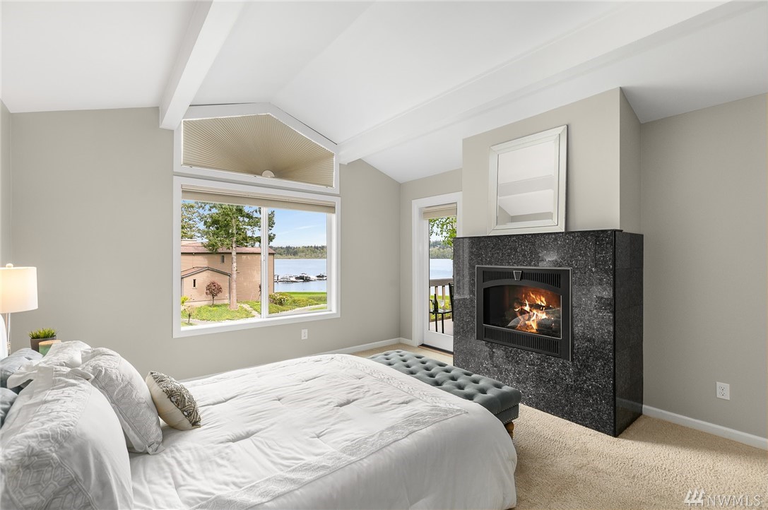 LAKE VIEWS w/private access; REMODELED, top floor Condo at Lake Villas. One-level living; high ceilings. Top quality, open layout. Chef's kitchen w/island of stunning Labradorite granite, custom cabinets, newer appliances. 2 gas fireplaces. Master suite-view, bath, fireplace, walk-in closet; Guest room/office has quality Murphy bed built-in for dual purpose use. View deck-natural gas & H2O. Extra sound proofing. Lots of storage. Covered parking. Includes dock, pool, sauna, spa, & more. Gated.