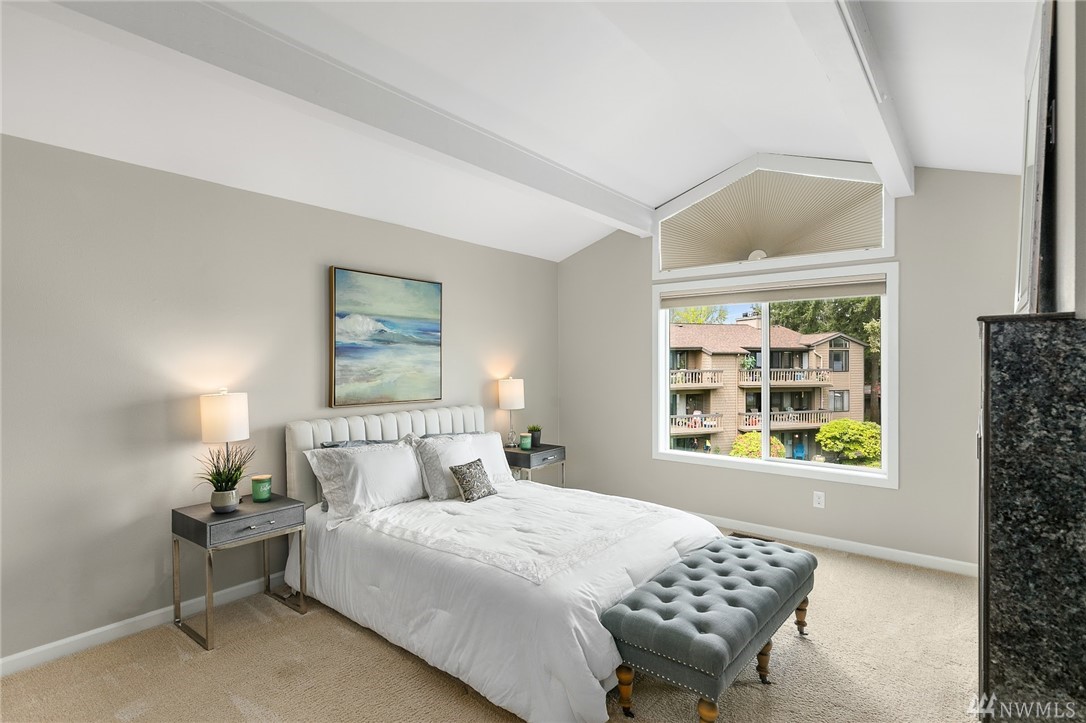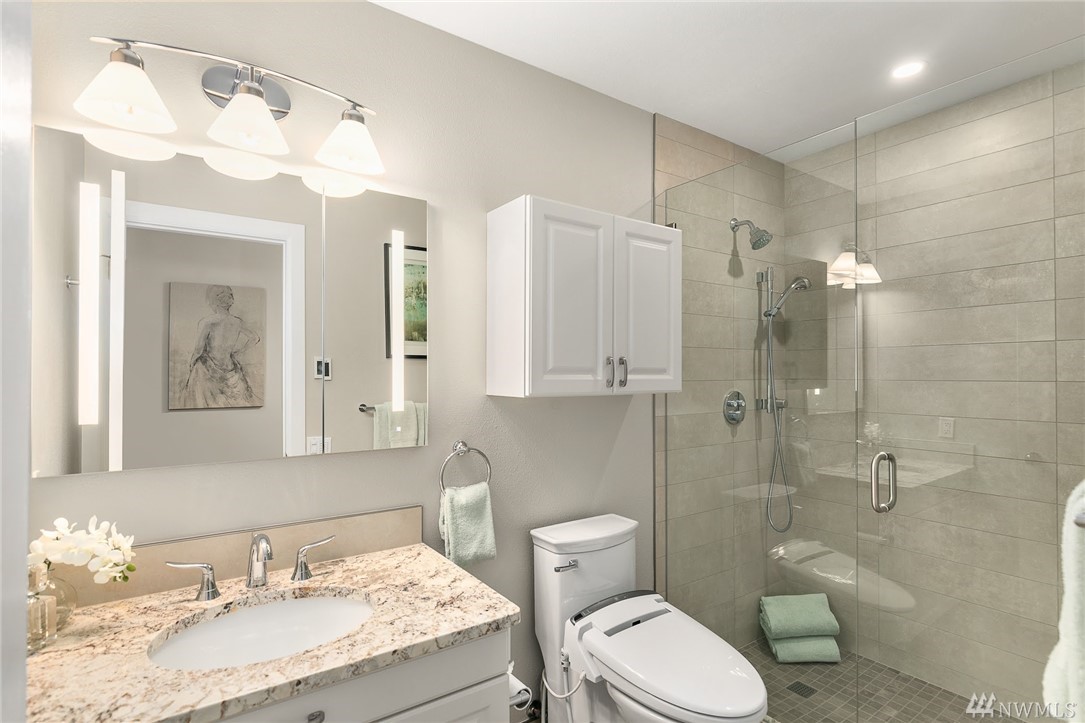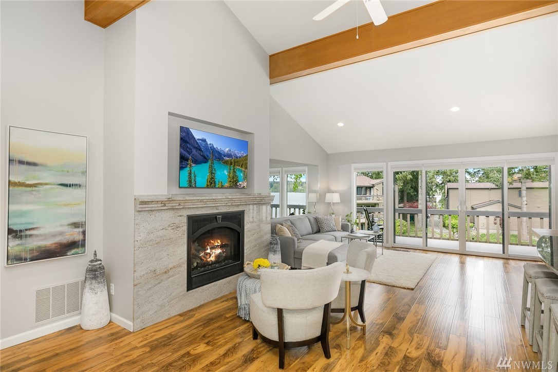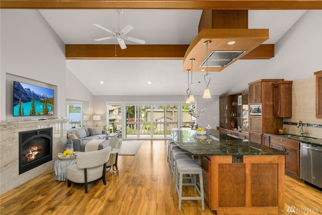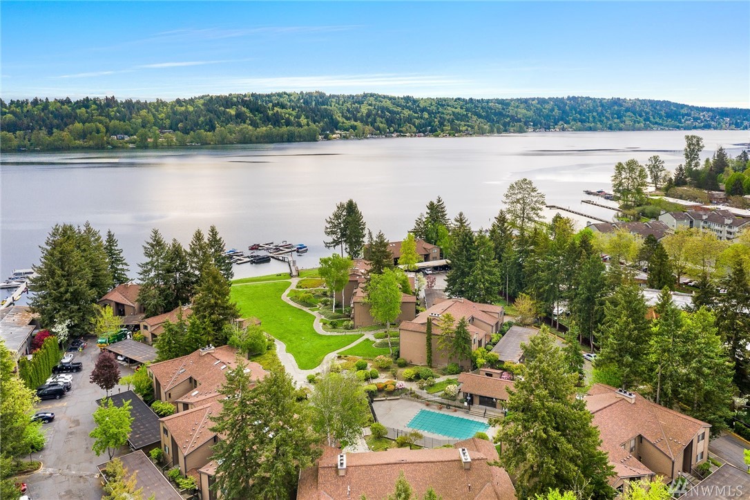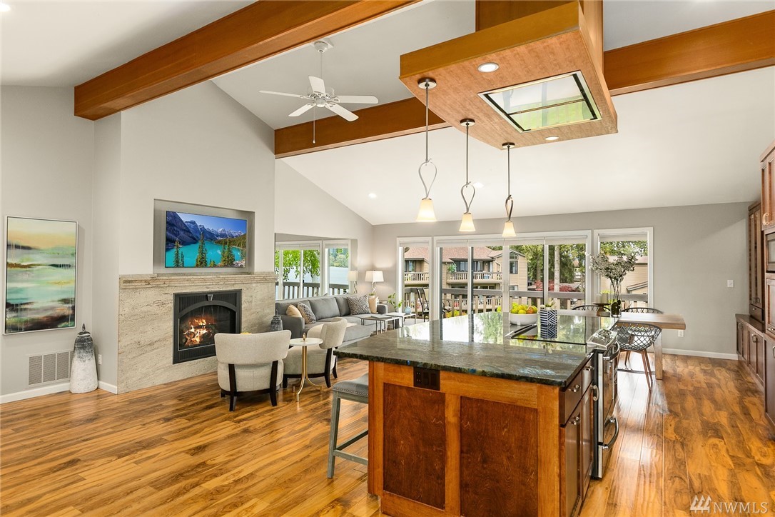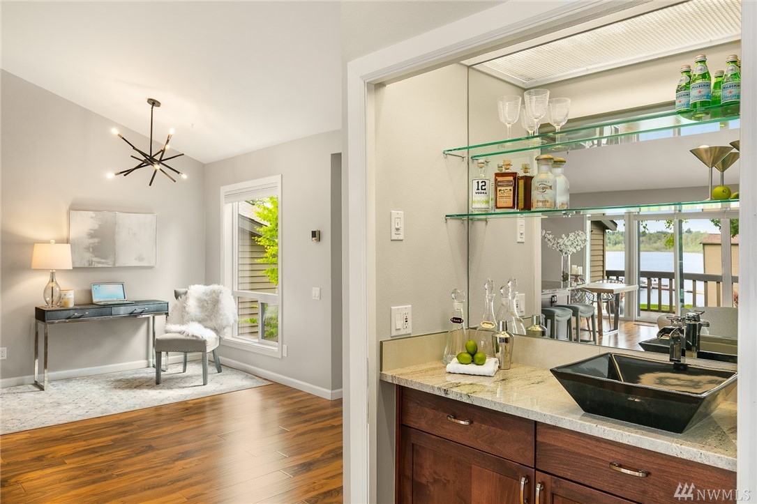 LAKE VIEWS w/private access; REMODELED, top floor Condo at Lake Villas. One-level living; high ceilings. Top quality, open layout. Chef's kitchen w/island of stunning Labradorite granite, custom cabinets, newer appliances. 2 gas fireplaces. Master suite-view, bath, fireplace, walk-in closet; Guest room/office has quality Murphy bed built-in for dual purpose use. View deck-natural gas & H2O. Extra sound proofing. Lots of storage. Covered parking. Includes dock, pool, sauna, spa, & more. Gated.