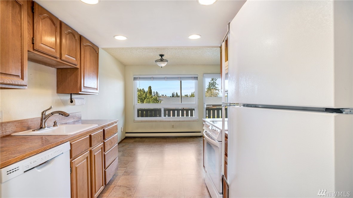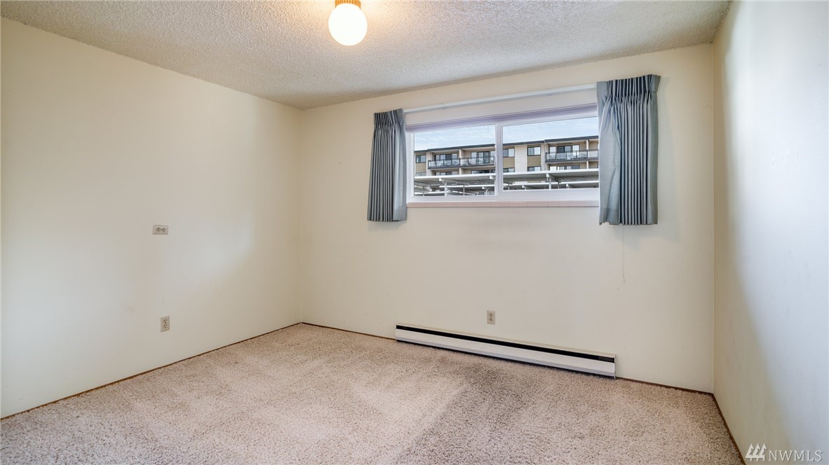 Desirable Edmond's Bowl location. This entry level 2nd floor condo features two bedrooms & 1 bath. Plenty of natural light shines into the living and dining room. Sit on your private balcony, enjoy the beautiful sunsets and views of the Puget Sound. Other highlights include new windows and slider, washer and dryer in unit, 1 covered parking spot and private storage locker. Minutes to shops and restaurants, waterfront, train & ferry terminal. Well run HOA with low dues, $231 a month.