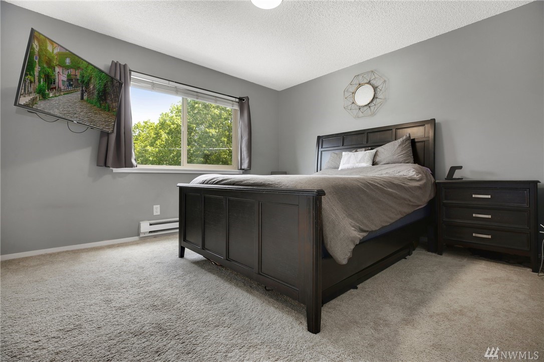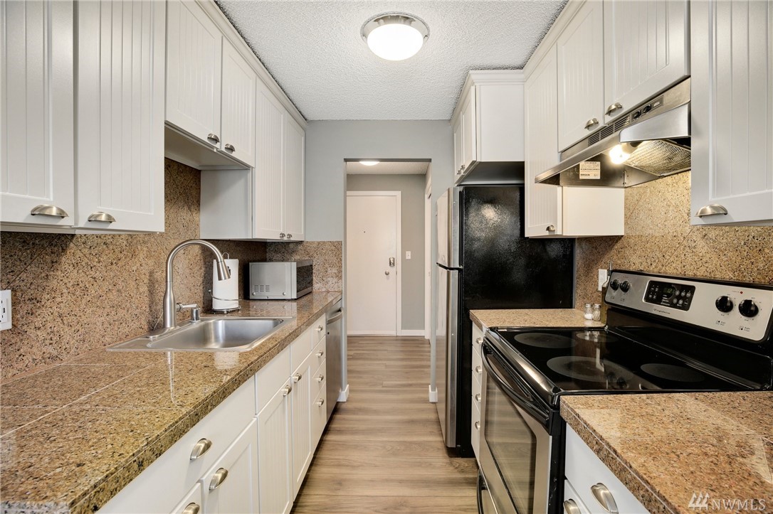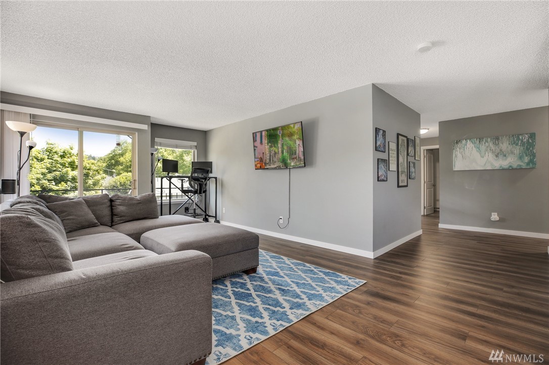Remodeled 2 bedroom condo in fantastic Ballard location! SW facing unit has abundant natural light w/ spacious, open layout. New wood floors, new paint, kitchen w/ SS appliances & granite counters. Balcony & an office nook off of living room. Large bedrooms, master fits king size bed. In-unit laundry room w/full size W/D, folding counter & extra storage. Secure garage parking & xtra storage unit. Strong HOA w/ recent building upgrades. Pet friendly, no rental cap! Close to parks, shops, transit.