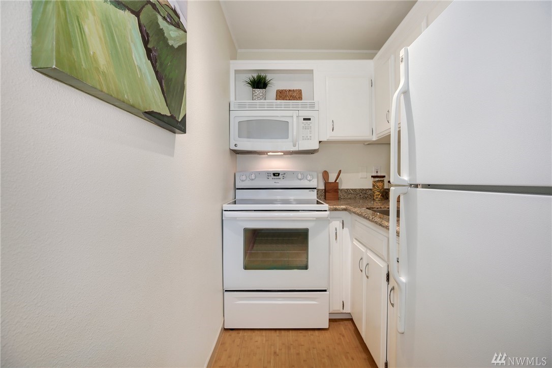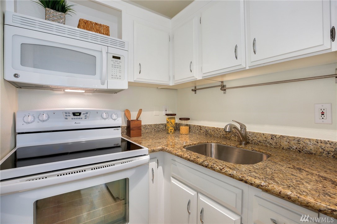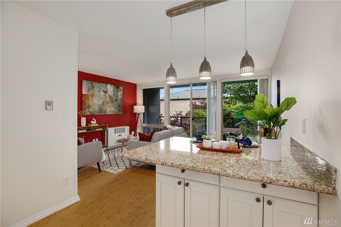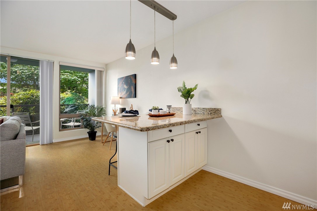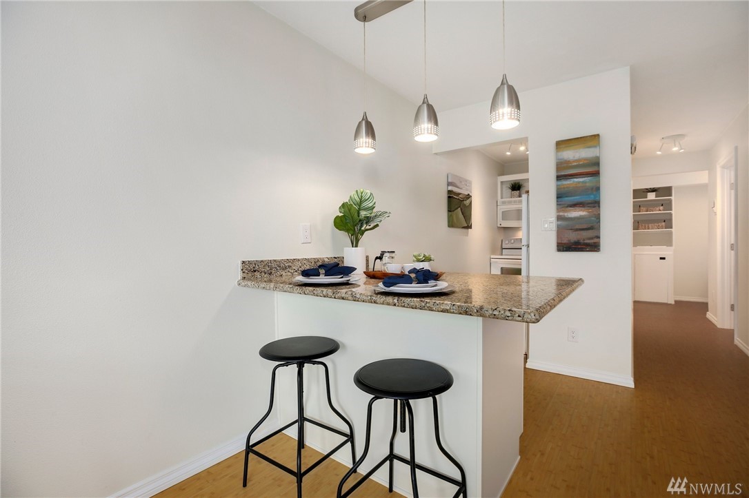 Welcome Home! Light and bright, this west-facing cozy home features include granite countertops, a breakfast bar, full bath, tiled shower, fresh paint, and luxurious vinyl plank flooring. Nice Patio. Covered parking, 2 storage areas. Building with exercise and rec room, elevator and security cameras. HOA dues covers gas heat, water, garbage, recycle, free laundry room. Very pet friendly! including a common garden area! Great location with superior walk score
