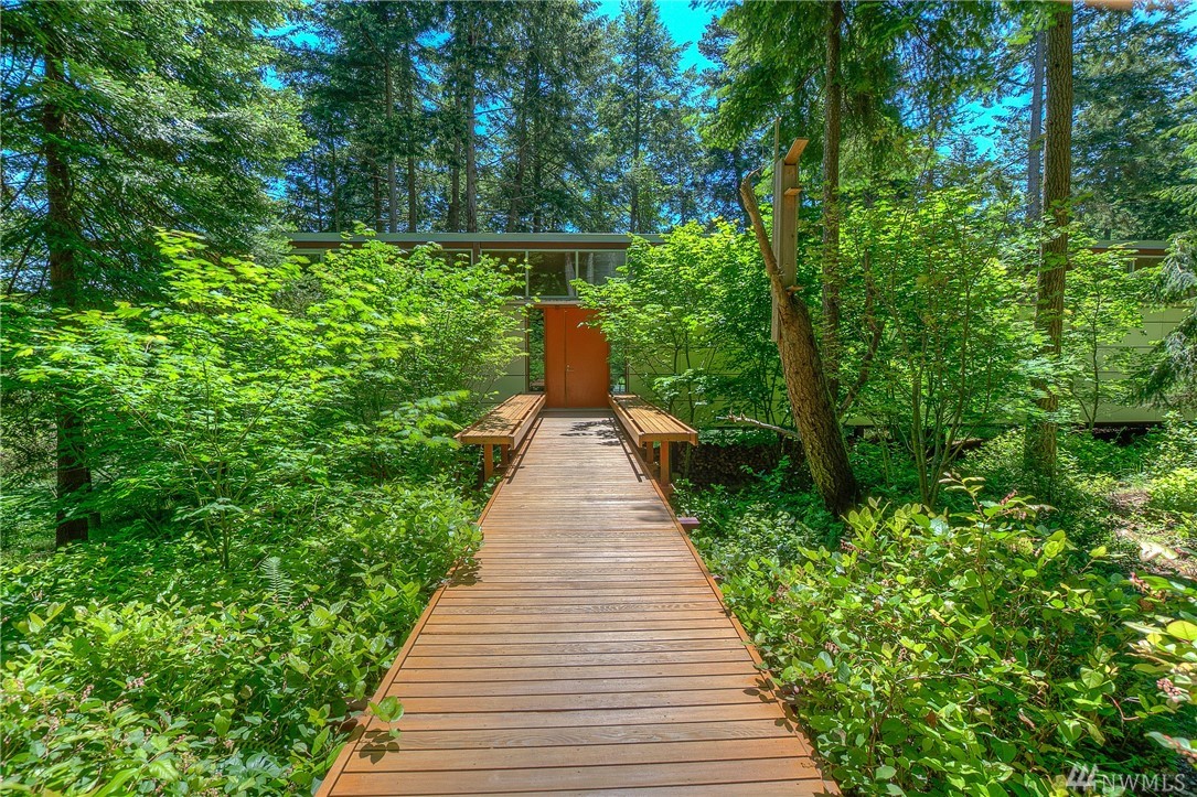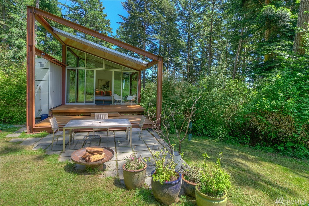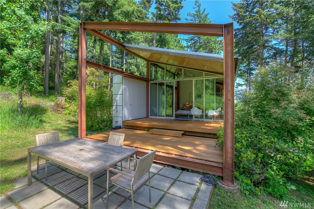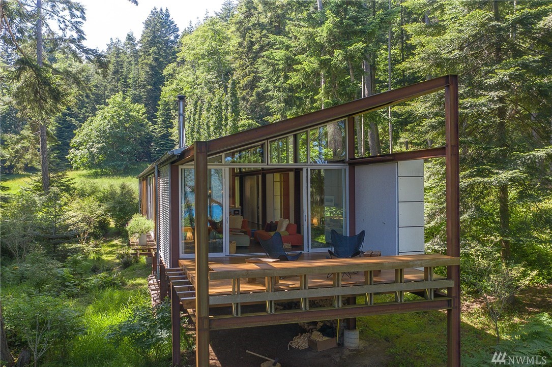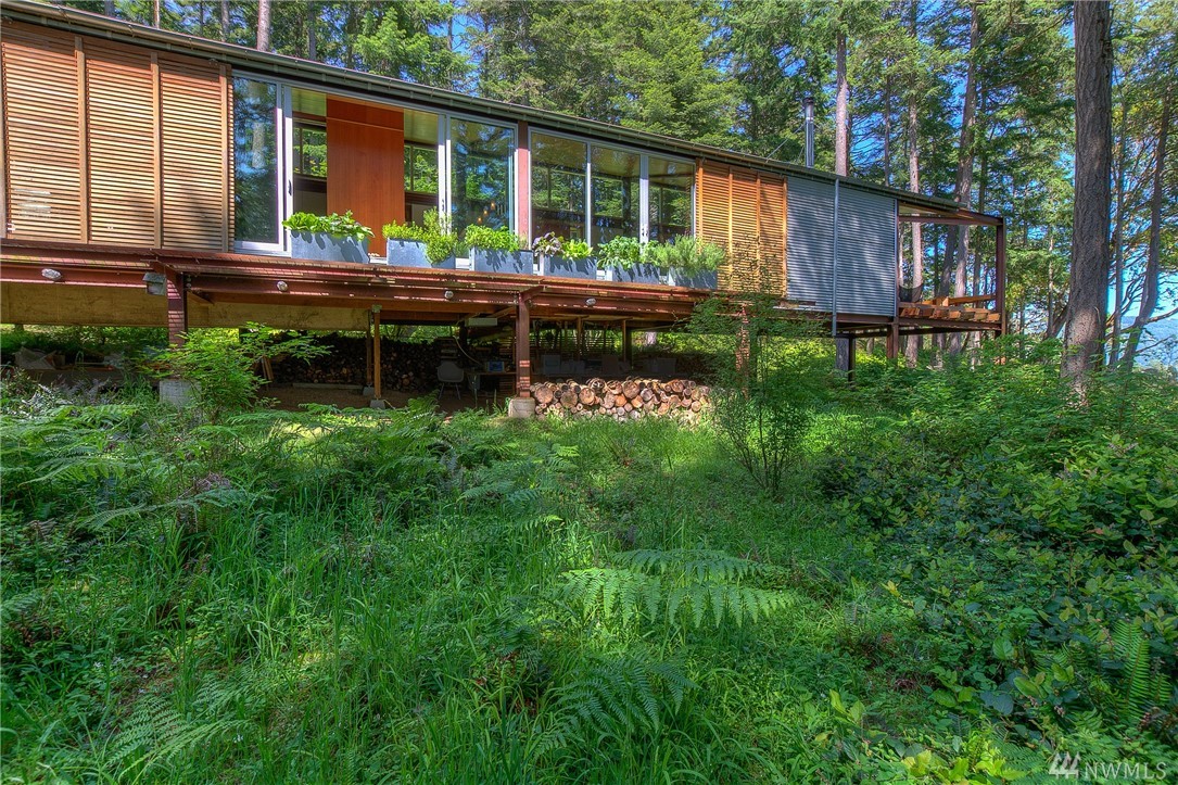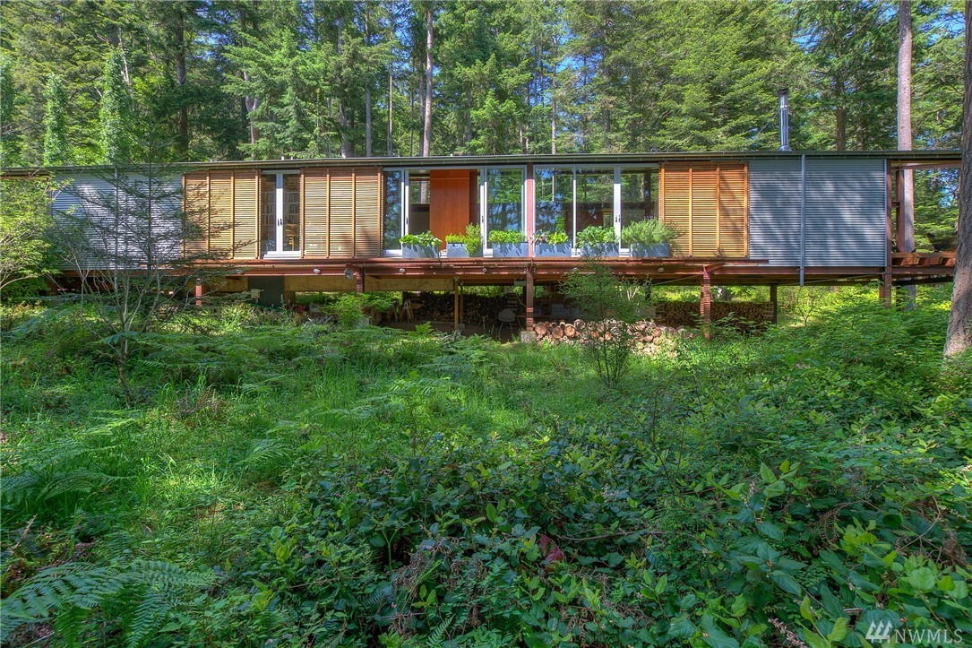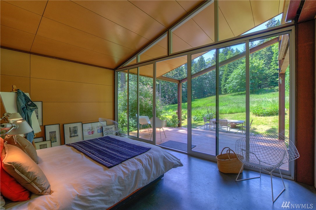 Modern light-filled design masterpiece of wood, steel & concrete. This two bedroom home on 10 park-like acres offers tranquil East Sound water views. Enter this work by Northwest Modern Architect Gordon Walker by footbridge floating above the forest floor. Tall windows invite sunlight & water views to the Southeast & sunny meadow to the West. 2 tax parcels, 2 wells. 80 lineal feet of floor to ceiling glass, clerestory windows, radiant heat. Guest Glamping tent & bbq area in private forest glade.