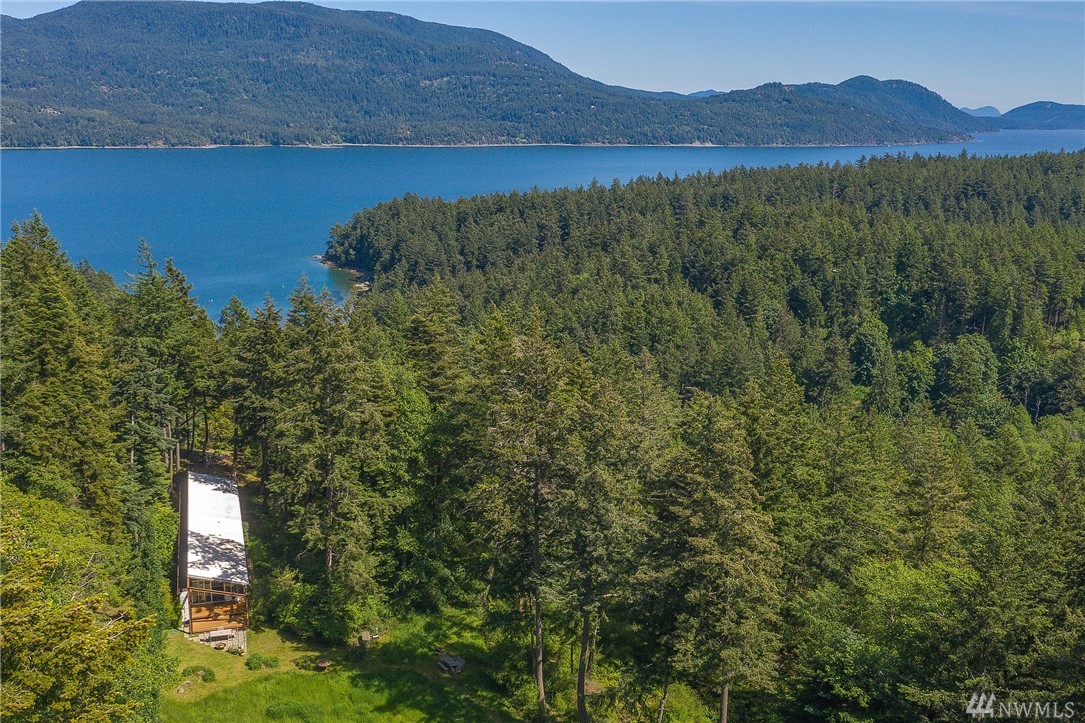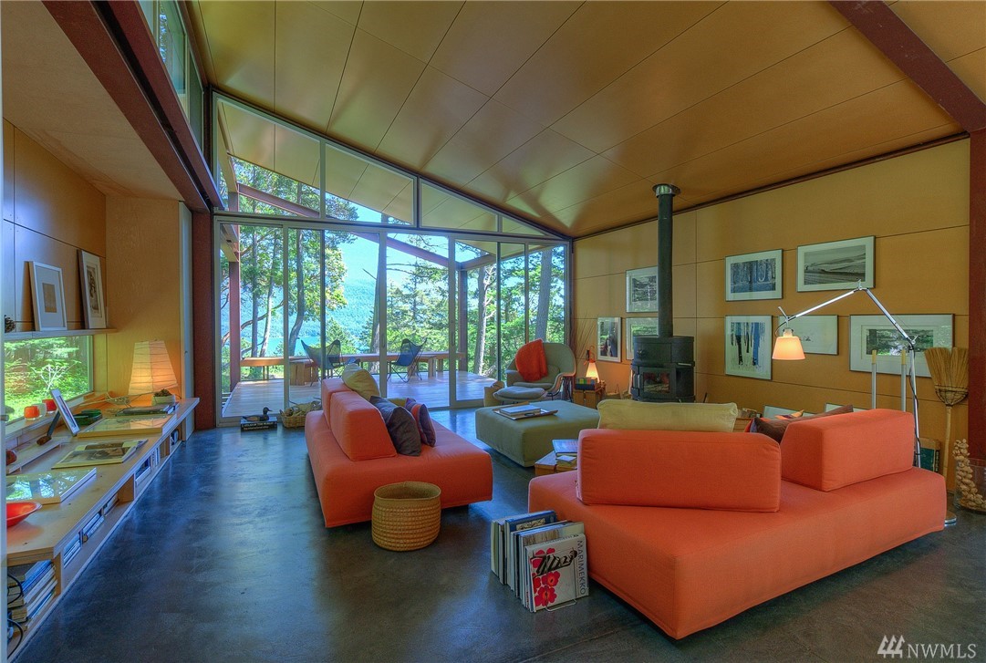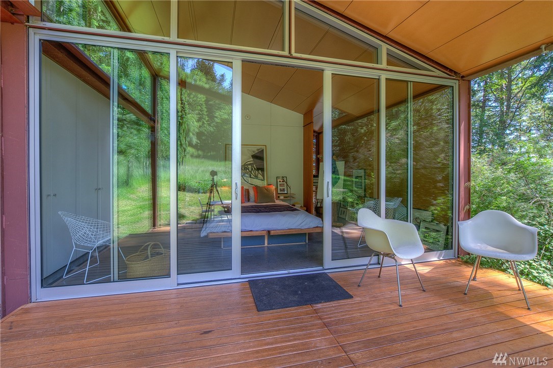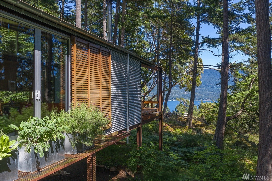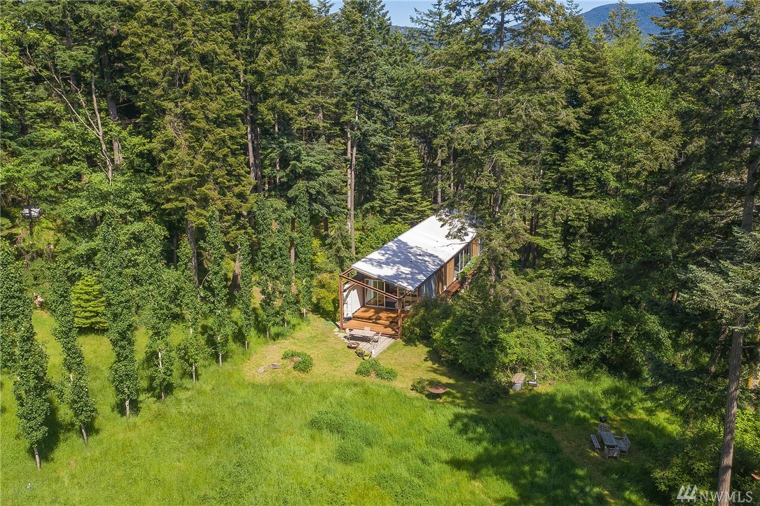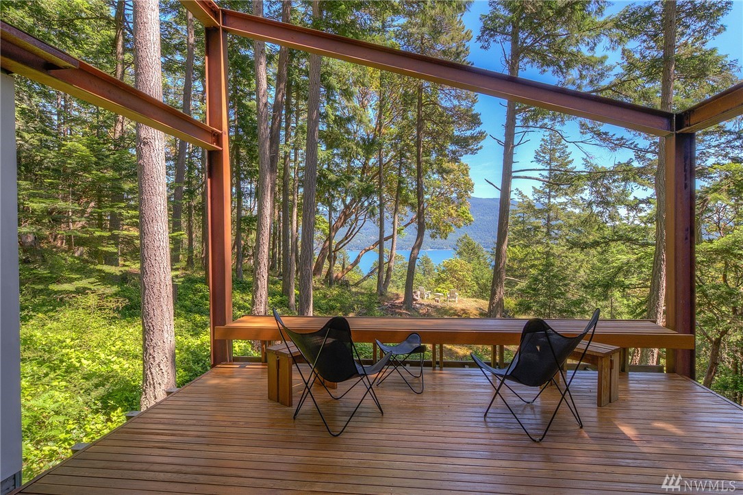 Modern light-filled design masterpiece of wood, steel & concrete. This two bedroom home on 10 park-like acres offers tranquil East Sound water views. Enter this work by Northwest Modern Architect Gordon Walker by footbridge floating above the forest floor. Tall windows invite sunlight & water views to the Southeast & sunny meadow to the West. 2 tax parcels, 2 wells. 80 lineal feet of floor to ceiling glass, clerestory windows, radiant heat. Guest Glamping tent & bbq area in private forest glade.