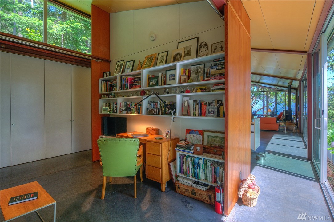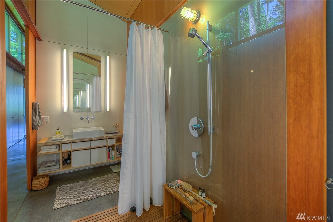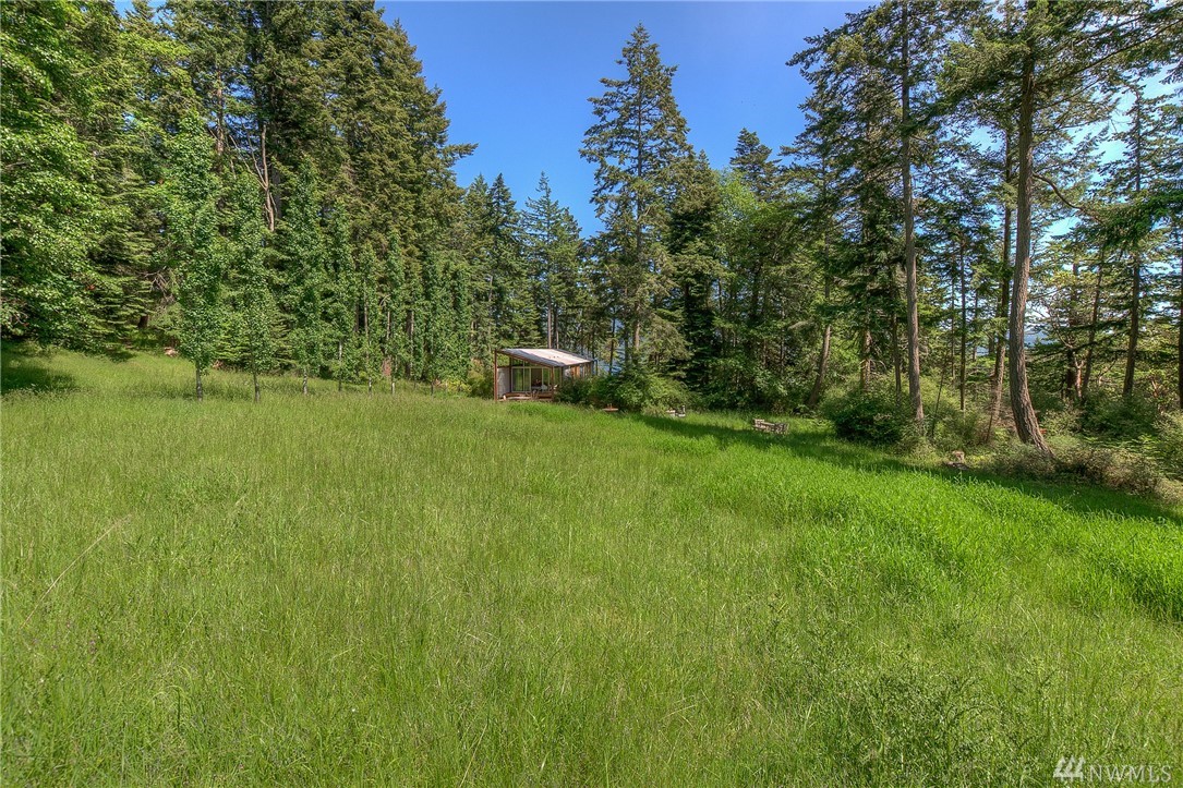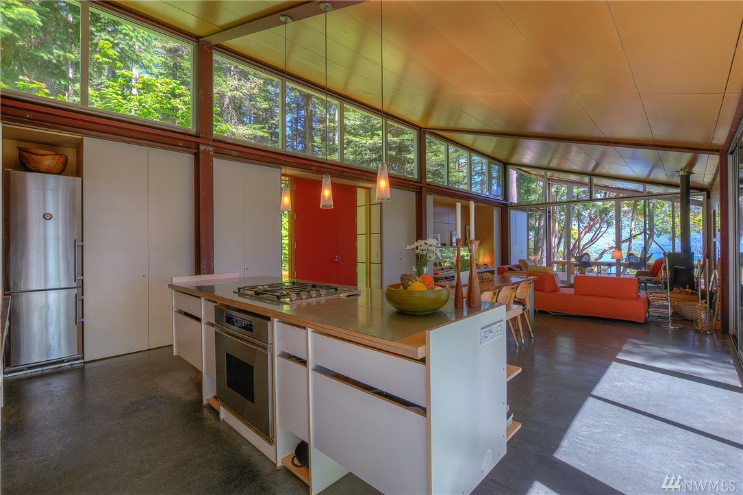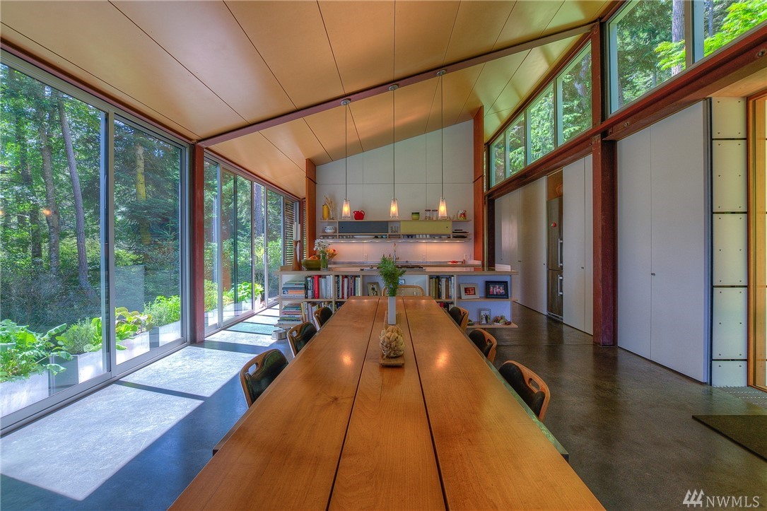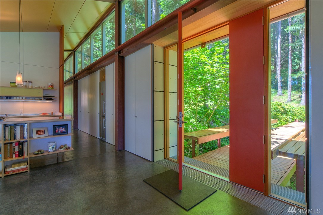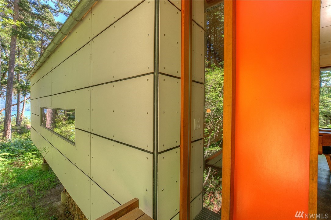 Modern light-filled design masterpiece of wood, steel & concrete. This two bedroom home on 10 park-like acres offers tranquil East Sound water views. Enter this work by Northwest Modern Architect Gordon Walker by footbridge floating above the forest floor. Tall windows invite sunlight & water views to the Southeast & sunny meadow to the West. 2 tax parcels, 2 wells. 80 lineal feet of floor to ceiling glass, clerestory windows, radiant heat. Guest Glamping tent & bbq area in private forest glade.