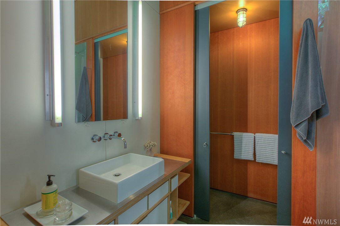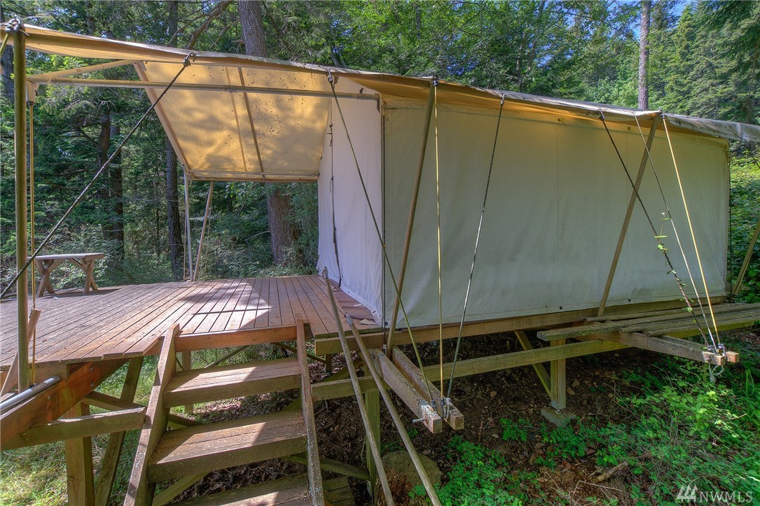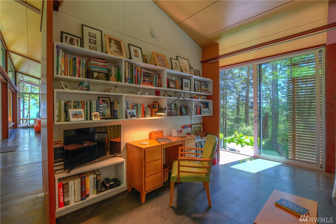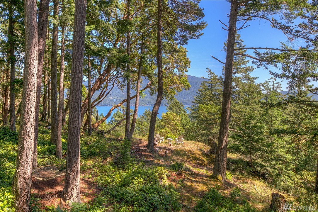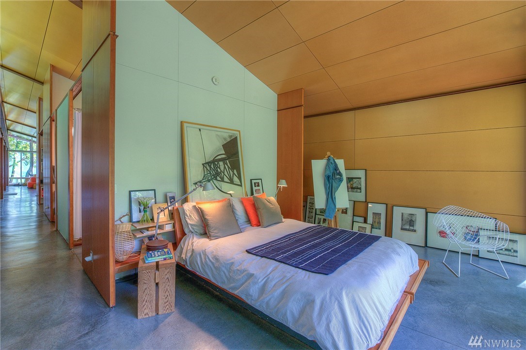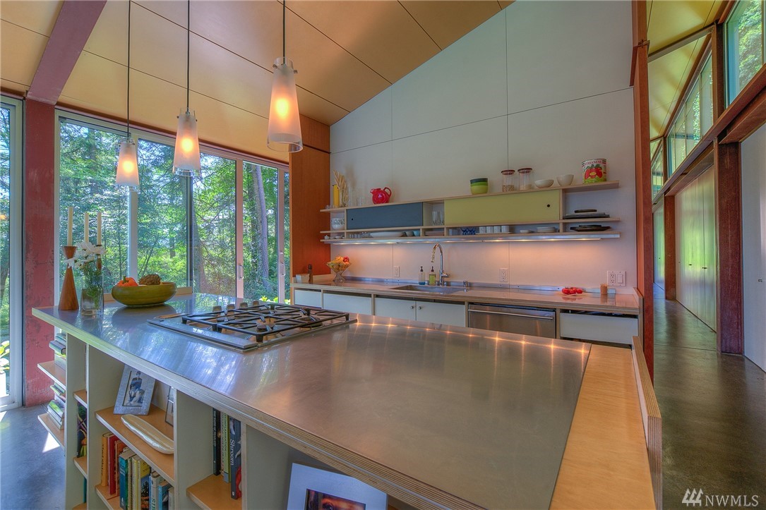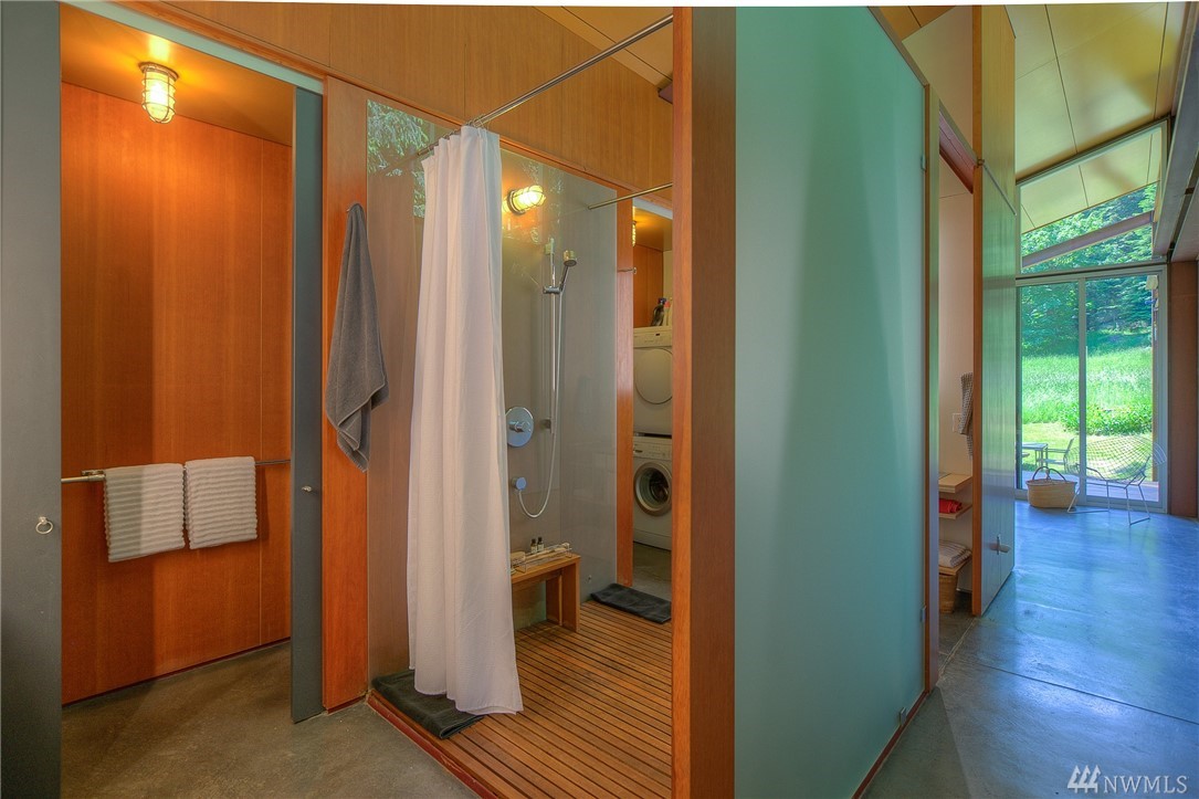 Modern light-filled design masterpiece of wood, steel & concrete. This two bedroom home on 10 park-like acres offers tranquil East Sound water views. Enter this work by Northwest Modern Architect Gordon Walker by footbridge floating above the forest floor. Tall windows invite sunlight & water views to the Southeast & sunny meadow to the West. 2 tax parcels, 2 wells. 80 lineal feet of floor to ceiling glass, clerestory windows, radiant heat. Guest Glamping tent & bbq area in private forest glade.