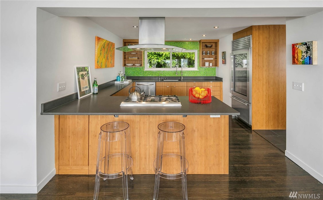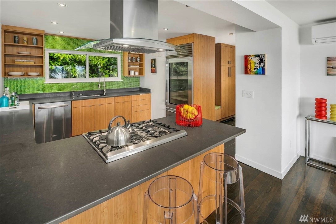 Sleek, modern, sophistication! This contemporary 2 bedroom open concept home has unparalleled views! Walls of windows for amazing light & sunsets. The stunning chef's kitchen is über sleek, w/stunning Sub Zero, thoughtful details & gorgeous hard woods. Modern day living, balances mid century mod architecture & chic design. A large, private rooftop deck for amazing entertaining! Extra large storage & private garage, unique to this unit. Super pet friendly! Steps to the beach & incredibly special!