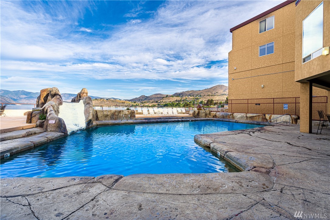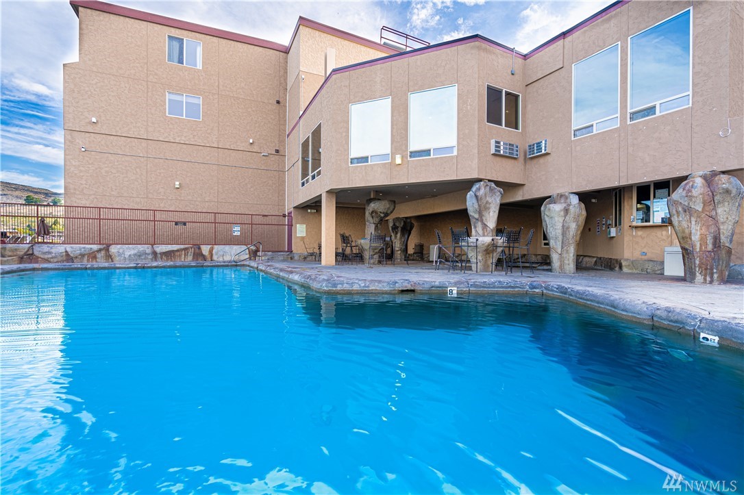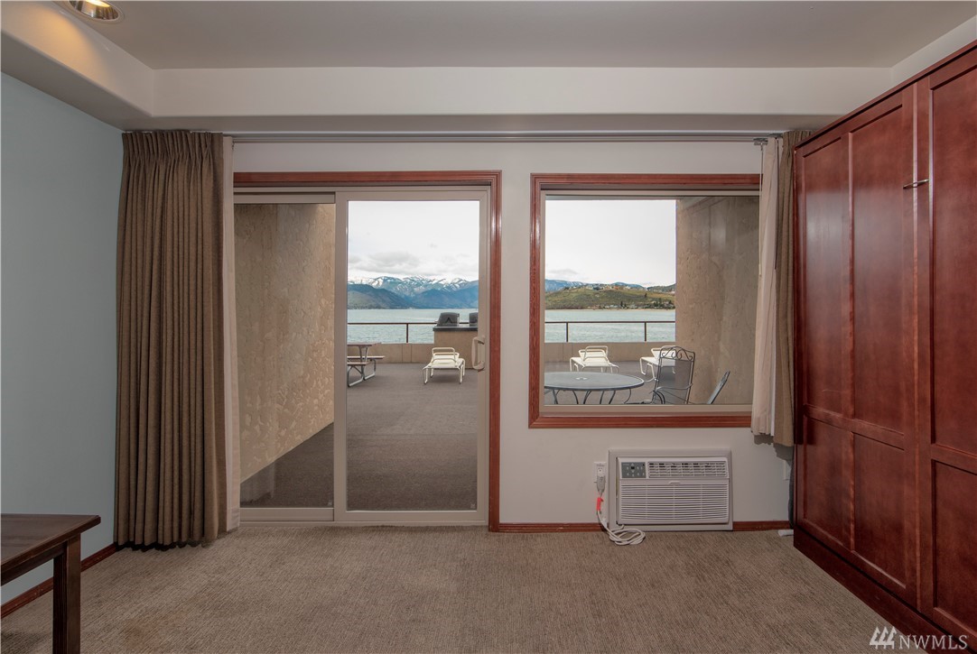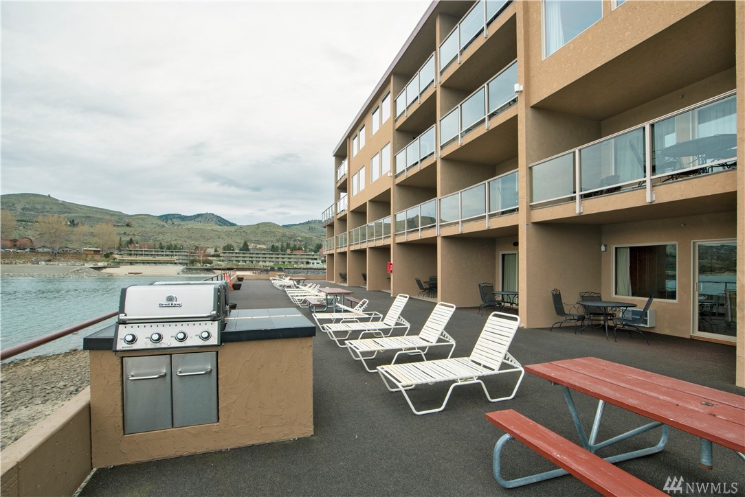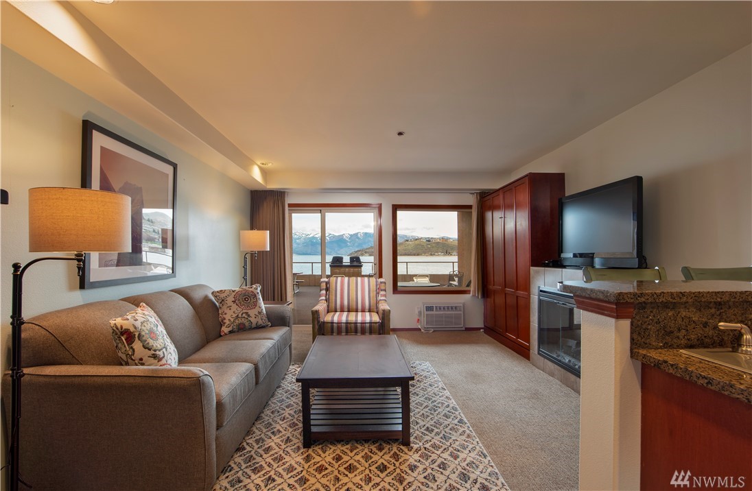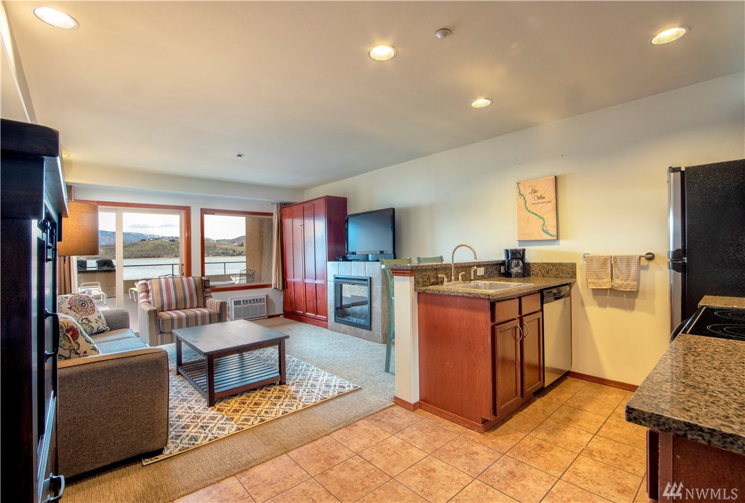 Up-lake VIEW unit at the Grandview! NEW furnishings, ground-level w granite counter tops, tile floors, patio, king bed, pull-out couch, murphy bed- sleep 6. Step in from the water to your private patio, open living space w kitchen bar-stool seating. Gorgeous view, easy access to pool, hot tub, lake, snack stand, lawns & exercise room. Quick stroll across the scenic historic river bridge to restaurants, shopping, walking trails and downtown activities. Enjoy &/or rent! Seller Finance Available