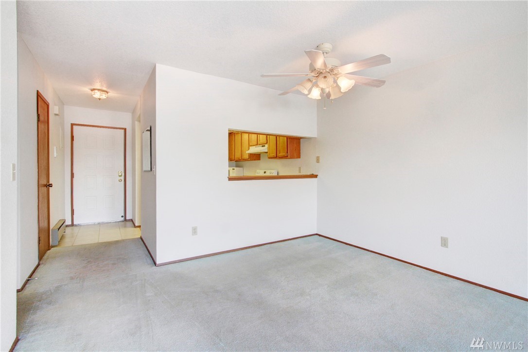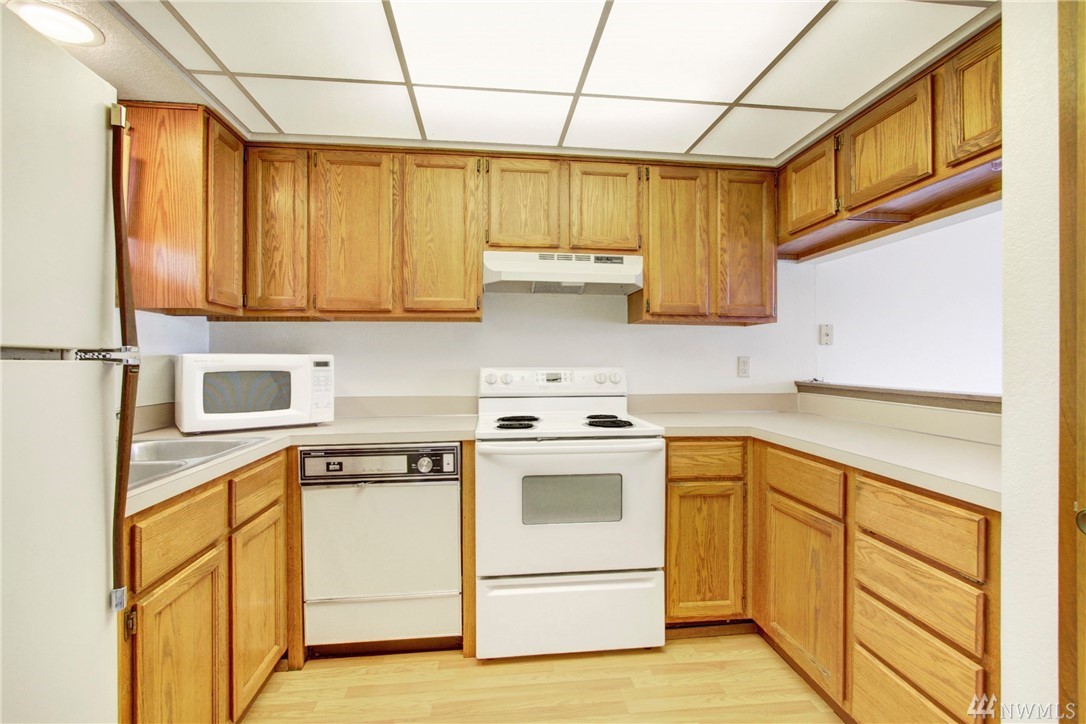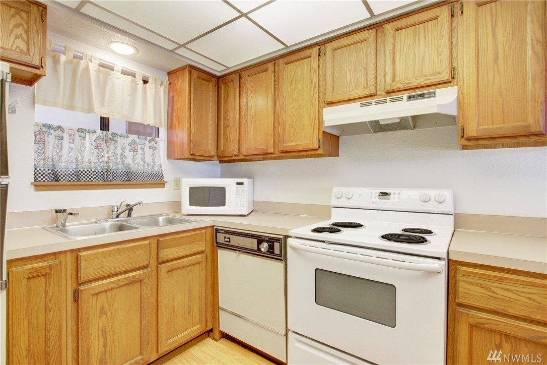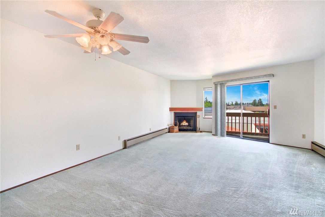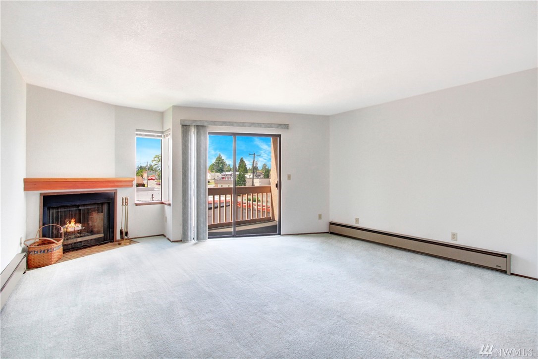 Clean and well cared for unit in Hill Vista condos. Cozy fireplace in living room. Private balcony. Washer and dryer in unit. Two parking spaces in covered parking area with convenient elevator access. Separate storage room. Located close to Burien town center for shopping, restaurants, and highway access for commuting