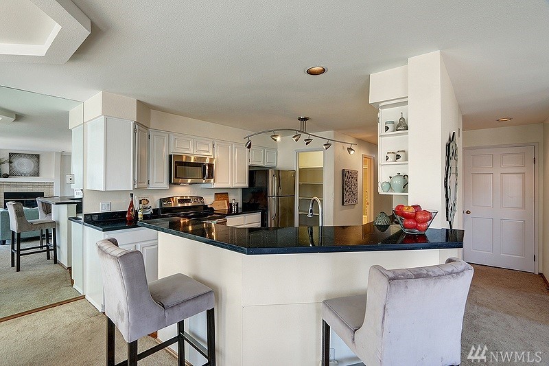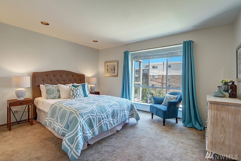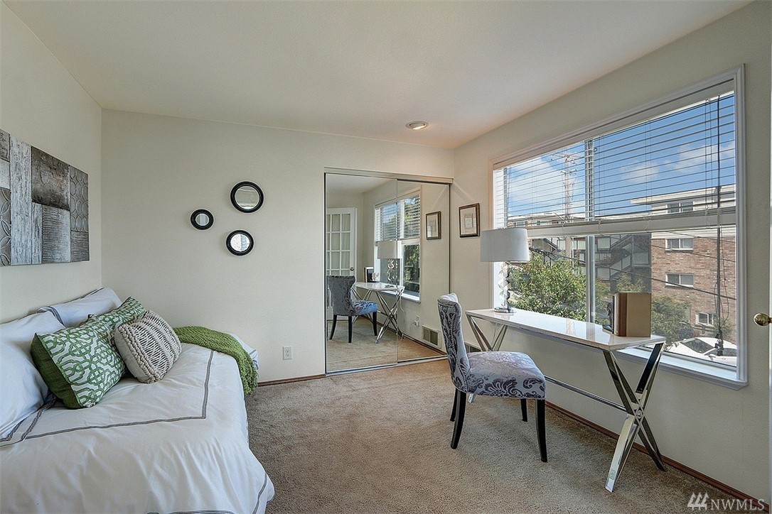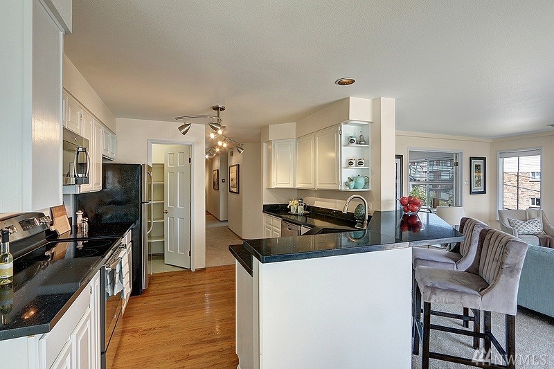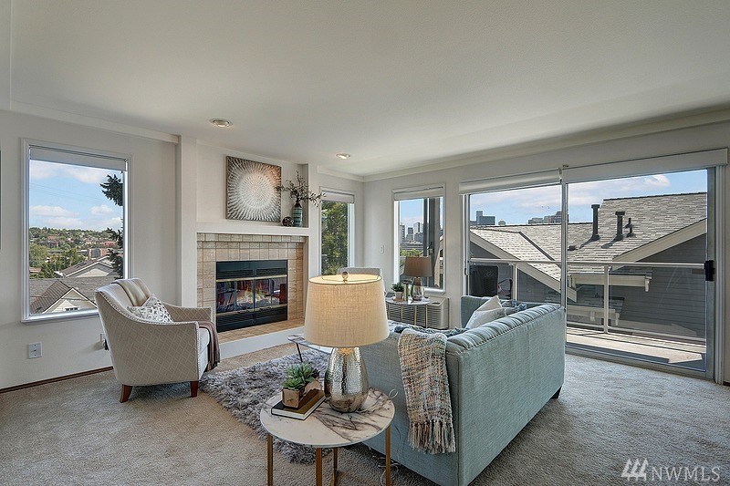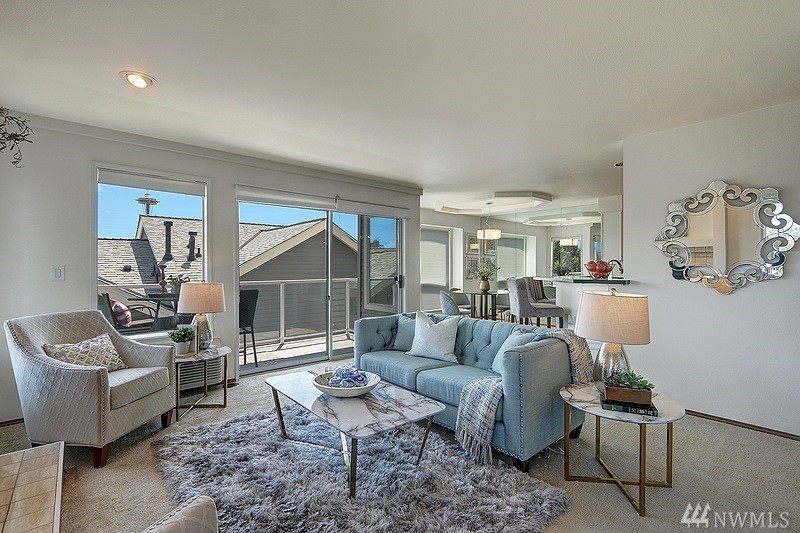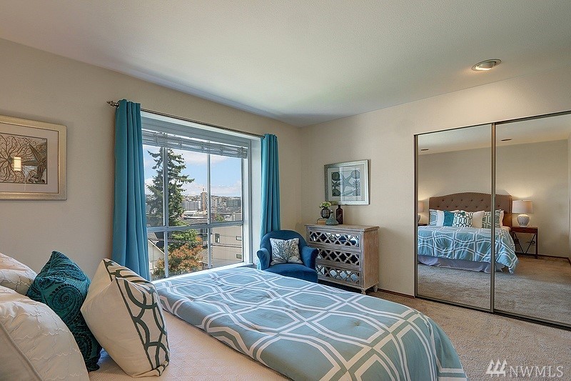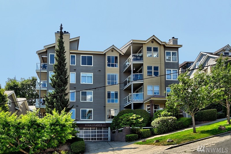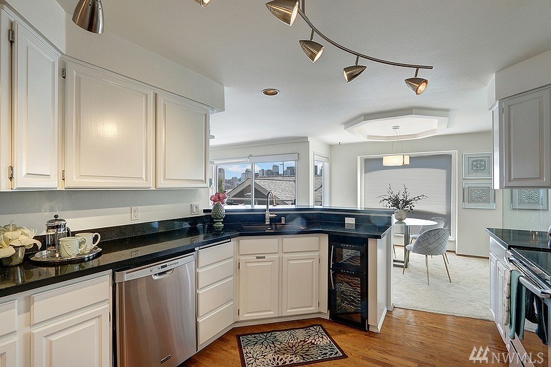 Exciting & rare opportunity to come home to The Renaissance. Situated in the heart of Queen Anne where city & needle views abound. Lg foyer greets you as natural light flows thru all living spaces. Oversized kitchen updated w/granite/stainless,wine fridge, pantry. Nice sized en-suite primary w/high-end bath upgrades & walk-in closet. Refashioned 2nd bath.Utility rm w/W/D & storage. A/C/secured parking w/huge storage, elevator, beautiful lobby,low dues.Walk to services & entertainment, SPECIAL !