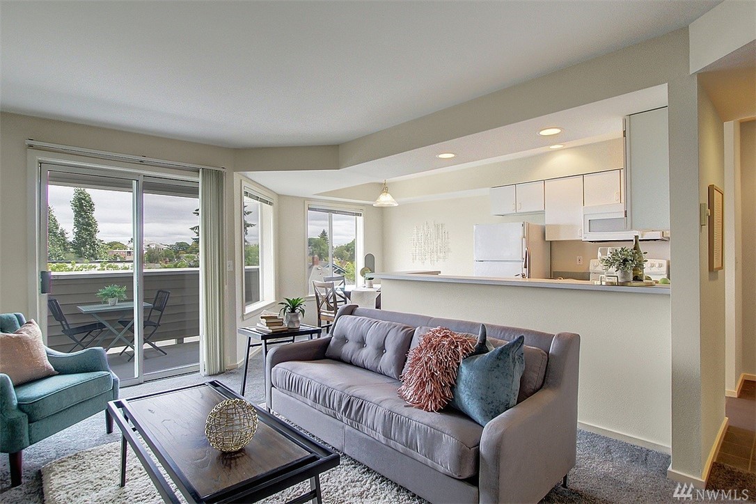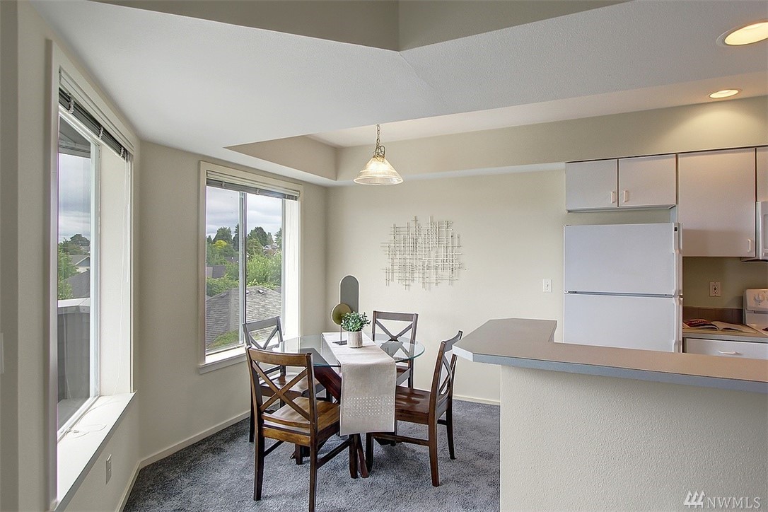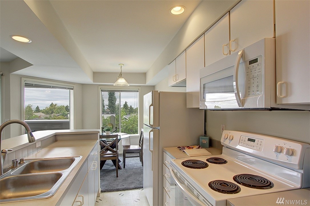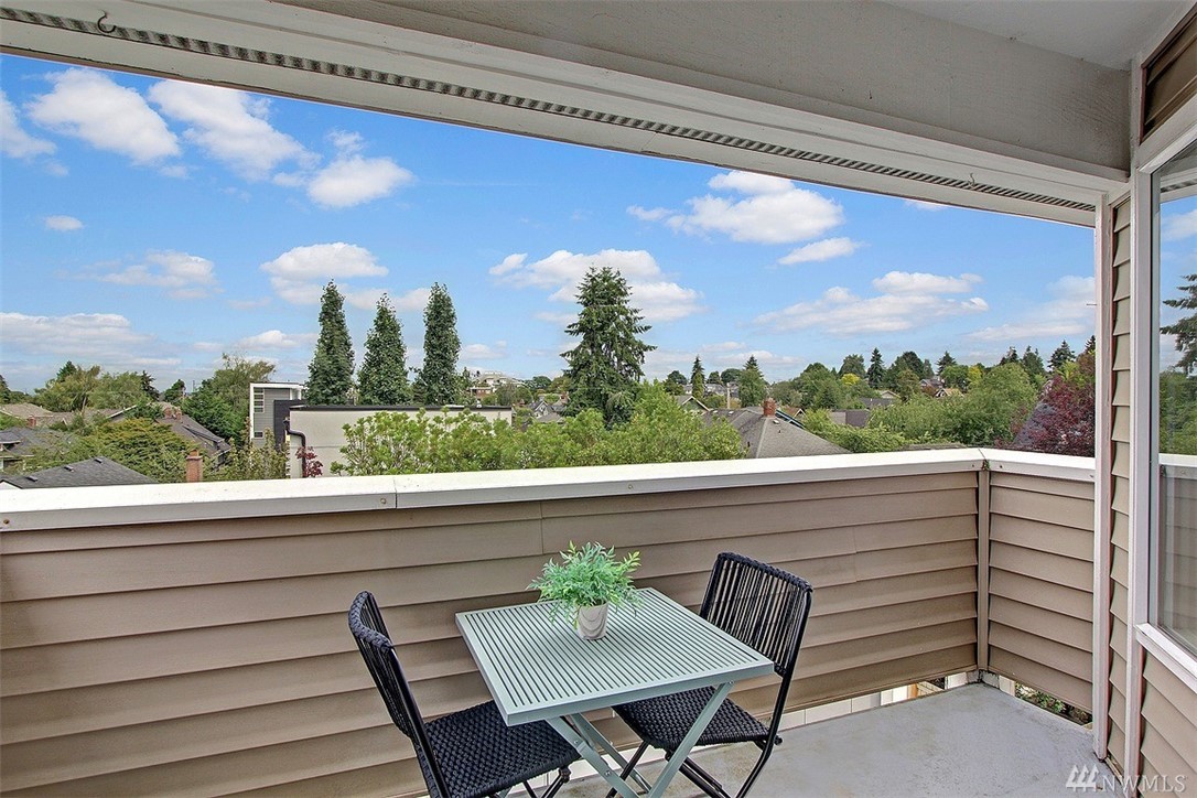 Spacious top floor, corner 1-bedroom, 1 bath condo. Open and spacious with lots of natural light. Bright and airy kitchen and cozy patio for relaxing or entertaining. Patio offers views of Olympic Mountains. Large master bedroom with walk-in closet. Common garage with one parking space and storage locker. Close to Queen Anne Avenue shops and restaurants.