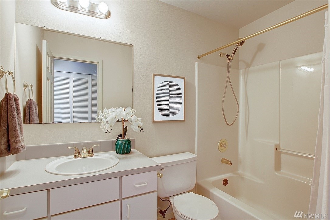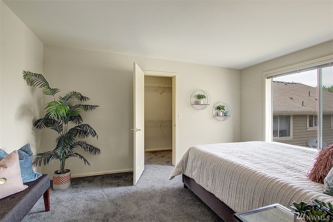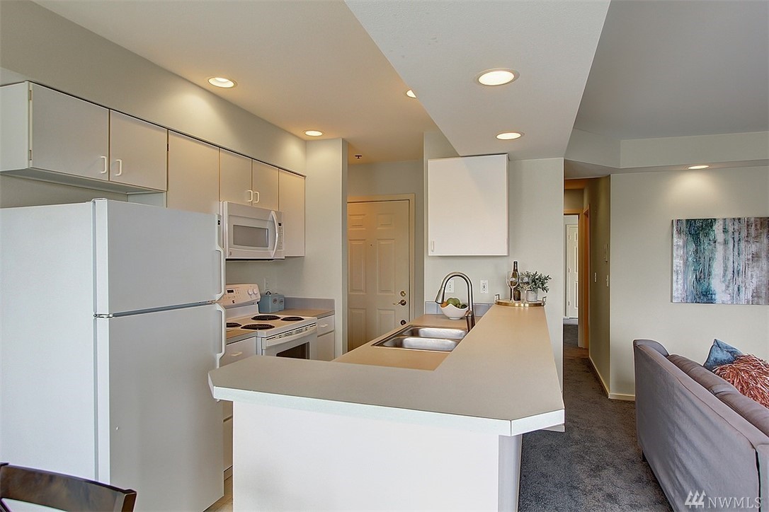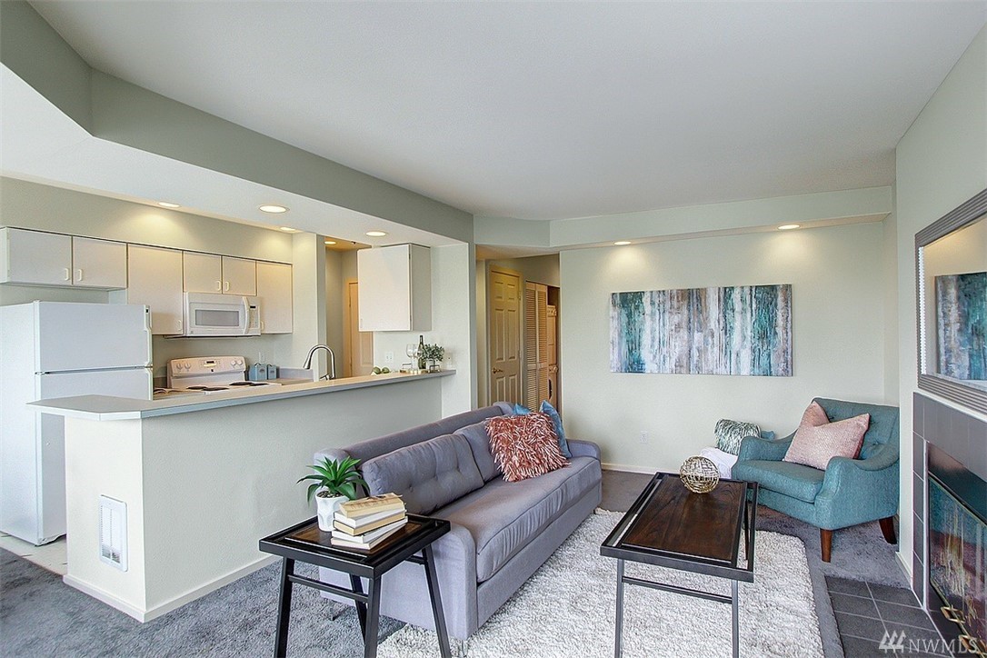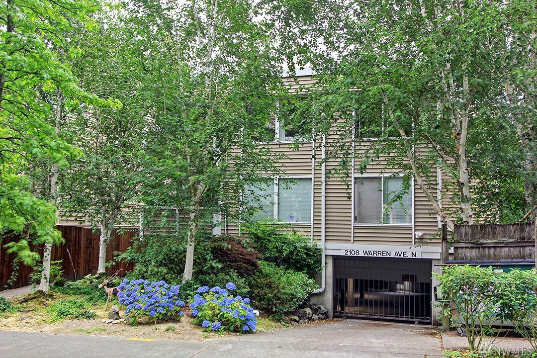 Spacious top floor, corner 1-bedroom, 1 bath condo. Open and spacious with lots of natural light. Bright and airy kitchen and cozy patio for relaxing or entertaining. Patio offers views of Olympic Mountains. Large master bedroom with walk-in closet. Common garage with one parking space and storage locker. Close to Queen Anne Avenue shops and restaurants.