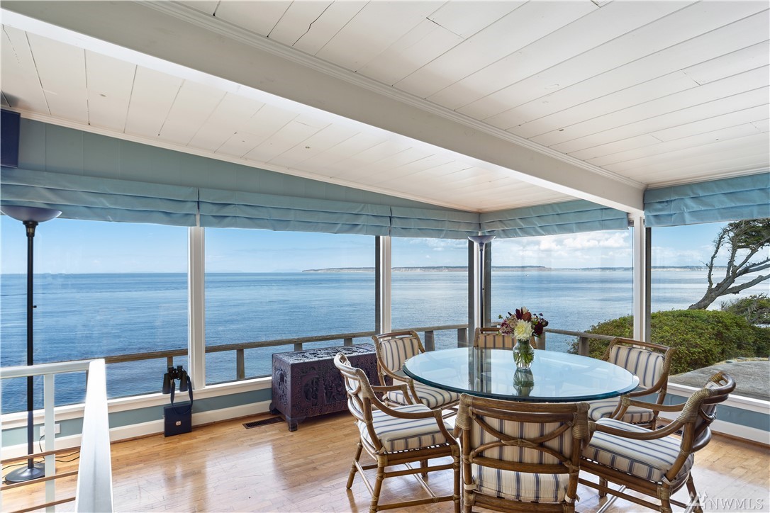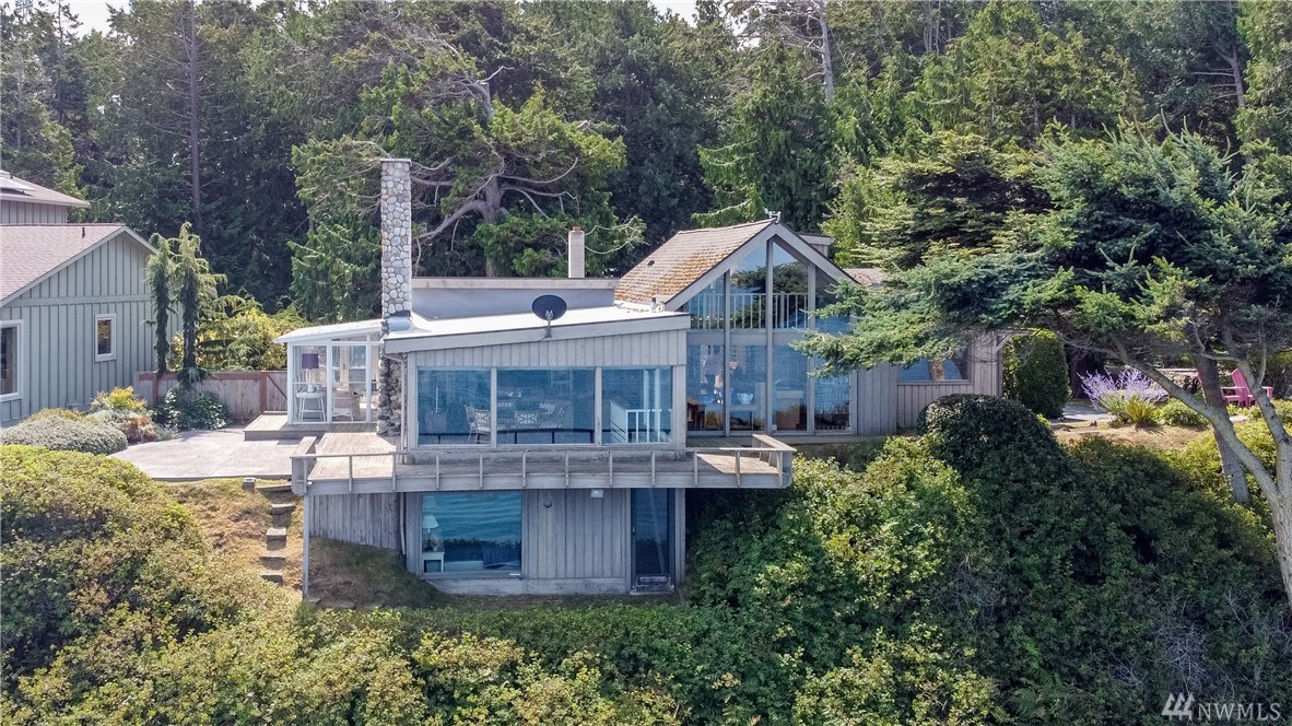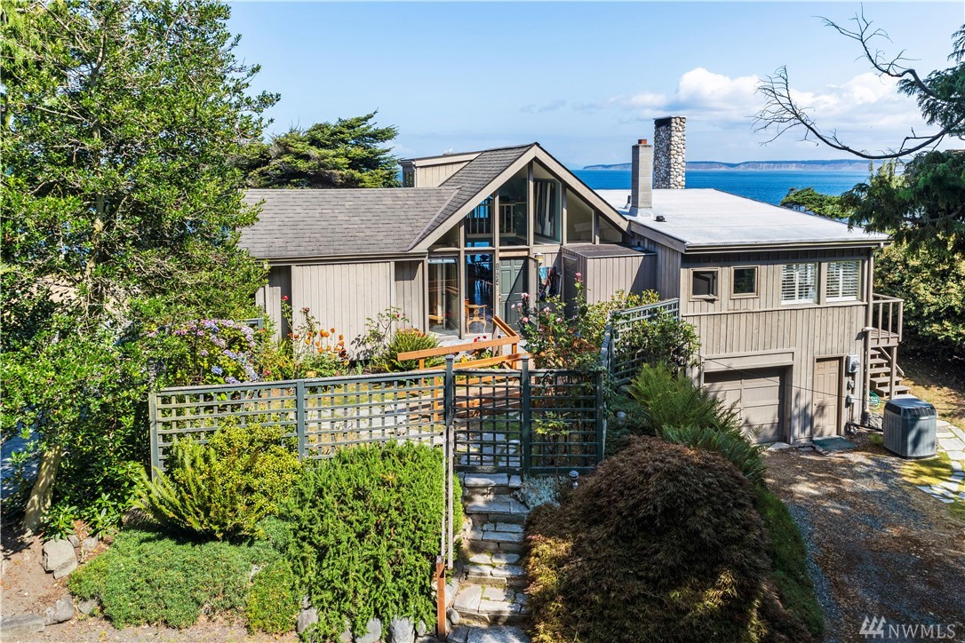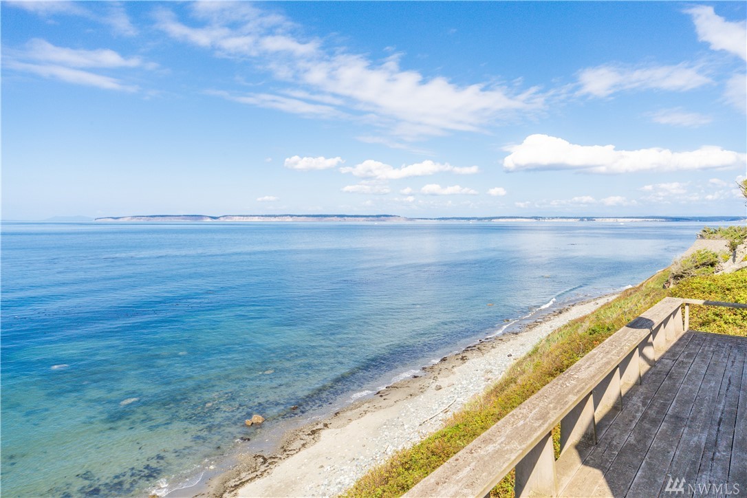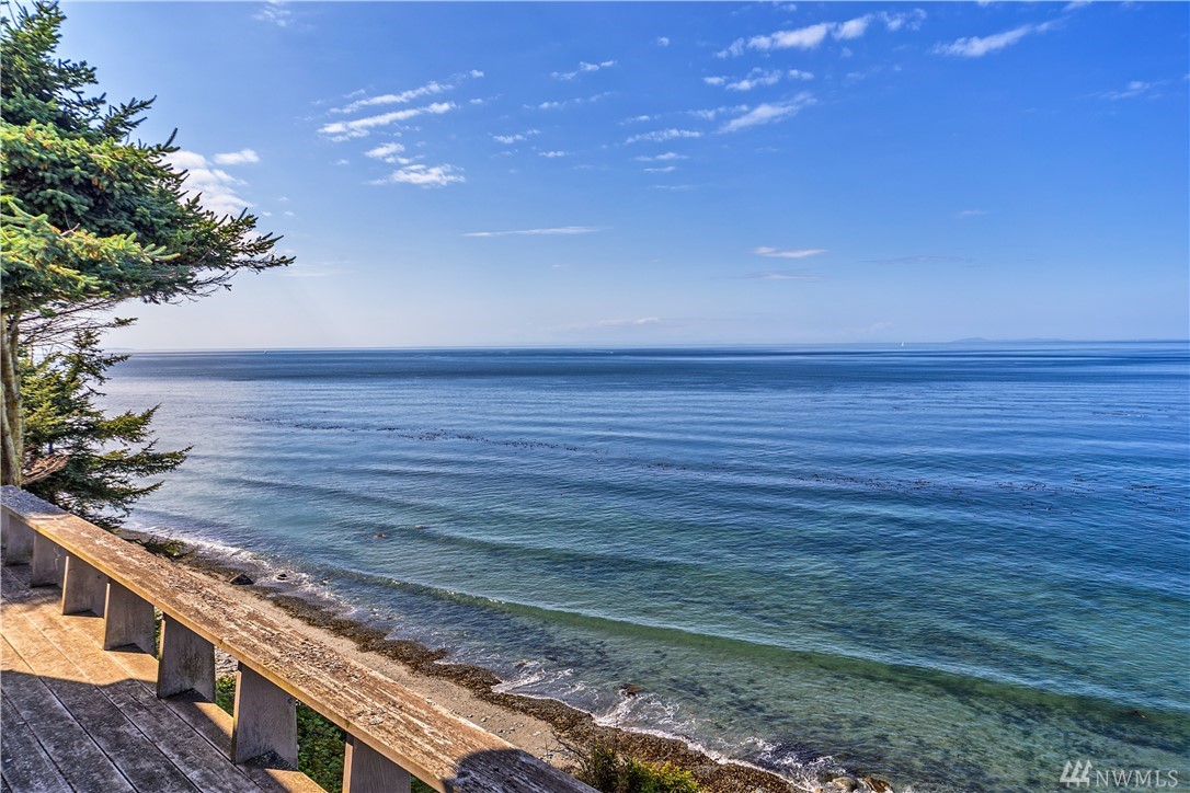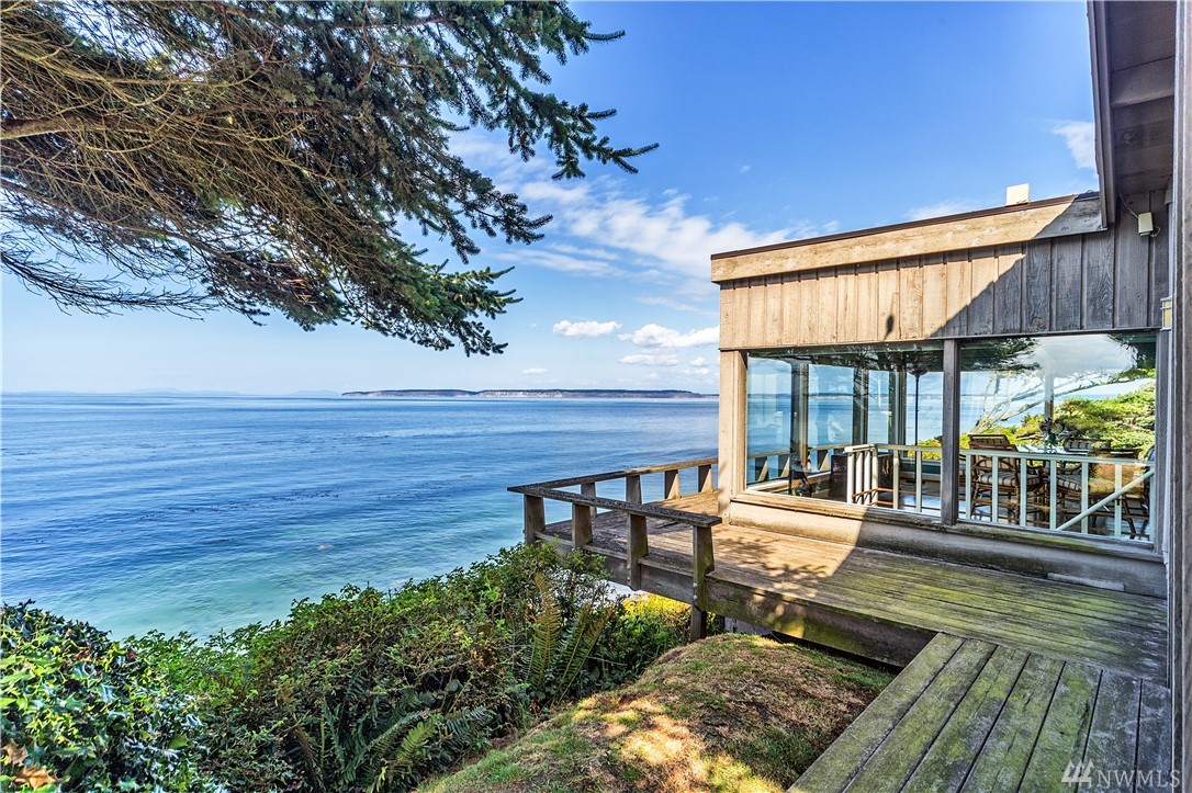 A Remarkable offering. Stunning Strait of Juan de Fuca waterfront. Views from the Olympics to Mt. Baker. Private dramatic wooded drive (second buildable lot) to the sunny bluff top and the quintessential beach cottage. Elegant, yet cozy. Open floor plan for the perfect entertaining house. Single level living with guest loft and guest bedroom downstairs. 3 bedrooms, 3 baths (2 are shower only) plus office. In addition, wonderful sun room. River rock fireplace. Lots of storage. Single car garage.