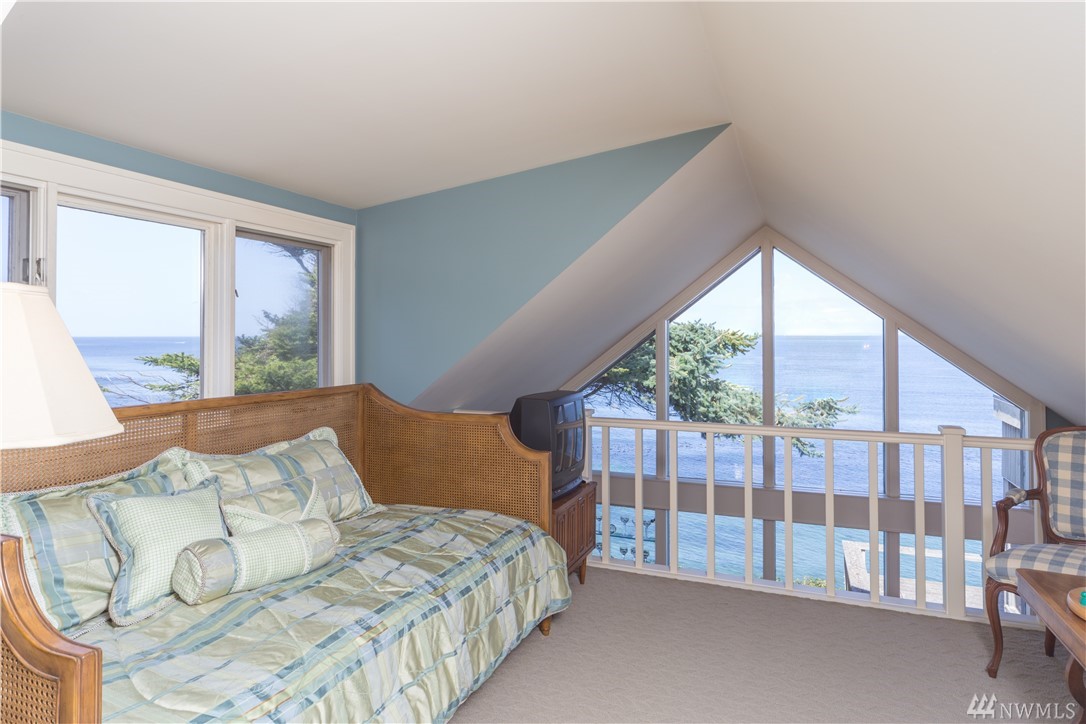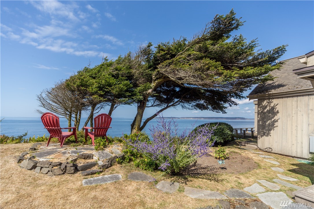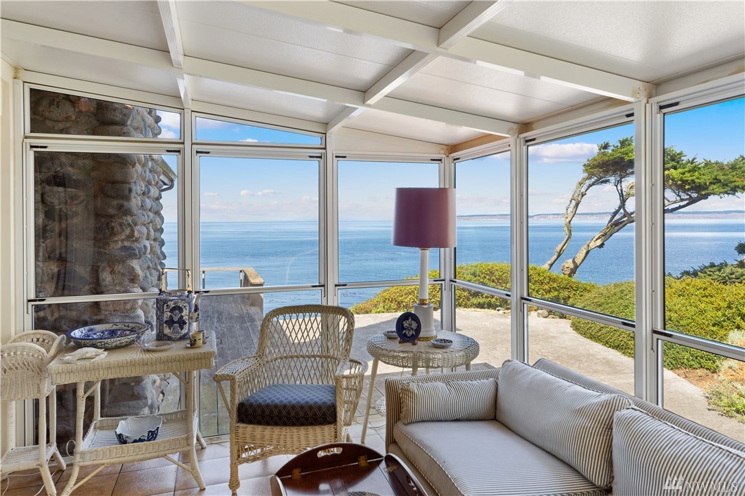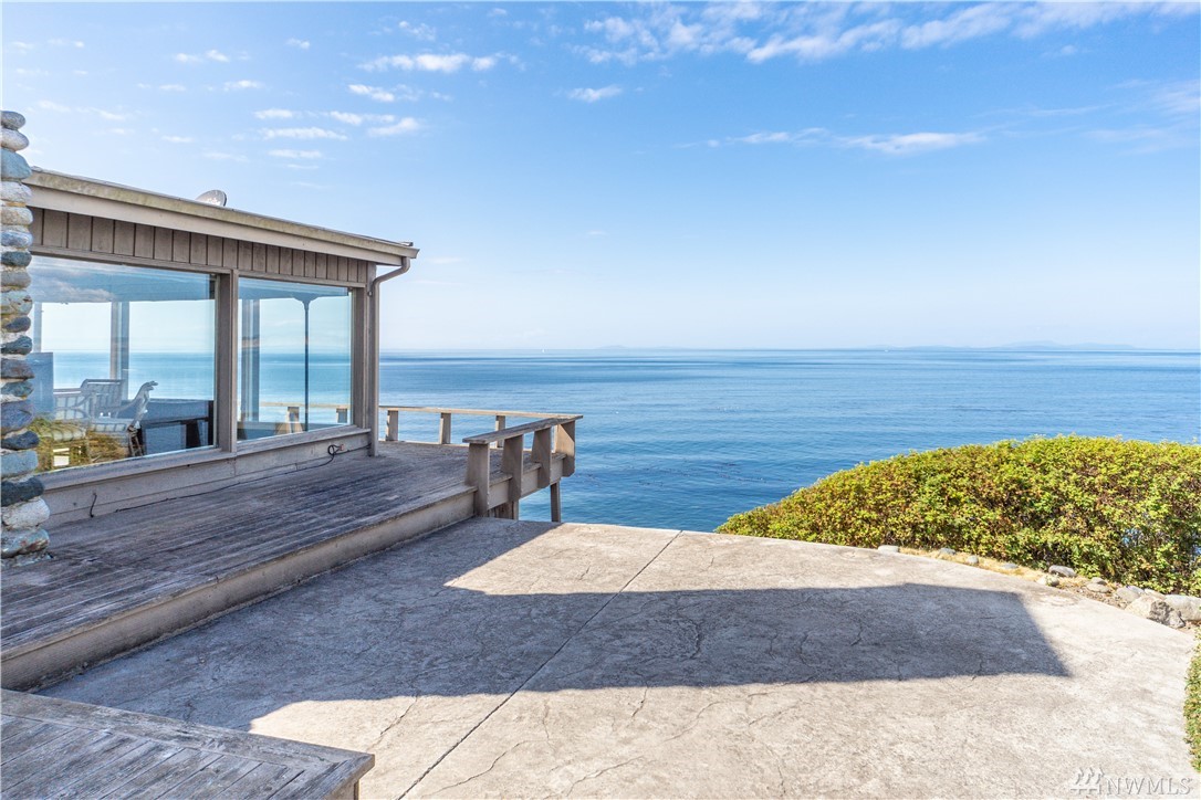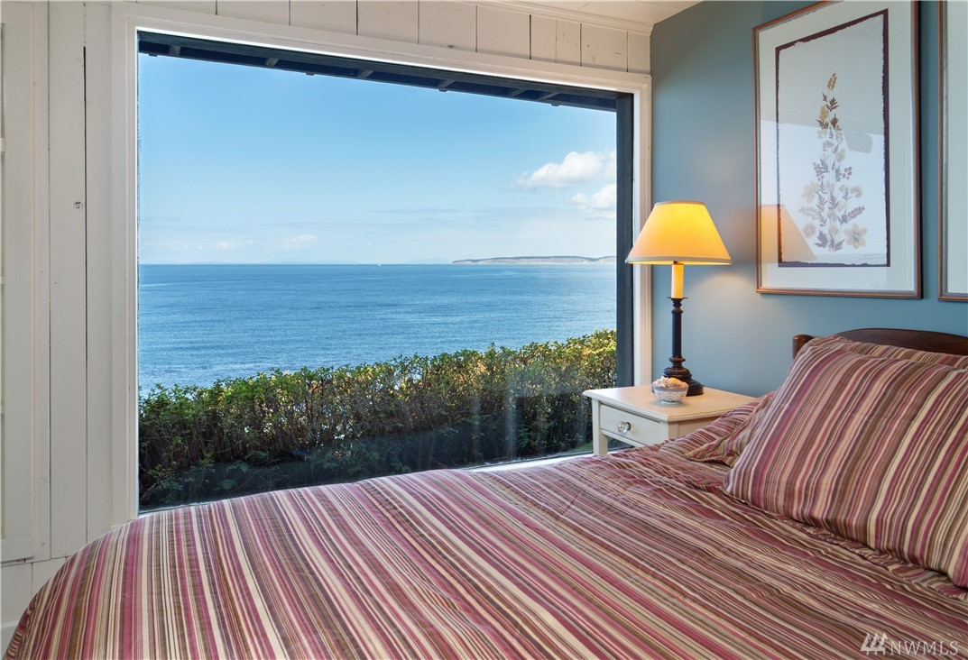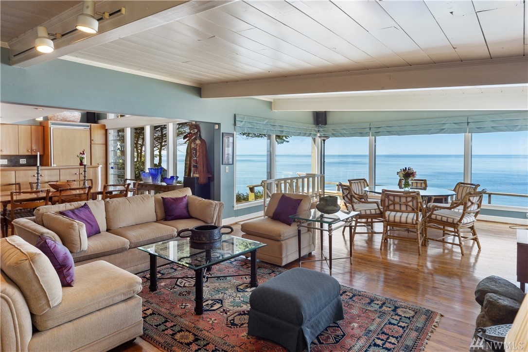 A Remarkable offering. Stunning Strait of Juan de Fuca waterfront. Views from the Olympics to Mt. Baker. Private dramatic wooded drive (second buildable lot) to the sunny bluff top and the quintessential beach cottage. Elegant, yet cozy. Open floor plan for the perfect entertaining house. Single level living with guest loft and guest bedroom downstairs. 3 bedrooms, 3 baths (2 are shower only) plus office. In addition, wonderful sun room. River rock fireplace. Lots of storage. Single car garage.