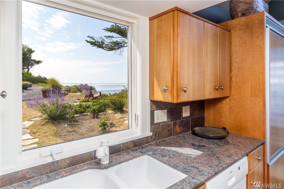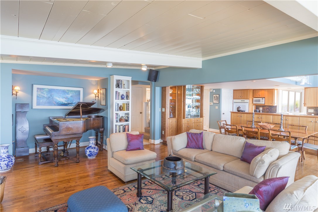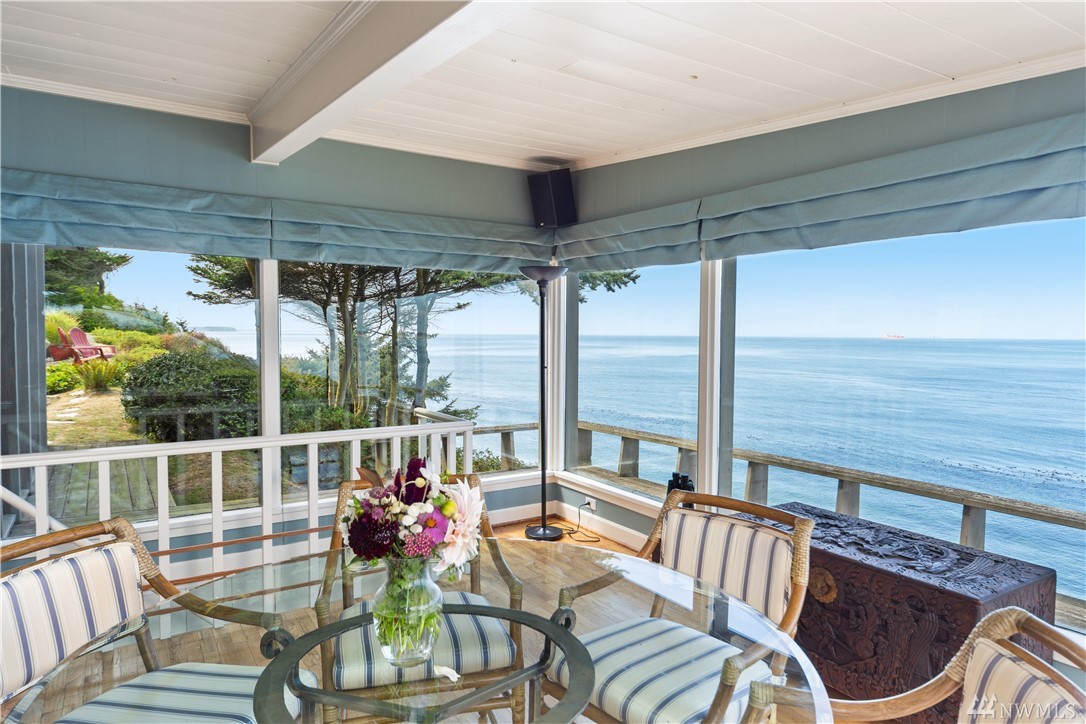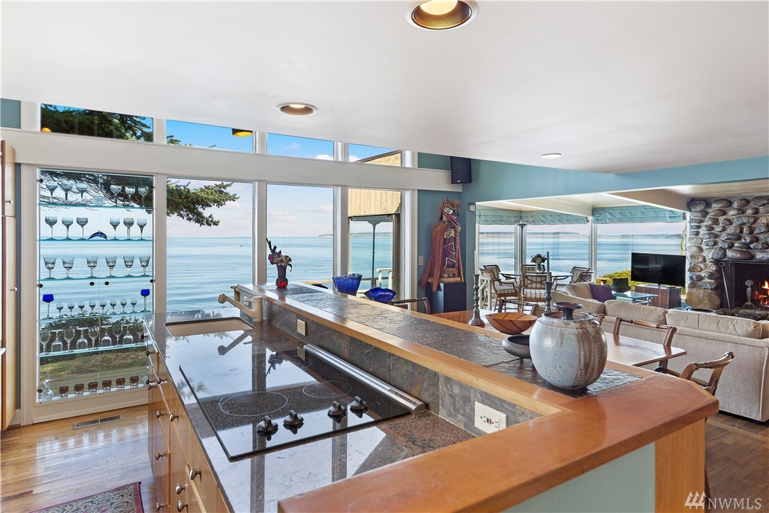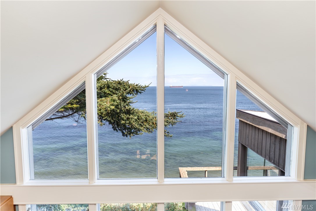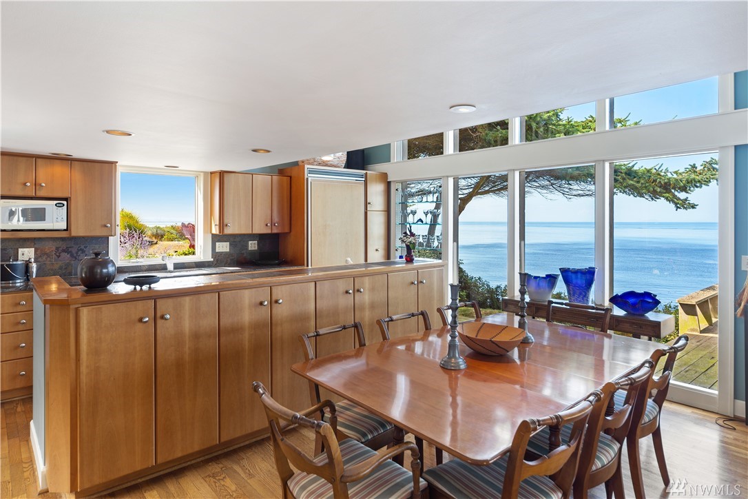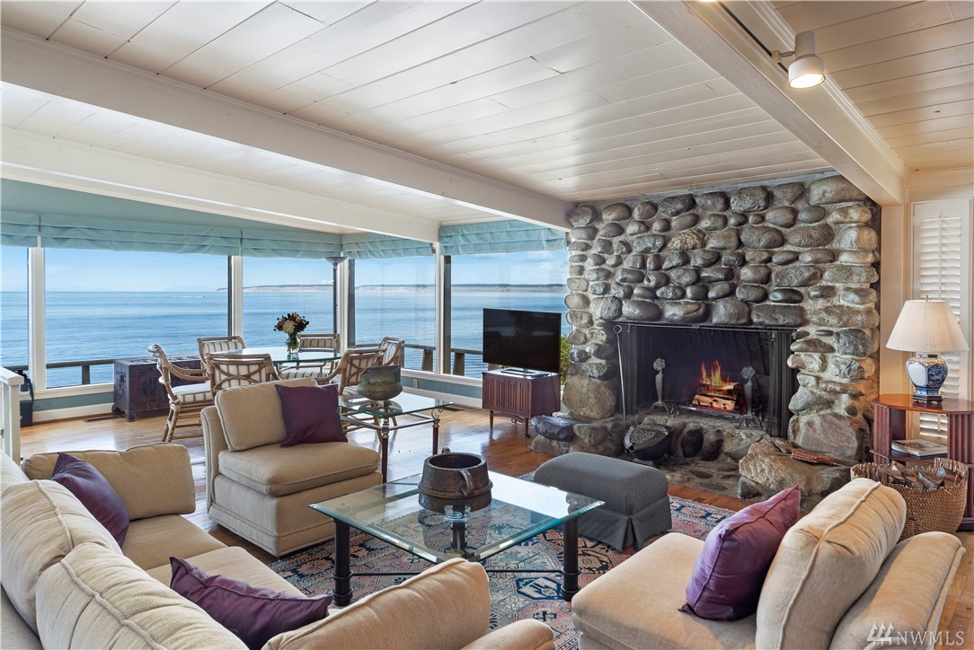 A Remarkable offering. Stunning Strait of Juan de Fuca waterfront. Views from the Olympics to Mt. Baker. Private dramatic wooded drive (second buildable lot) to the sunny bluff top and the quintessential beach cottage. Elegant, yet cozy. Open floor plan for the perfect entertaining house. Single level living with guest loft and guest bedroom downstairs. 3 bedrooms, 3 baths (2 are shower only) plus office. In addition, wonderful sun room. River rock fireplace. Lots of storage. Single car garage.