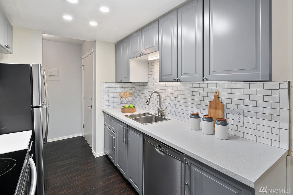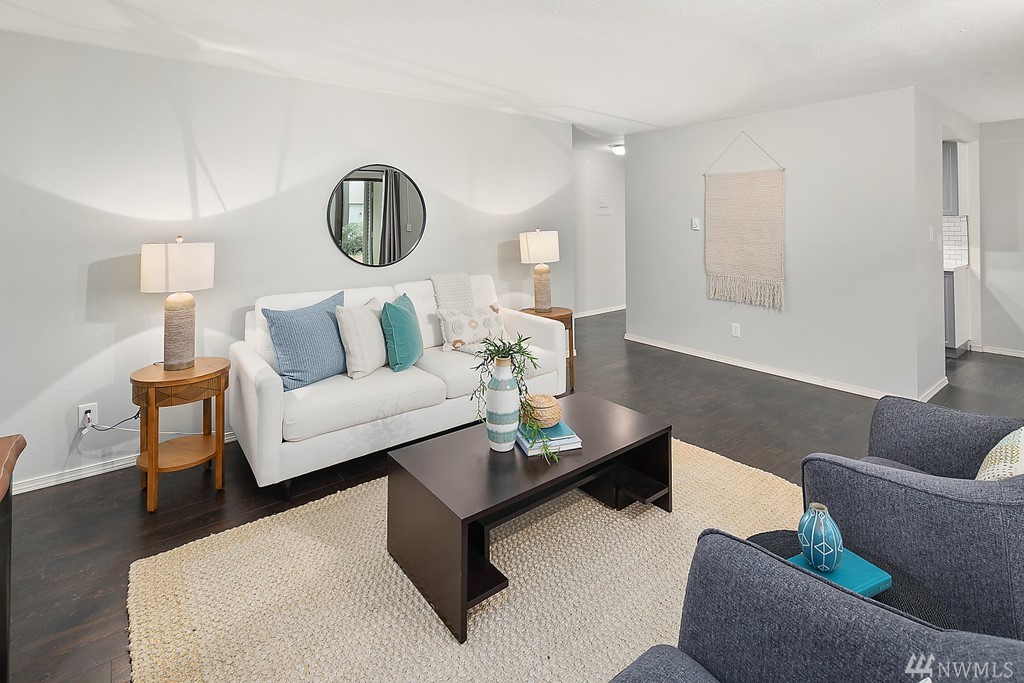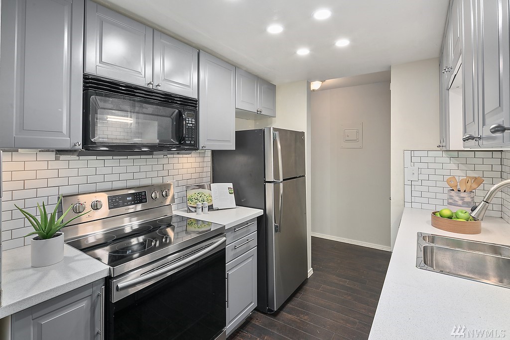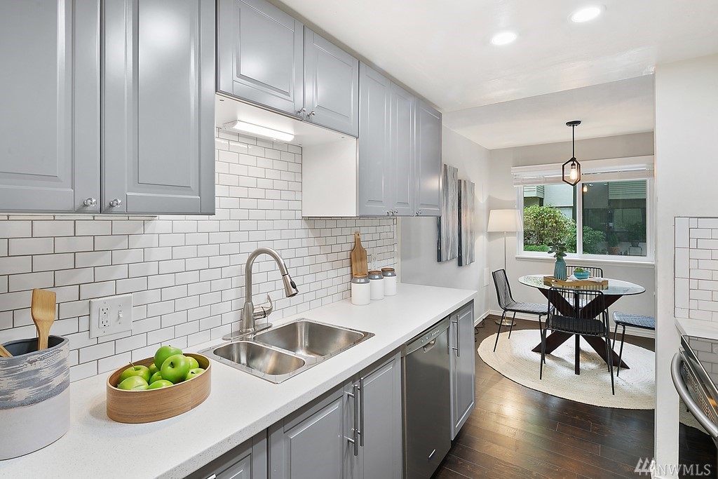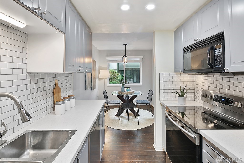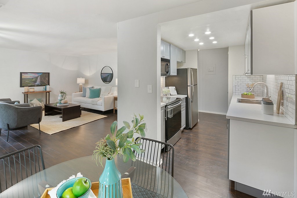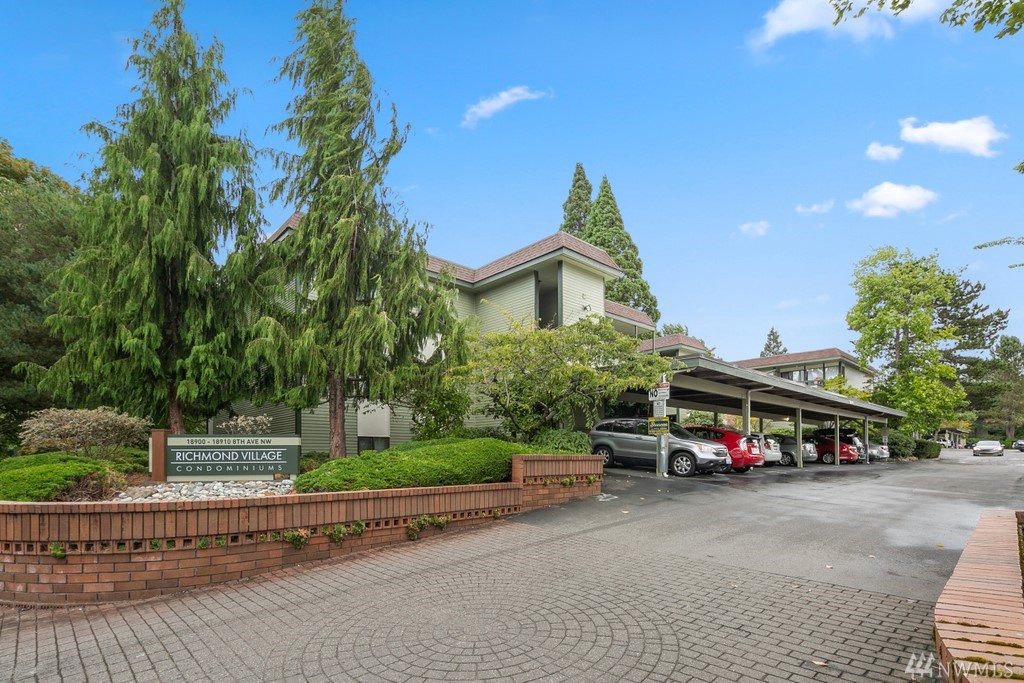 Remodeled ground fl. end-unit. New tile backsplash, 2+ years new appliances, kitchen cabinets, plank flooring, blinds & fresh paint. Primary bedroom w/ en-suite bath. 2 assigned parking spaces, 1 covered! Friendly community, outdoor pool to beat the hot summer days, pet friendly building. Grocery, coffee, drug store & restaurants just out your door. Richmond Beach Saltwater Park 5 minutes by car. Mt. Lk Terrace & Shoreline Lt rail in 2024 - 17 minutes to downtown. Professionally managed HOA.