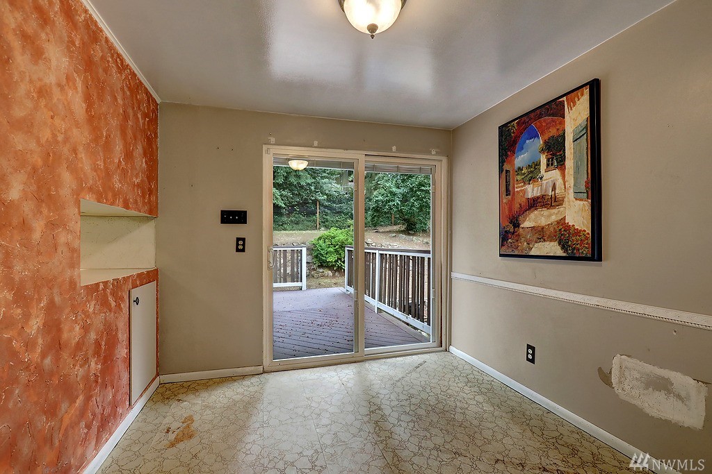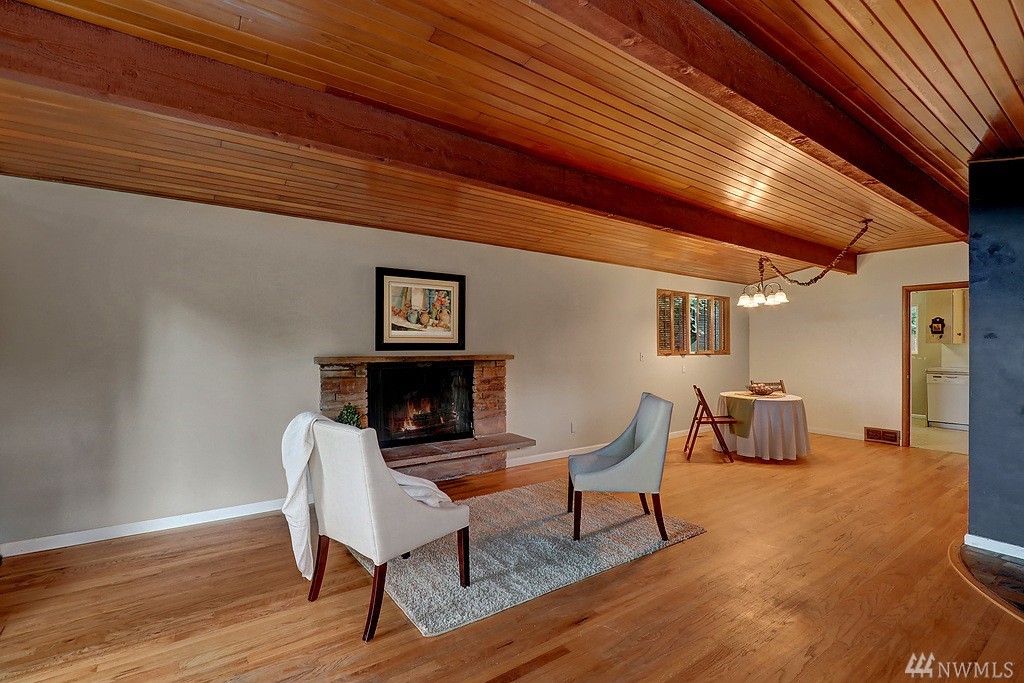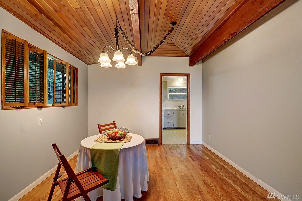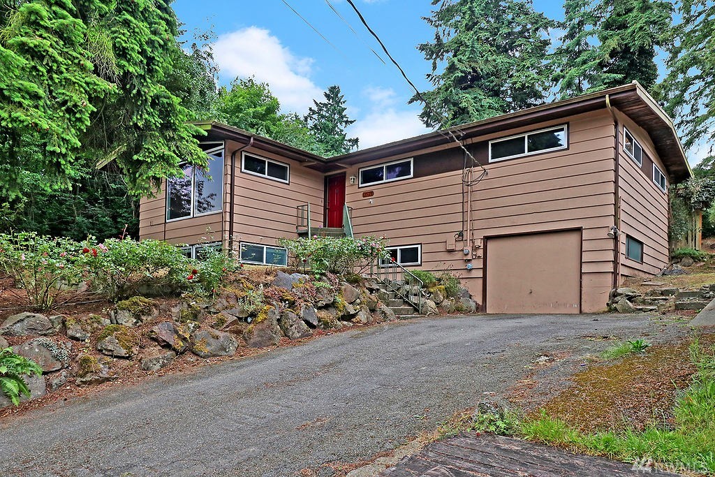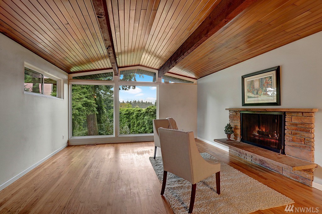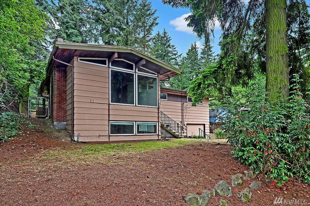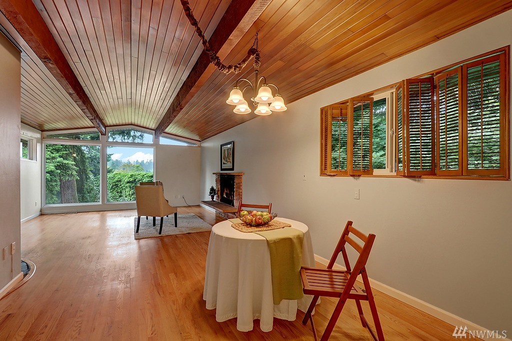 A mid century modern, 4 bedroom 1 and 3/4 bath home with great proximity to the city. Living room features walls of windows wood floors, wood wrapped vaulted ceiling & a wood burning fireplace. Dining room plus a kitchen eating space. Kitchen features a sliding glass door to the over sized deck, great for entertaining. 3 bedrooms up w/ a full sized bath. Downstairs large open rec rm w/ wood burning fireplace. Laundry rm, bedroom, plus a 3/4 bath. Lots of storage space. One car garage.