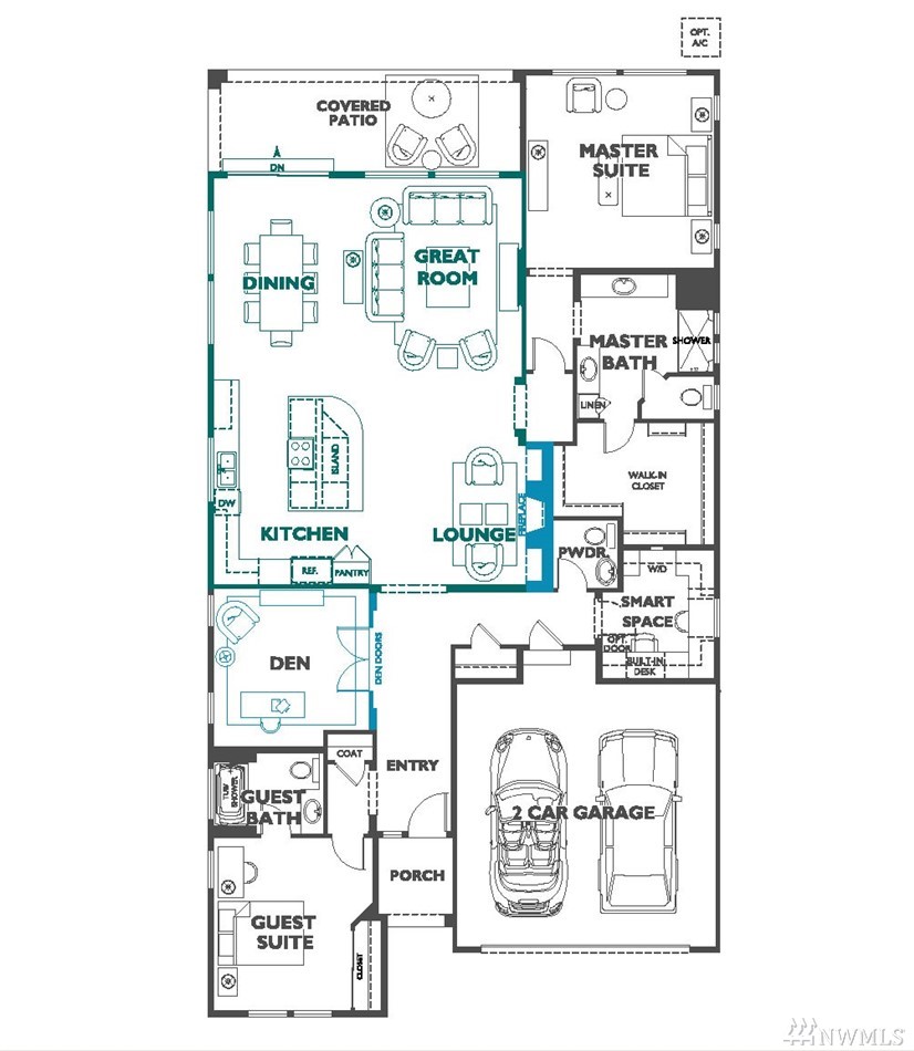 This Elate single story design floor plan features spacious covered patio, large kitchen island, interior fireplace, smart space, den, master suite with walk-in closet, lounge and, expansive great room. This 2 Bedroom 2.5 Bath floor plan exhibits open concept living. With time to still choose your design selections. Here is your chance to enjoy an active adult lifestyle in Pierce Counties growing community at Tehaleh.