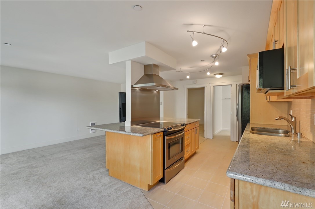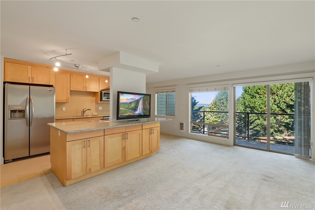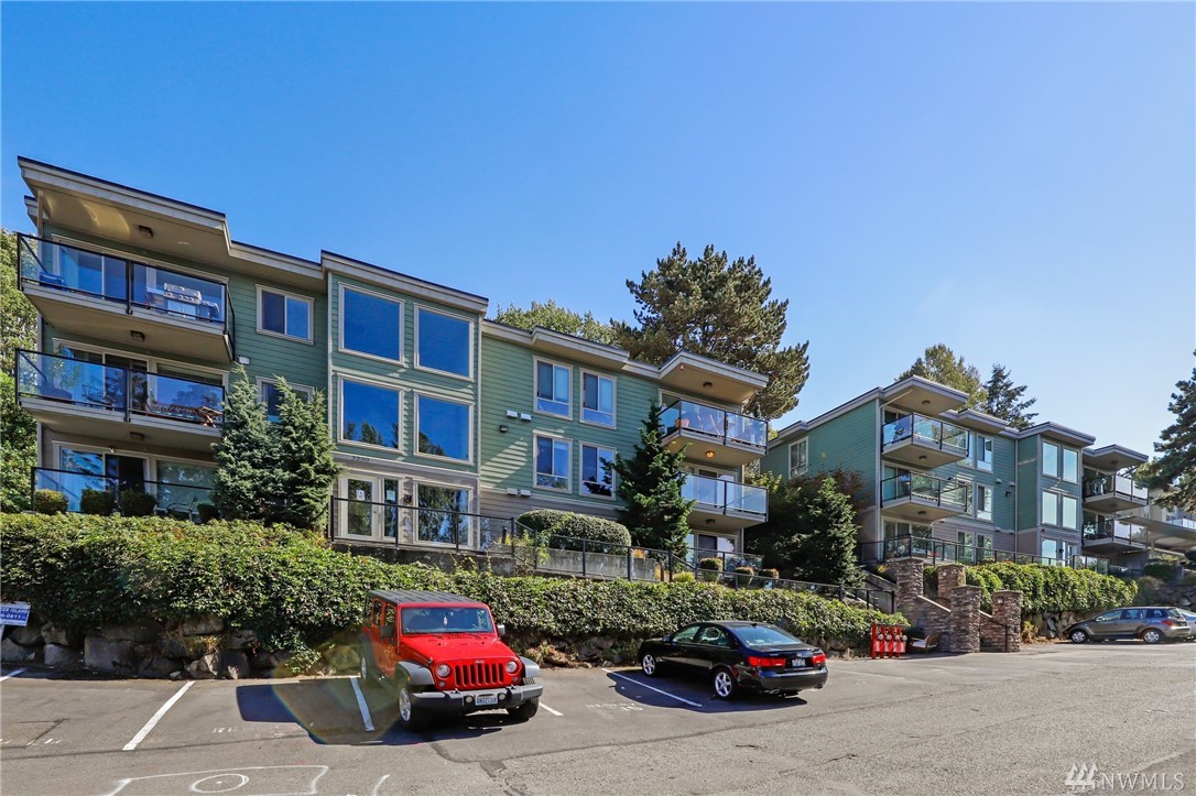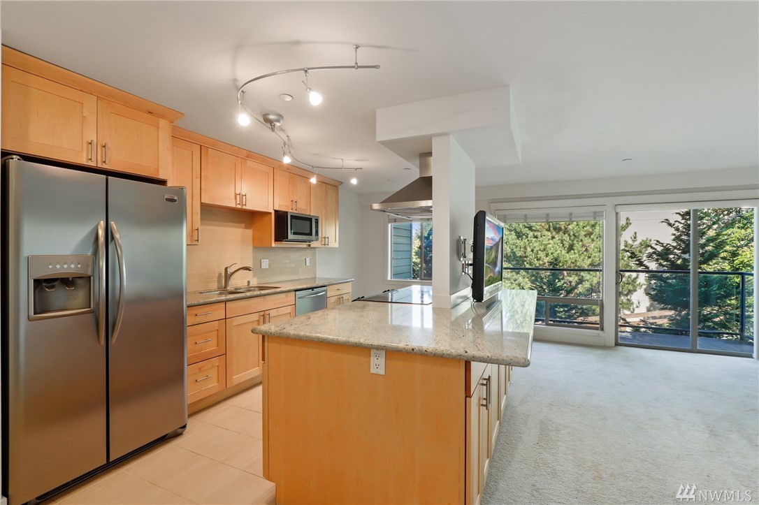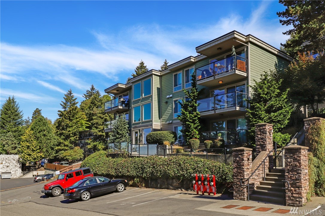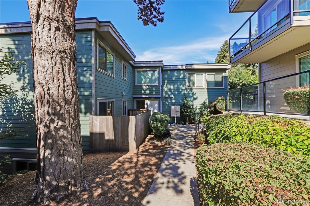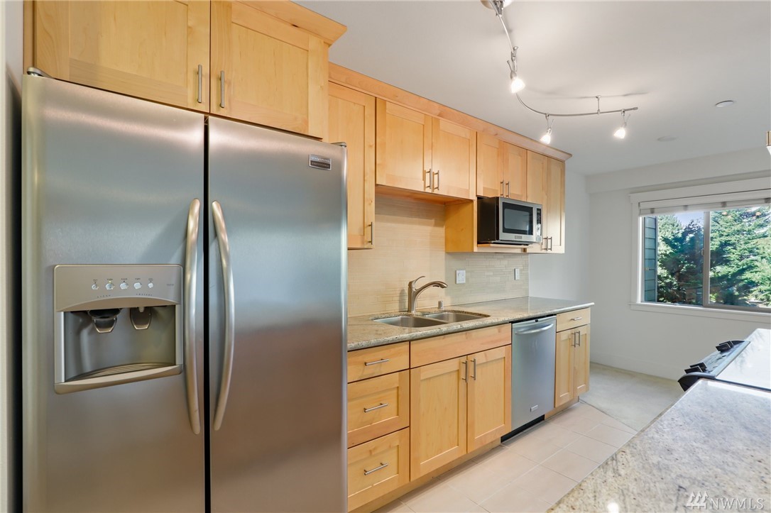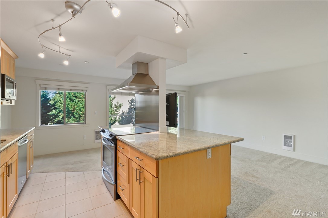 Quiet, end-unit in secure building w/private patio facing north & peek-a-boo Lake WA views. Home features open living / dining and fantastic designer kitchen w/large island, slab granite counters, maple cabinets & SS appliances. Ridgewood features a sparkling outdoor pool w/BBQ area, clubhouse, kitchen & meeting area. In-unit W/D. No stairs. Designated covered parking space close to entrance. Pet Friendly. NO RENTAL CAP. Prime location ; north-end. Vacant unit – easy to show!
