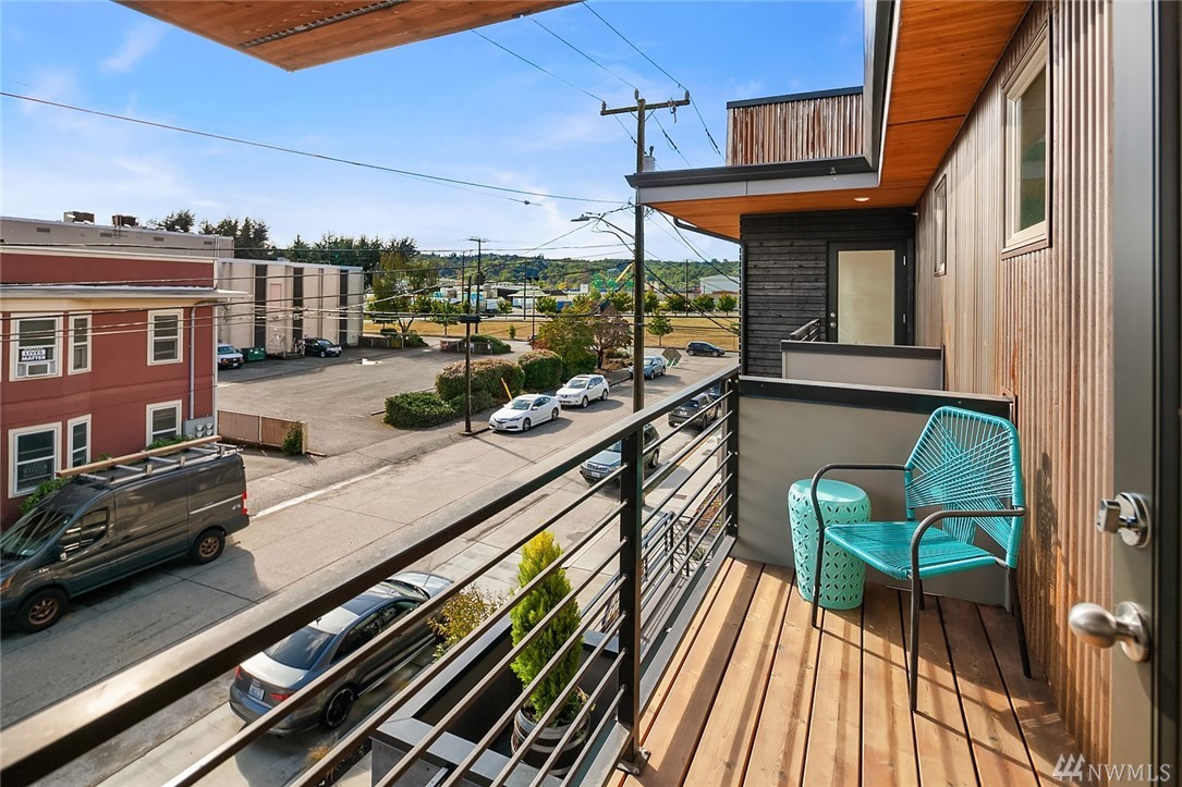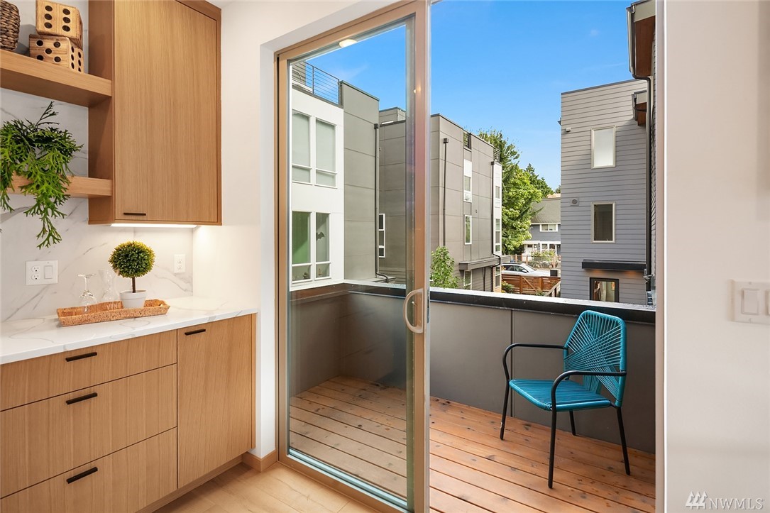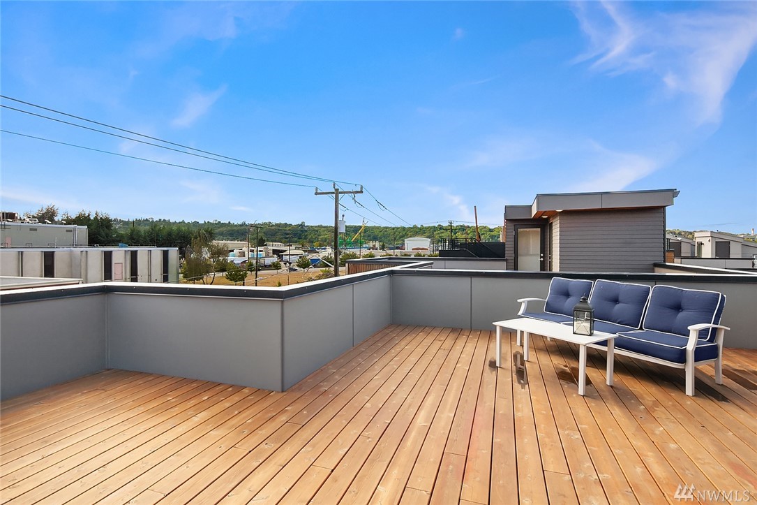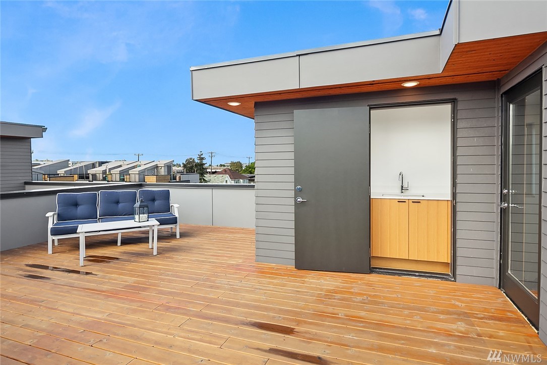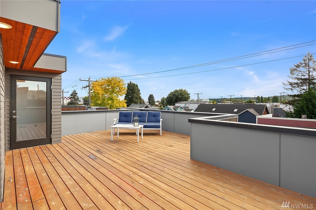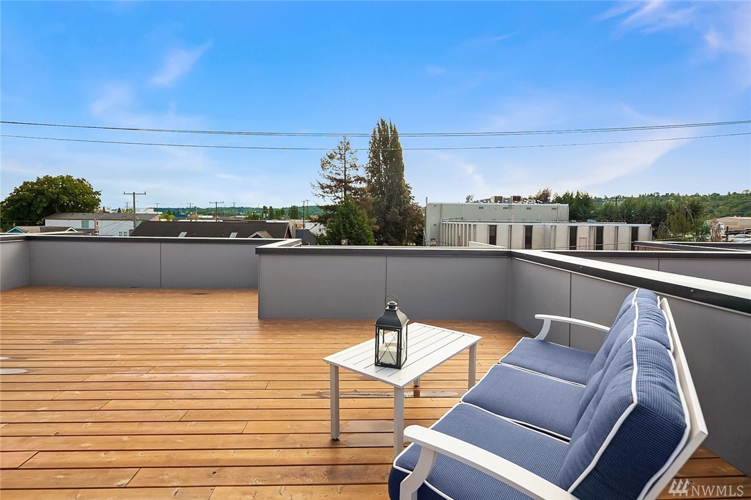 rooftop deck, live edge bathroom counters, ceiling fan, barn door, downtown view rooftop, 4-star Built Green, balcony off kitchen and master. wet bar on rooftop