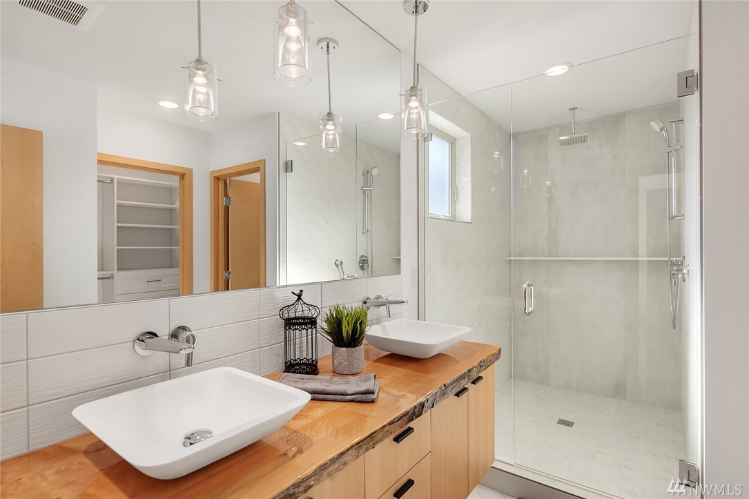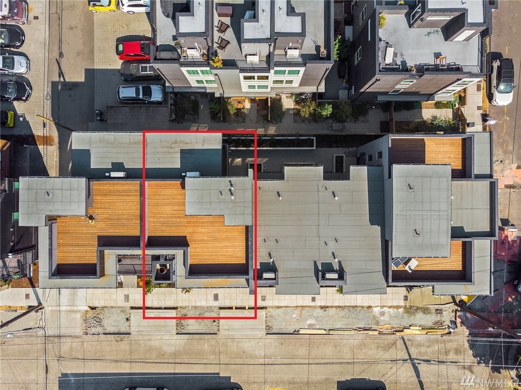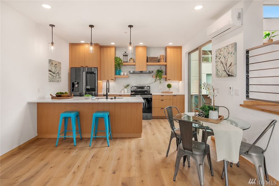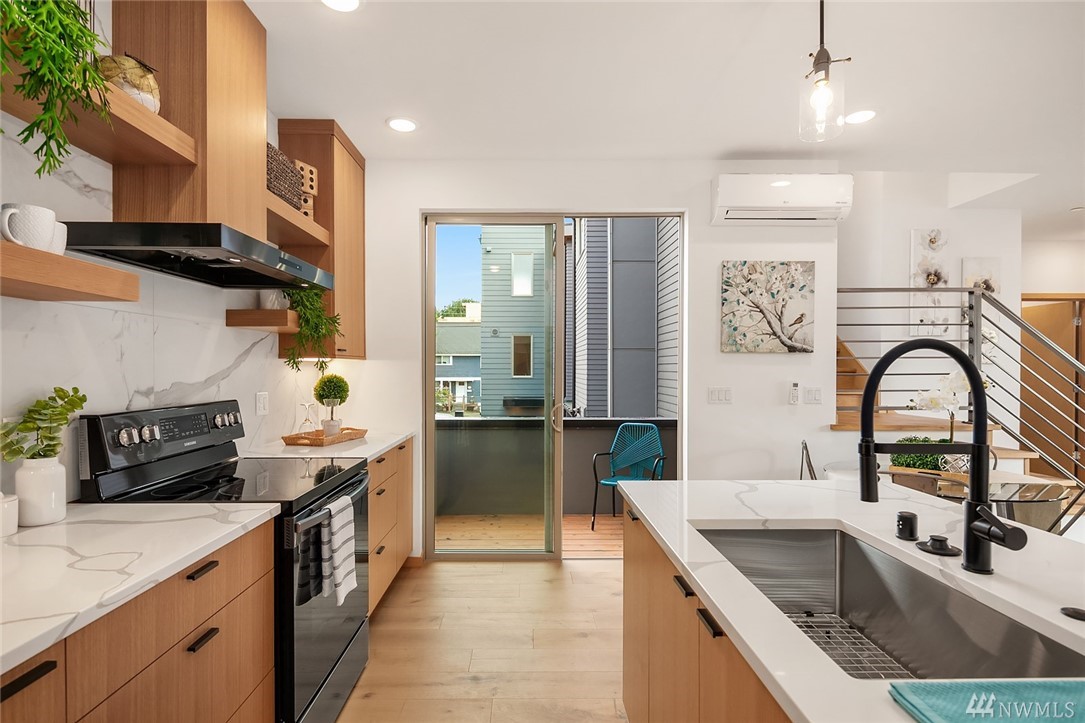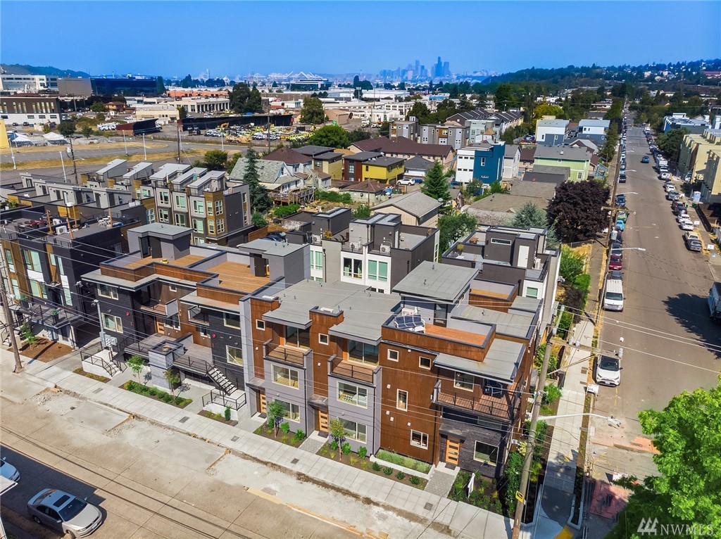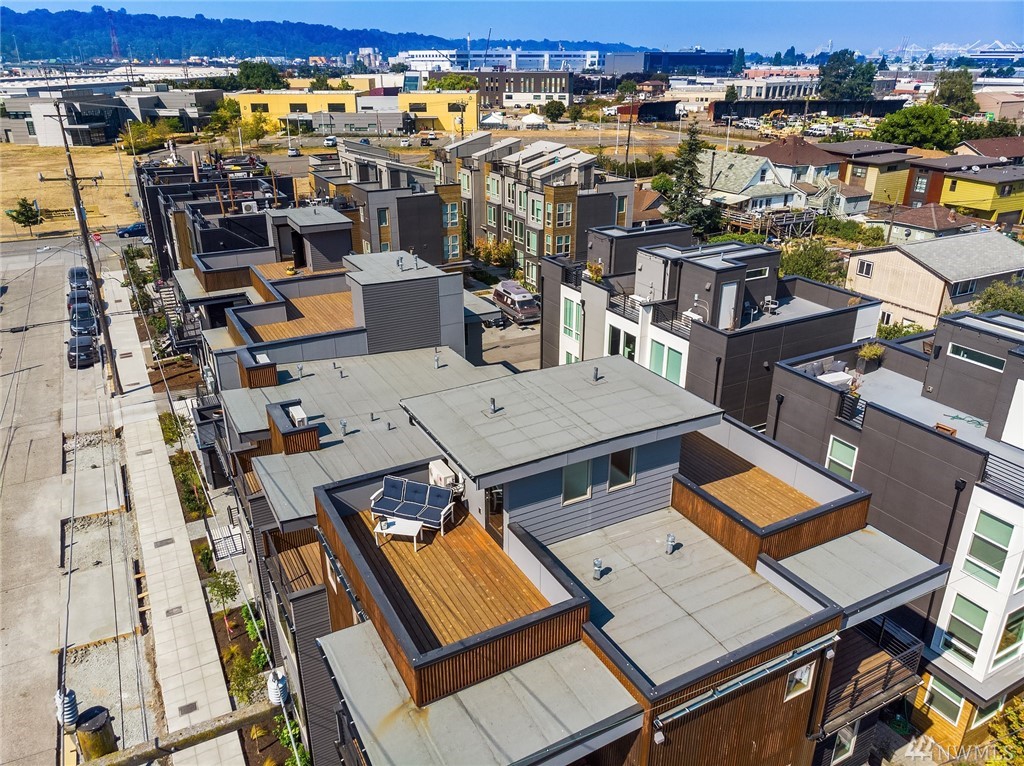 rooftop deck, live edge bathroom counters, ceiling fan, barn door, downtown view rooftop, 4-star Built Green, balcony off kitchen and master. wet bar on rooftop