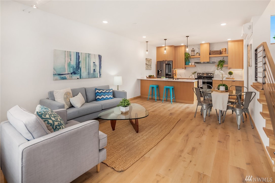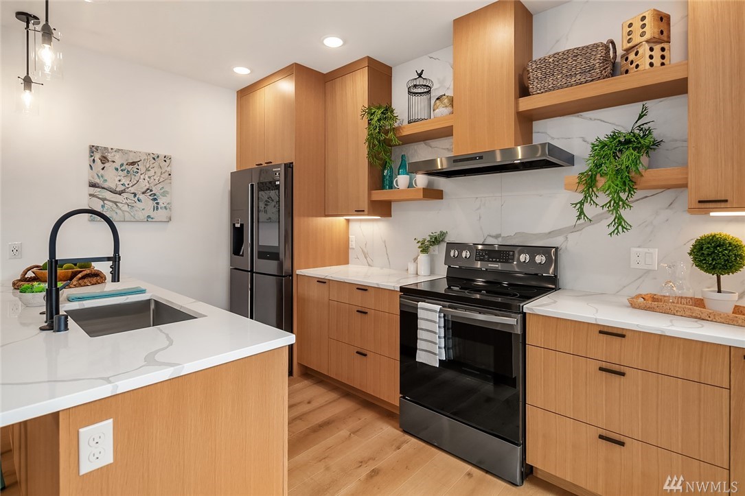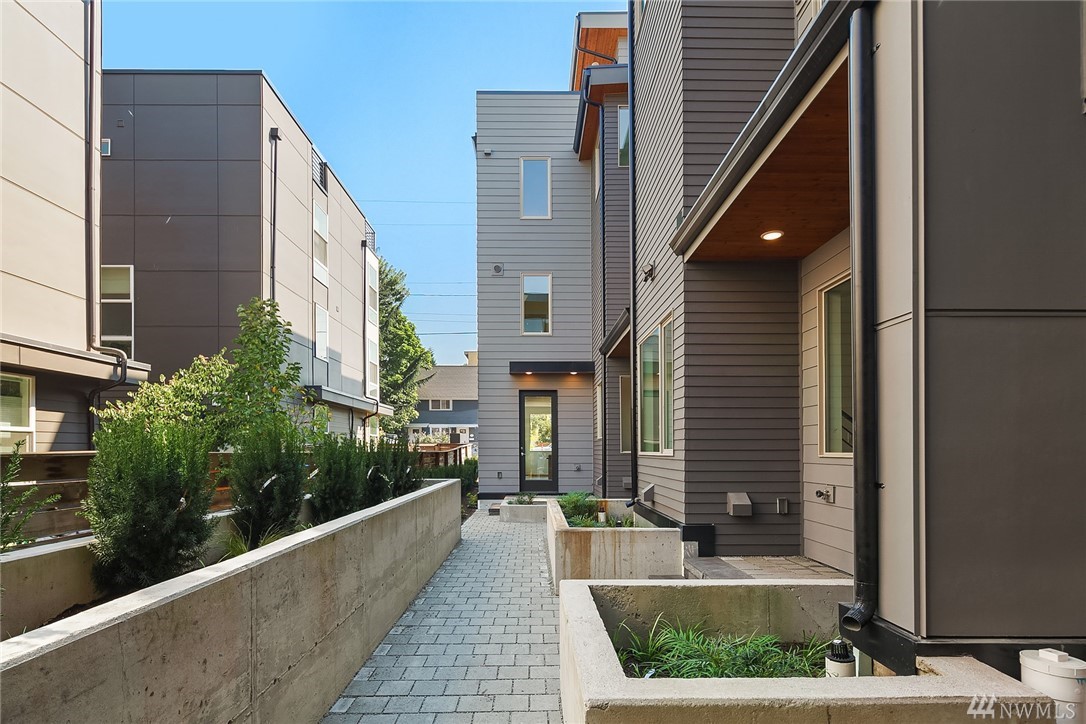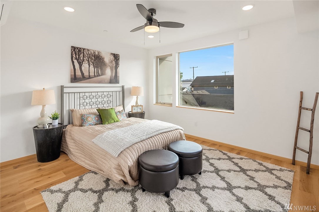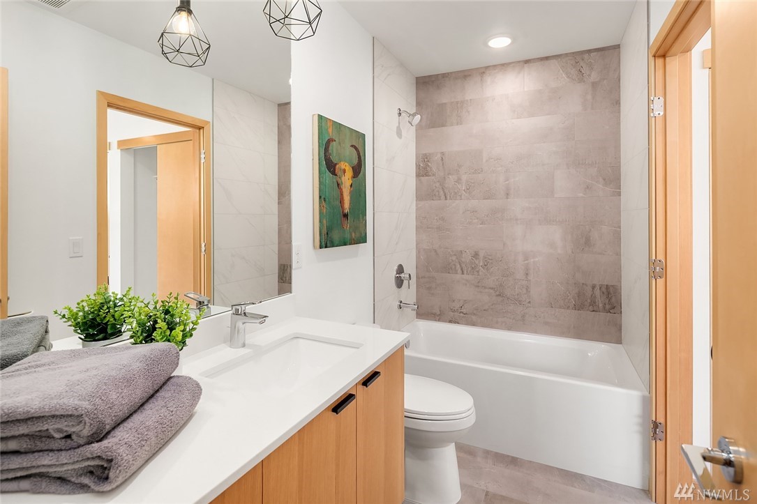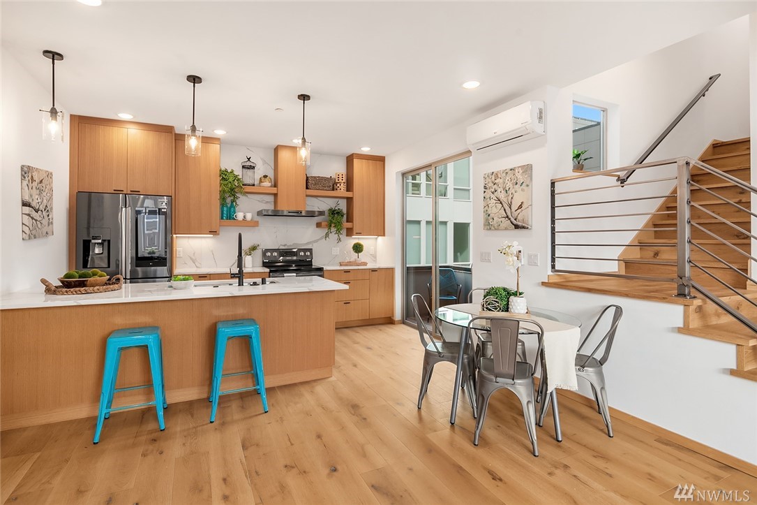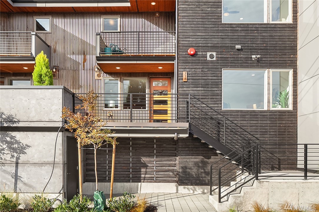rooftop deck, live edge bathroom counters, ceiling fan, barn door, downtown view rooftop, 4-star Built Green, balcony off kitchen and master. wet bar on rooftop