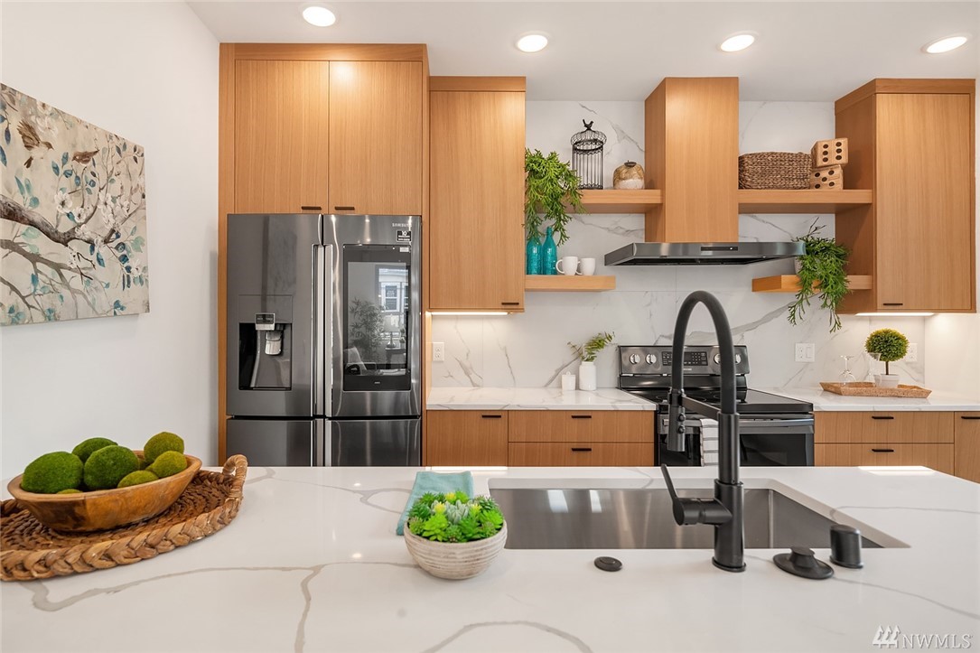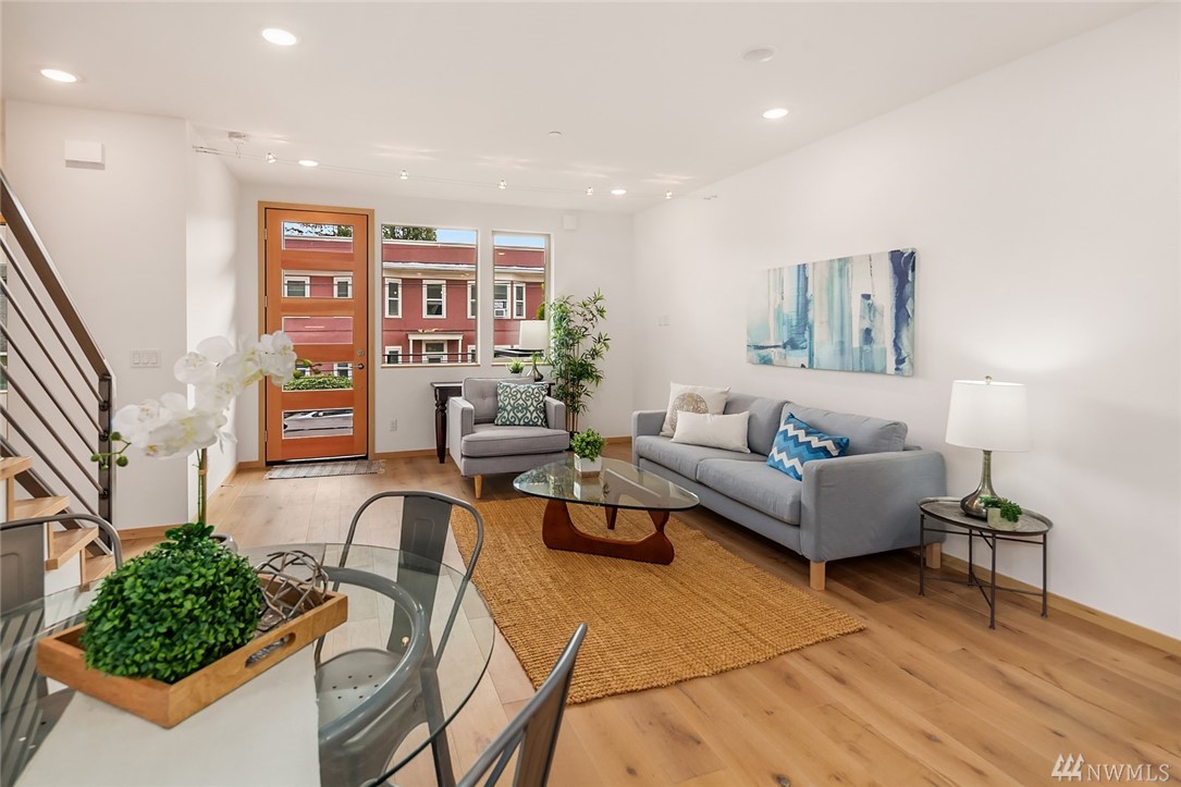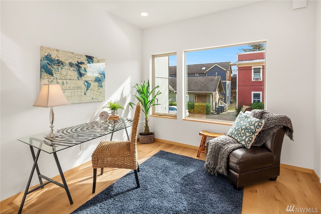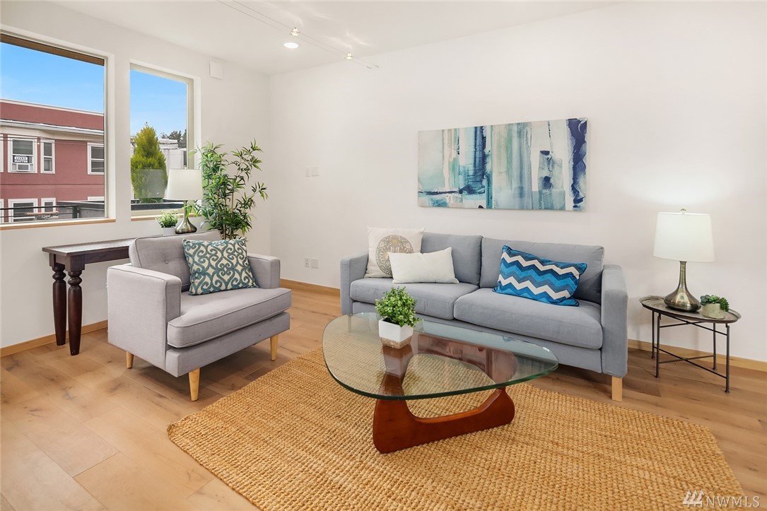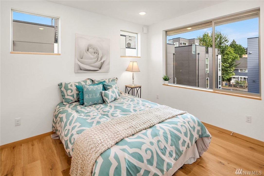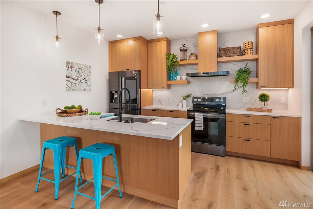 rooftop deck, live edge bathroom counters, ceiling fan, barn door, downtown view rooftop, 4-star Built Green, balcony off kitchen and master. wet bar on rooftop