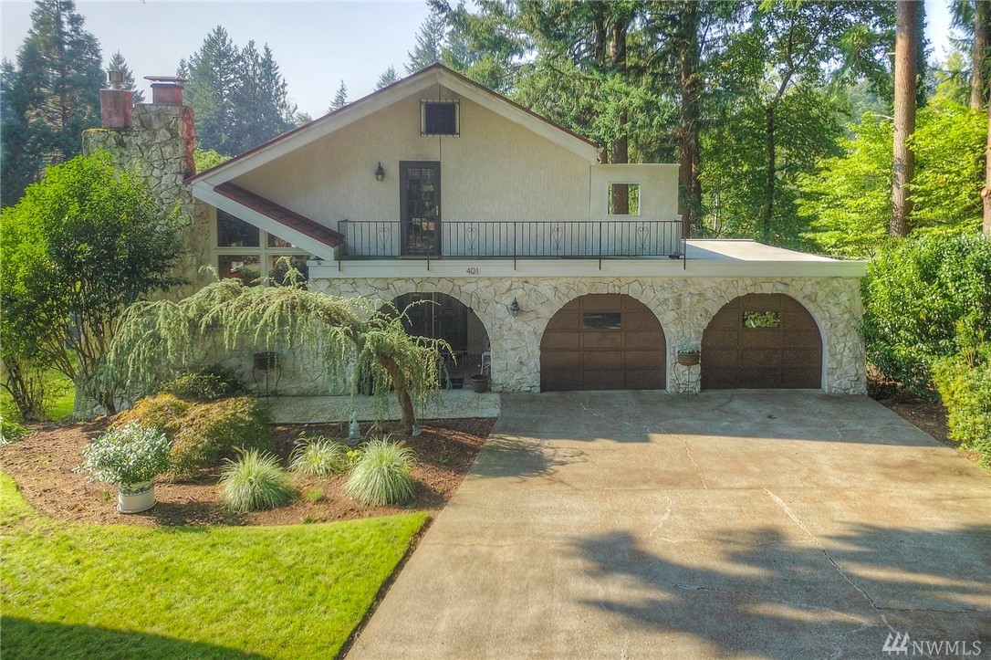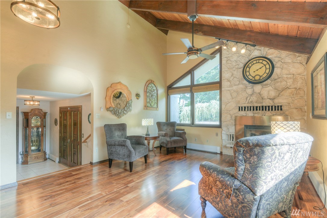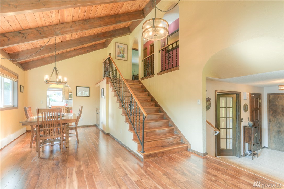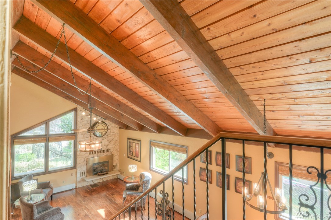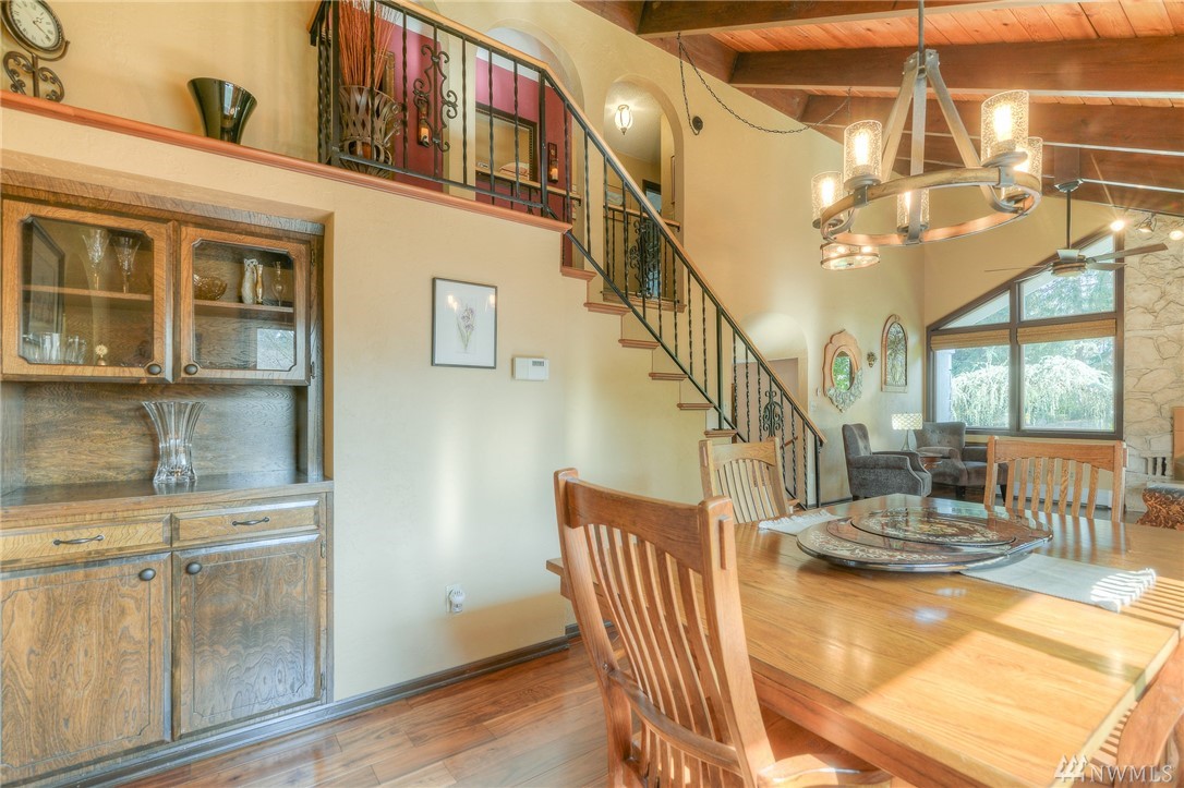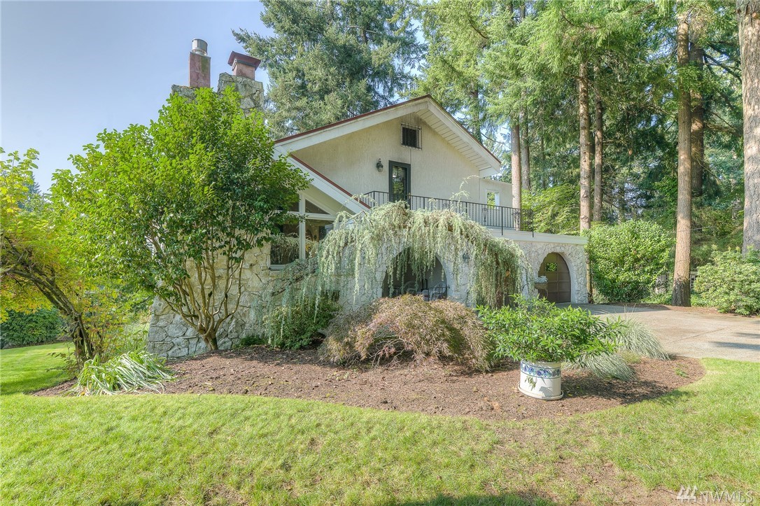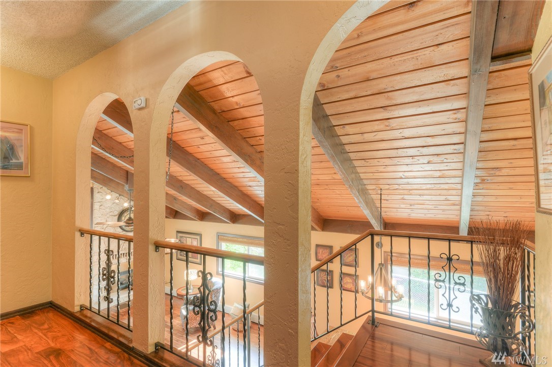 Tons of character in this Spanish Contemporary home. Wood accents include exposed beams & ceiling, wrapped windows, flooring, panel doors & an elegant staircase w/wrought iron. Interior features: solarium (+335 heated sq feet), double oven, stone gas fireplace, pendant lighting, french doors, laundry chute, ceiling fans, wet bar in daylight basement. Private lot w/back deck, sprinkler system, RV parking, 2 tiered backyard w/greenspace behind & access to the Chehalis Western Trail.
