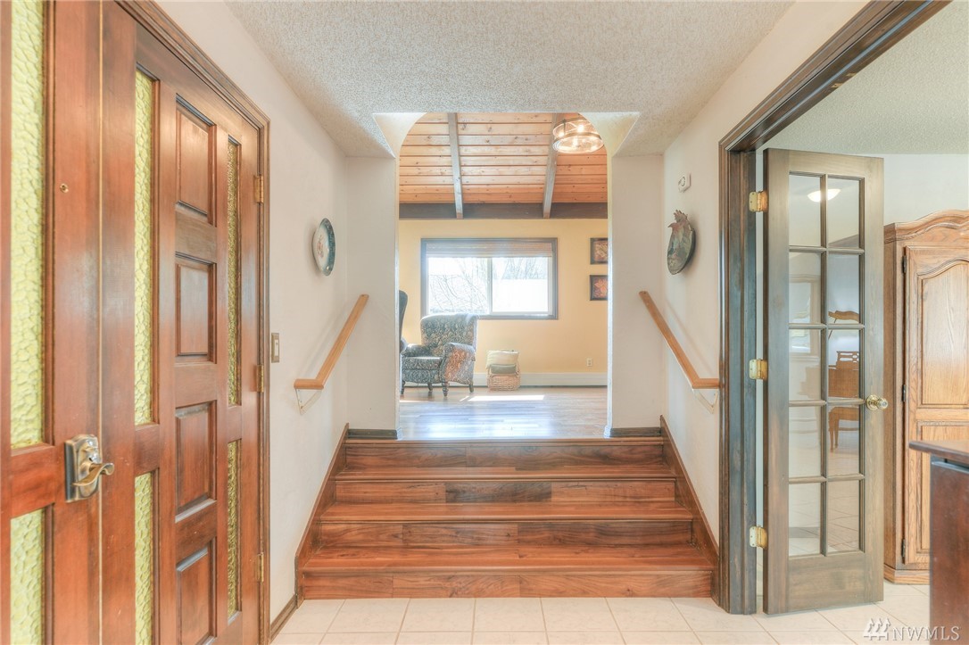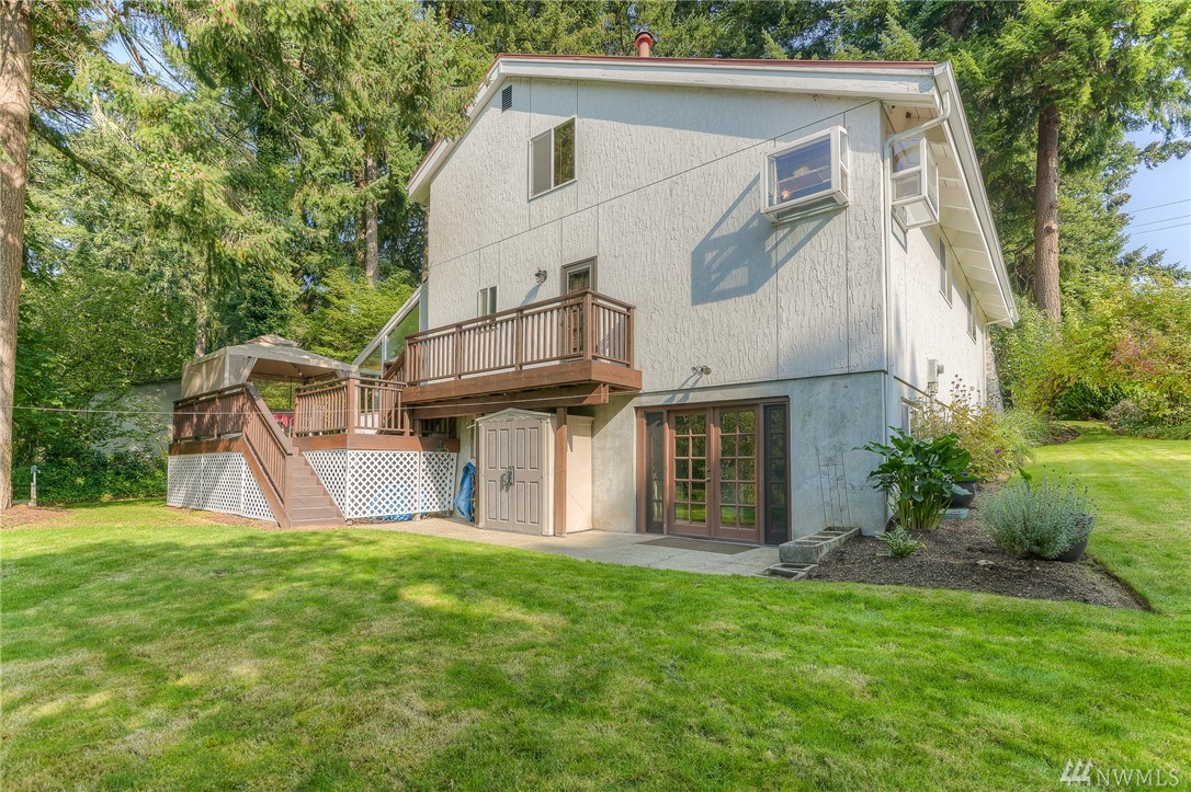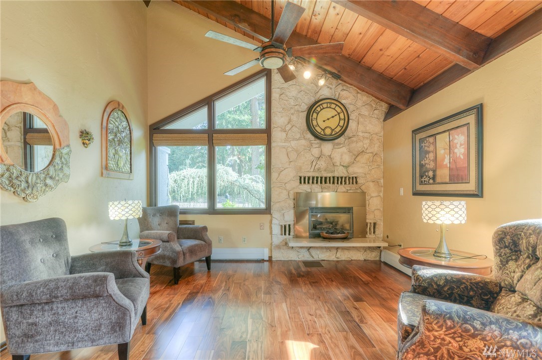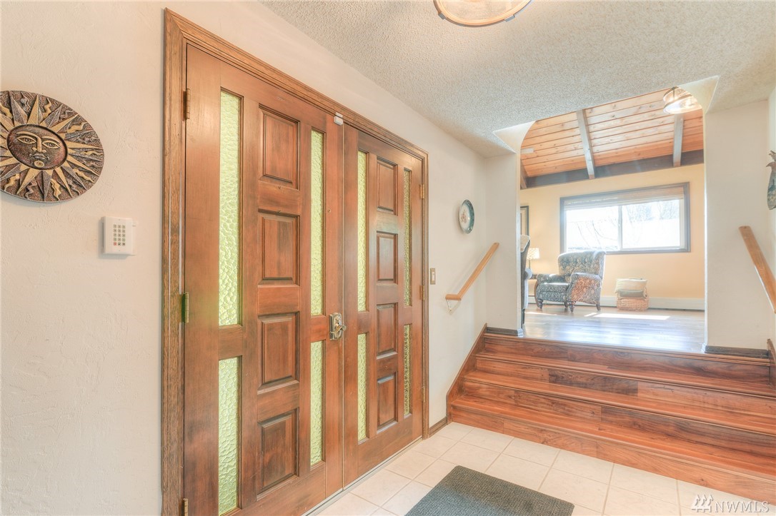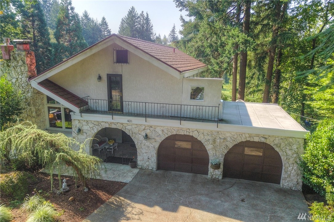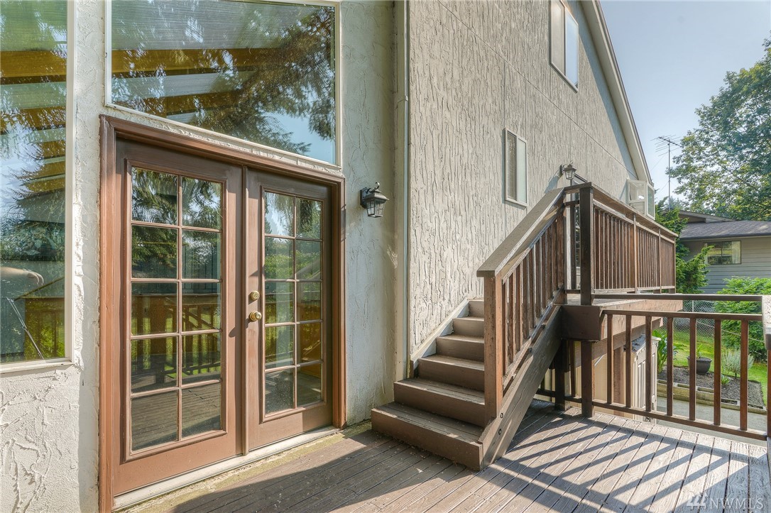 Tons of character in this Spanish Contemporary home. Wood accents include exposed beams & ceiling, wrapped windows, flooring, panel doors & an elegant staircase w/wrought iron. Interior features: solarium (+335 heated sq feet), double oven, stone gas fireplace, pendant lighting, french doors, laundry chute, ceiling fans, wet bar in daylight basement. Private lot w/back deck, sprinkler system, RV parking, 2 tiered backyard w/greenspace behind & access to the Chehalis Western Trail.