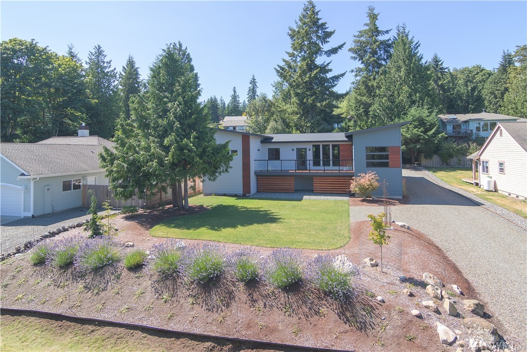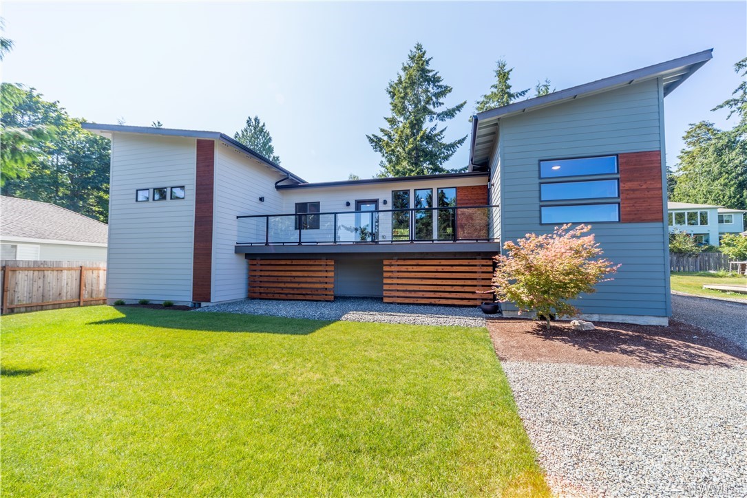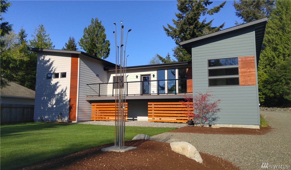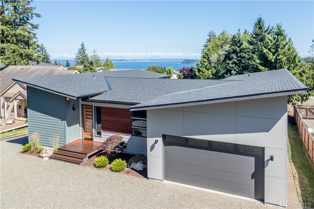 Stunning NW contemporary view home in North Bay community. Move in ready, one story, open concept floor plan seamlessly flows with large deck for entertaining and enjoying the views! Watch the spectacular sunrises over the Cascade Mountains and Puget Sound. Energy efficient design, high-quality details, upgraded kitchen,office and storage throughout! Custom features include facade update, interior custom finishes and yard sculpture. Beach club membership w/pool, pickle ball courts, and more!