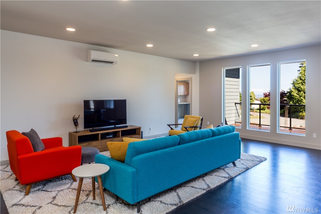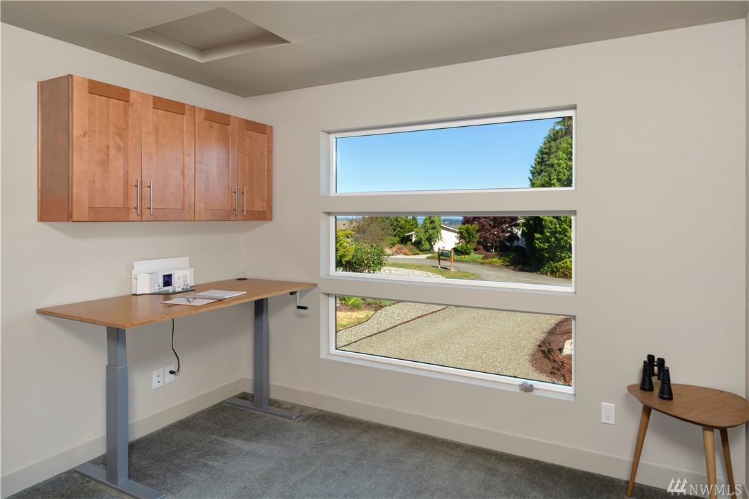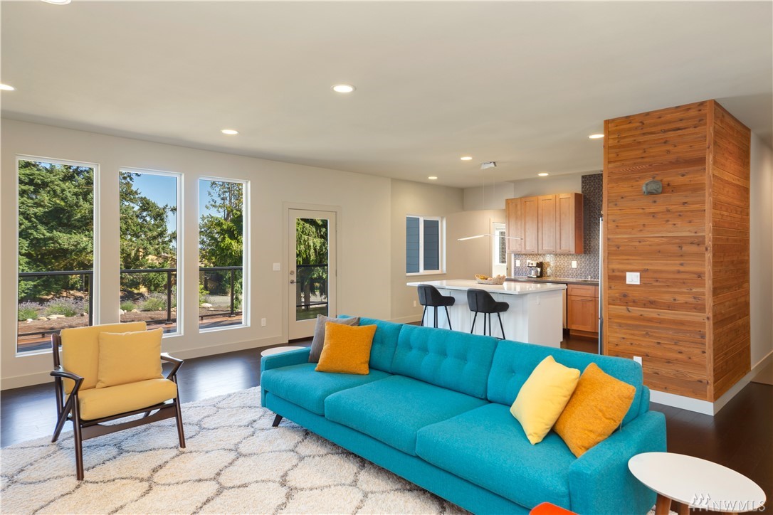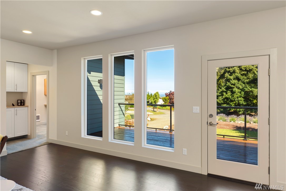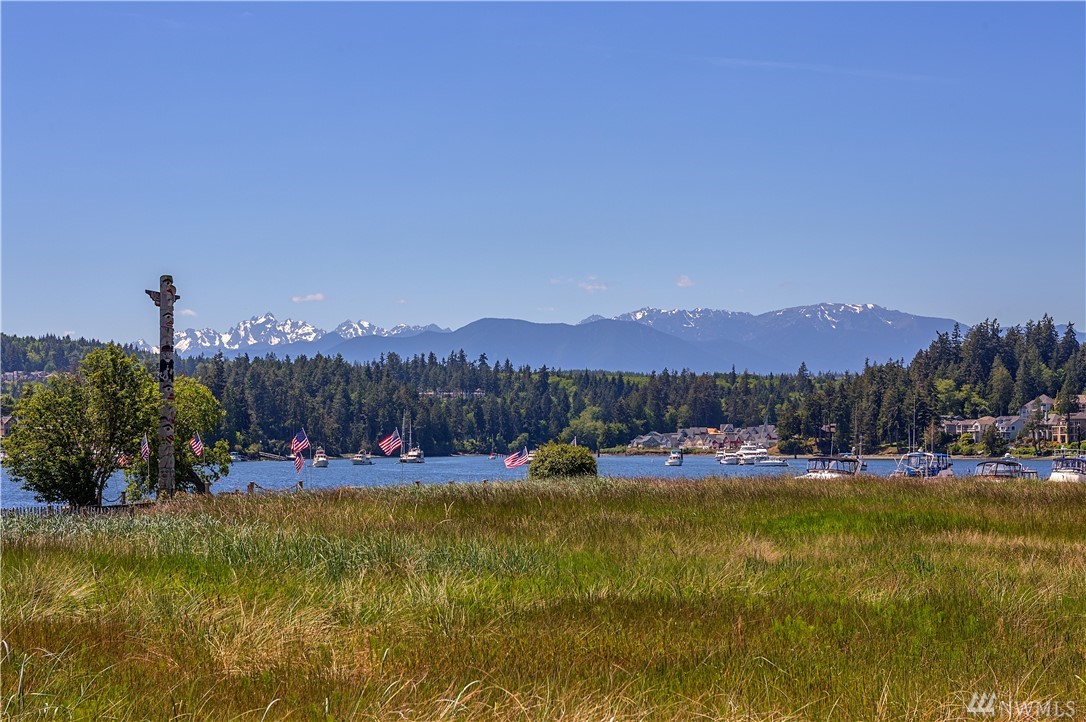 Stunning NW contemporary view home in North Bay community. Move in ready, one story, open concept floor plan seamlessly flows with large deck for entertaining and enjoying the views! Watch the spectacular sunrises over the Cascade Mountains and Puget Sound. Energy efficient design, high-quality details, upgraded kitchen,office and storage throughout! Custom features include facade update, interior custom finishes and yard sculpture. Beach club membership w/pool, pickle ball courts, and more!