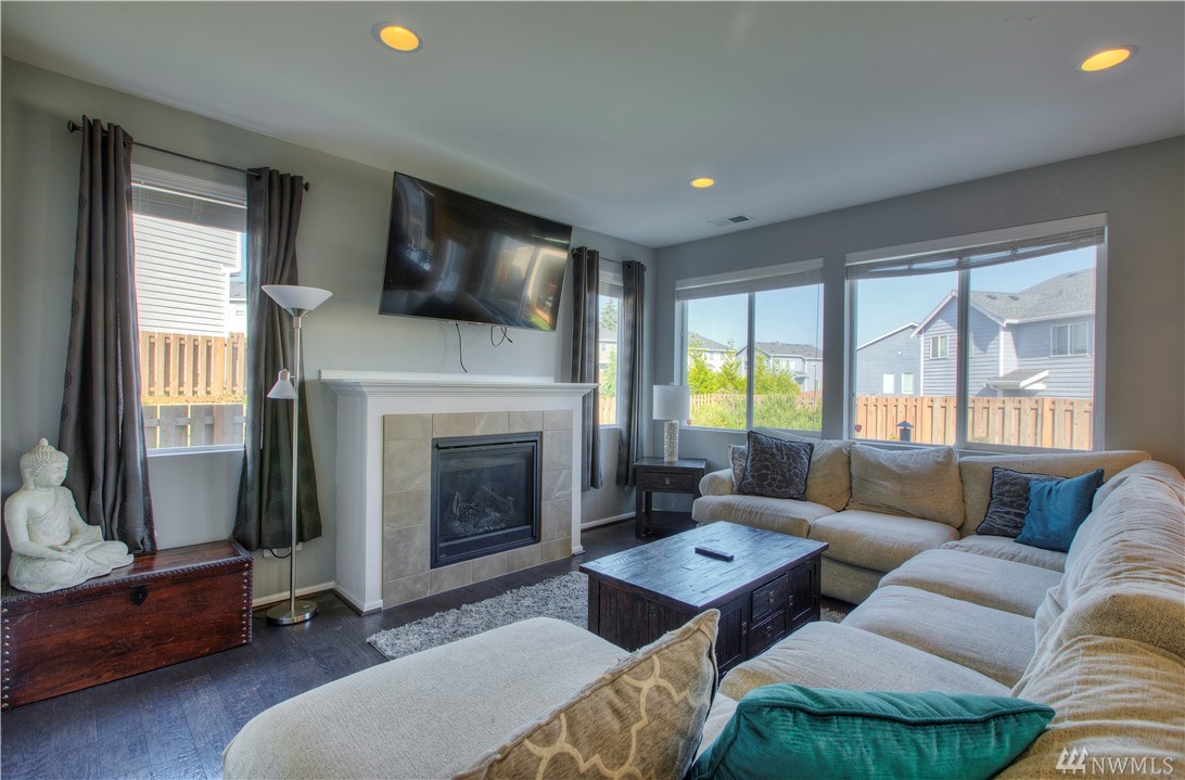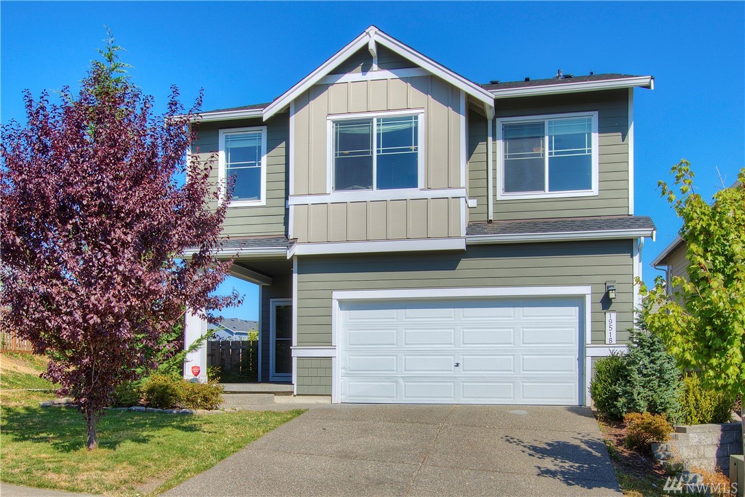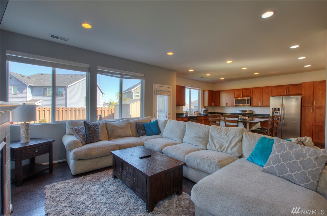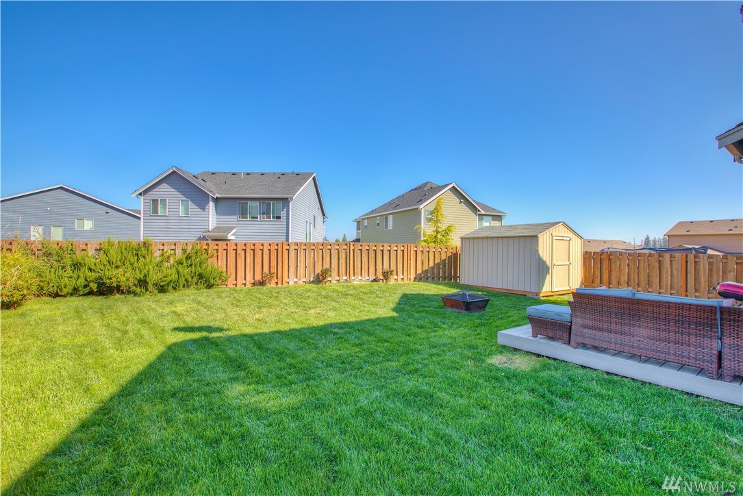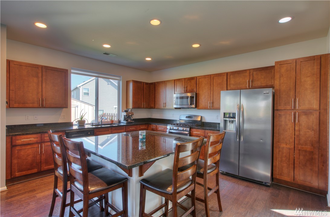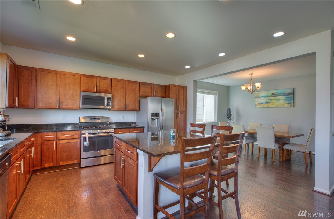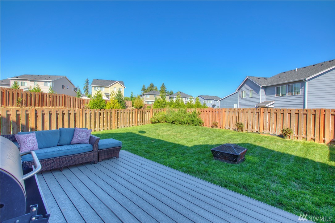 Excellent condition home in Ridgeview Estates w/upstairs Rainier views! Wide open floor plan w/high ceilings, natural light, & engineered hardwoods. Huge kitchen includes gas range, stainless appliances, & gigantic granite island. This beautiful home has fresh paint thruout & professionally cleaned carpets, & also features a fully fenced yard, large deck, & outdoor sprinkler system. Most importantly, AC! Friendly neighborhood also has many parks & playgrounds in addition to your large backyard!