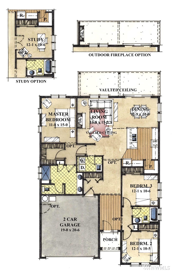 Woods Point Gated Active Adult Community - for those age 55 & better! Maintained yards by HOA! This Landed Gentry built Timberland 1709 floorplan, has 2 bedrooms + study & 2 baths. Vaulted ceilings through the open concept living, kitchen, & dining areas. Beautiful granite counters & eng. hardwood; fireplace, 2 car garage, covered front porch, covered outdoor patio with fireplace.