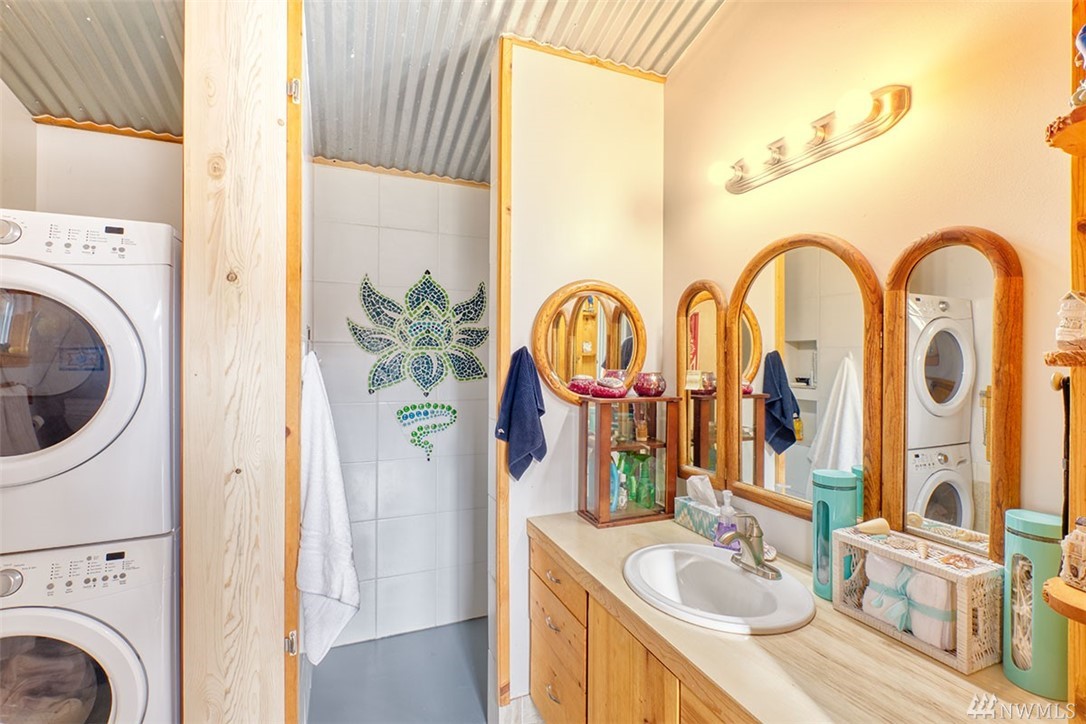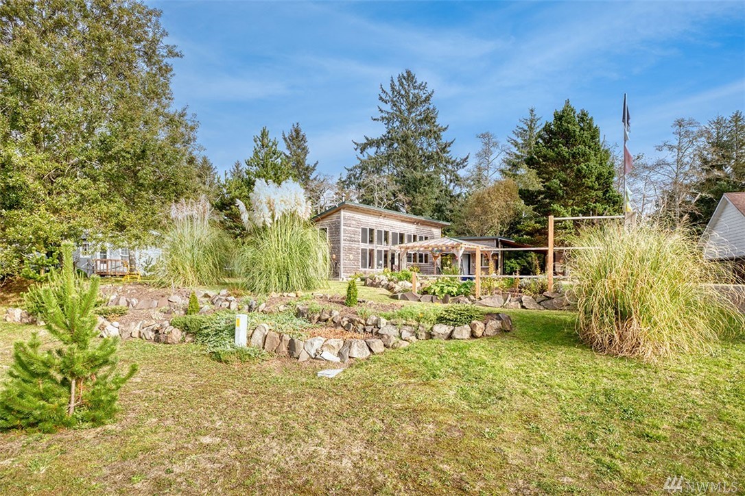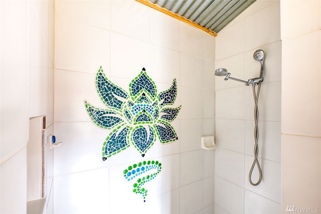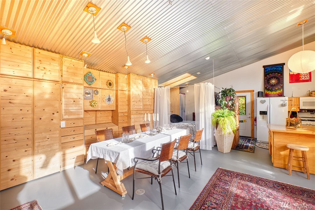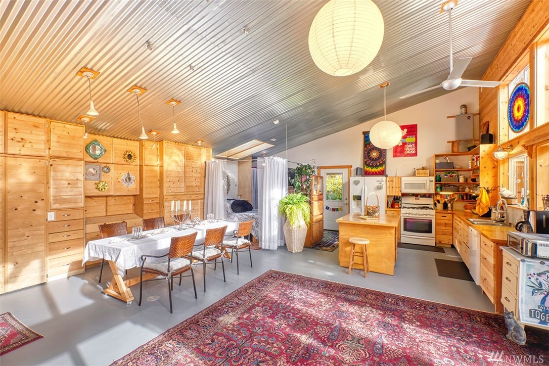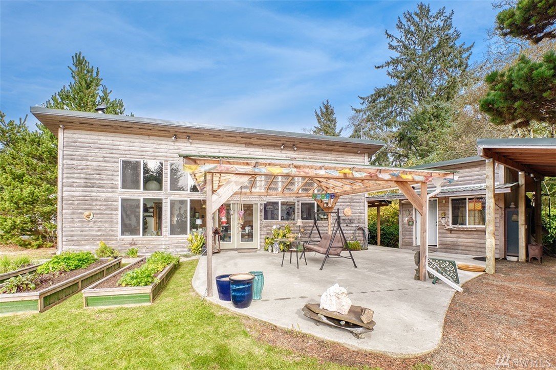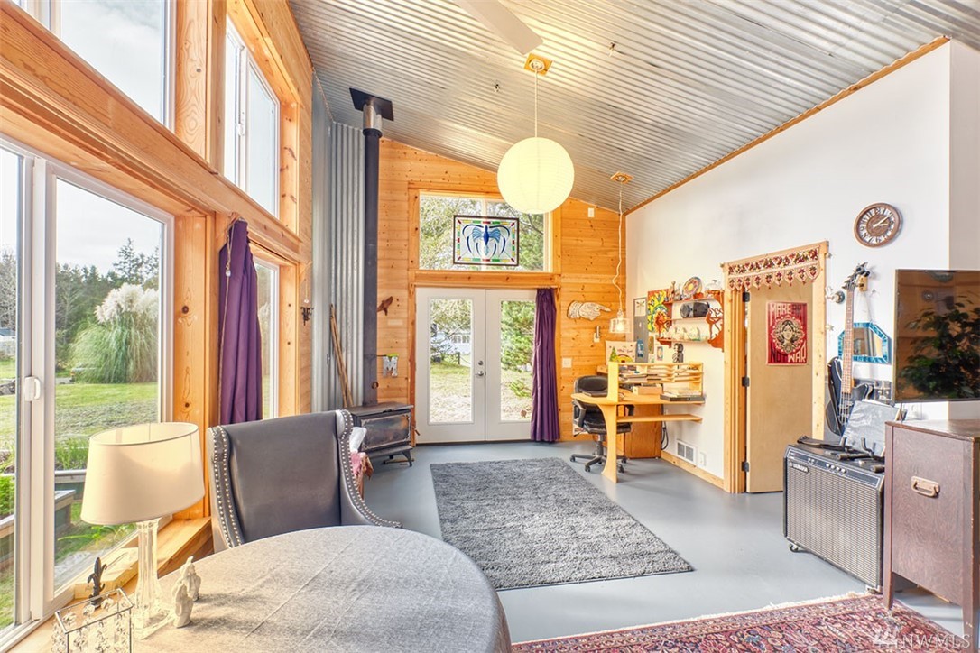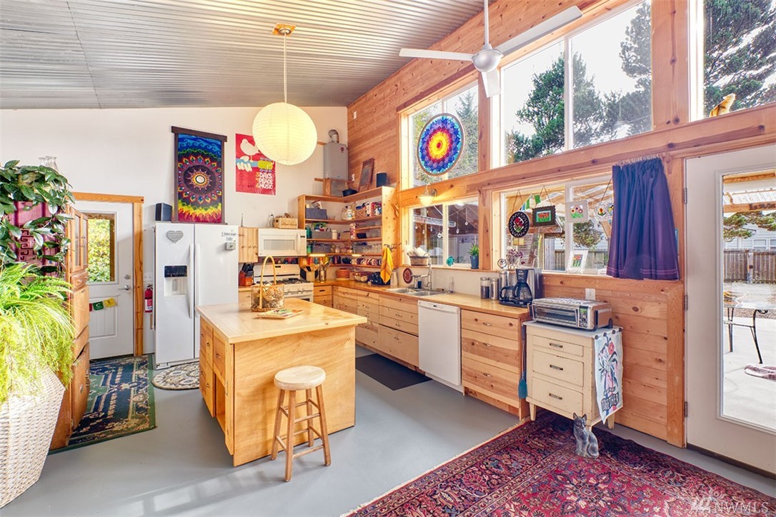 Unique custom home. Concrete floor, plentiful windows, skylights, French doors, and metal ceiling. Kitchen has many drawers and pull-out cabinets. Custom-designed wood cabinets maximize storage along back wall. Wood burning stove for the cold weather. Out the back door is an outdoor shower. Sidewalk to 1 bedroom cabin. Covered carport leads to a shop. Large gazebo for outdoor entertainment. Plenty of garden boxes for you to plant, spacious yard. Room for RV, Tankless hot water systems.