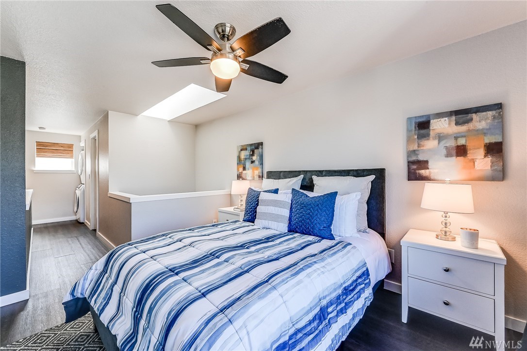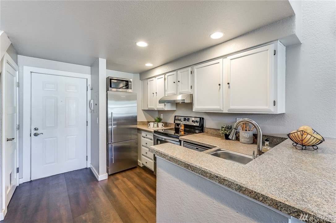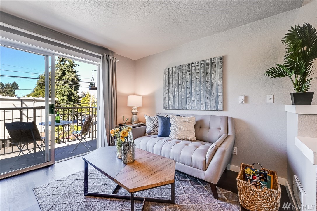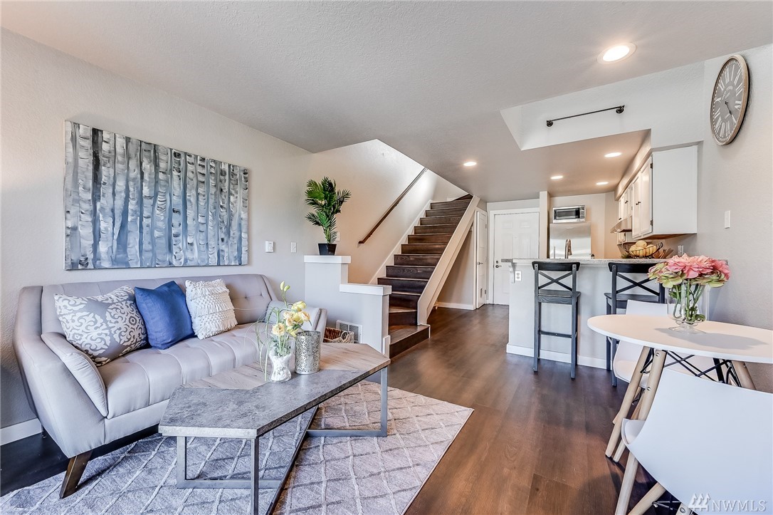 This light and bright 1 bed/ 1 bath unit is perfectly located within minutes of downtown Seattle. You will love the location and stylish floorplan of this 2 level home! Features include: Kitchen w/stainless appliances + pantry, vinyl plank flooring throughout, a master suite area w/ a full bath w/subway tile, large closet, wainscot & modern lighting. Includes a new full size washer & dryer. Secure entrance, assigned secure parking & a large secure storage locker. Walk out your door to the Interurban Trail, or Bitter Lake Park for recreation. On bus line and close to upcoming light rail. No Rental Cap and Low Dues make this a great place to call home.