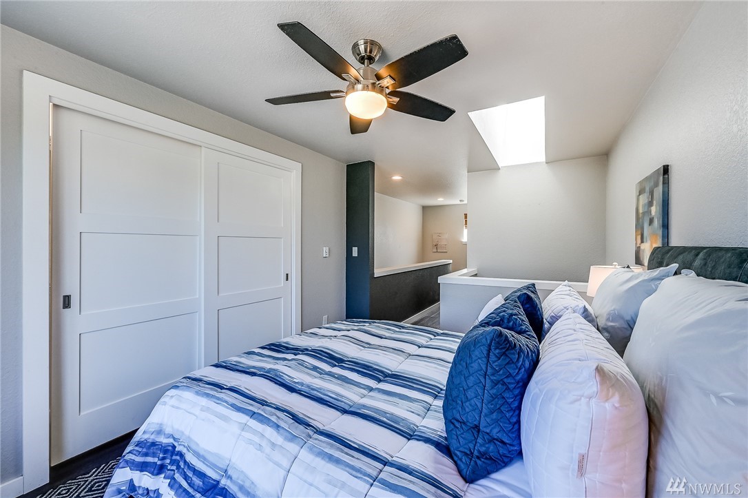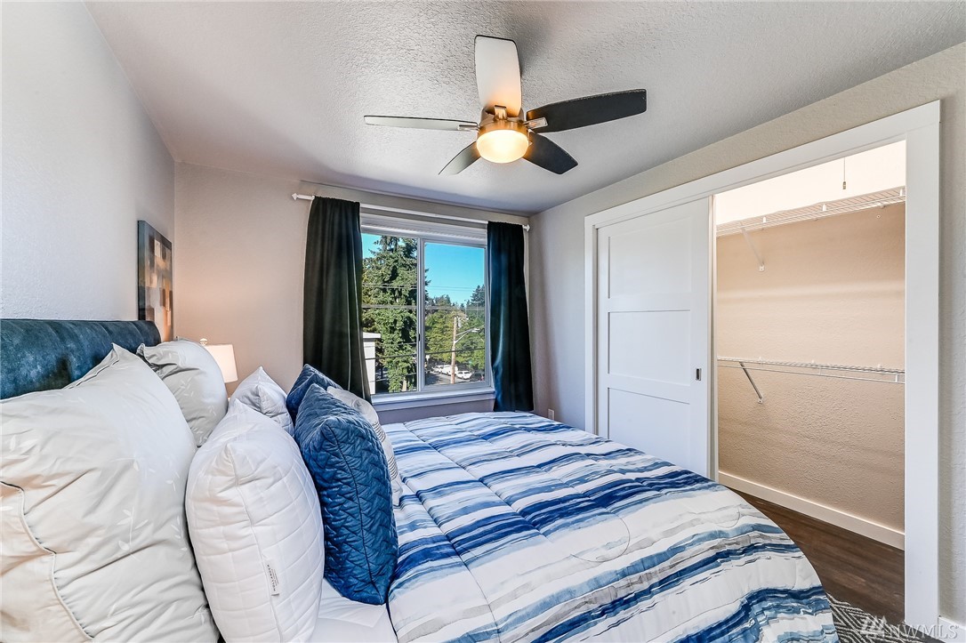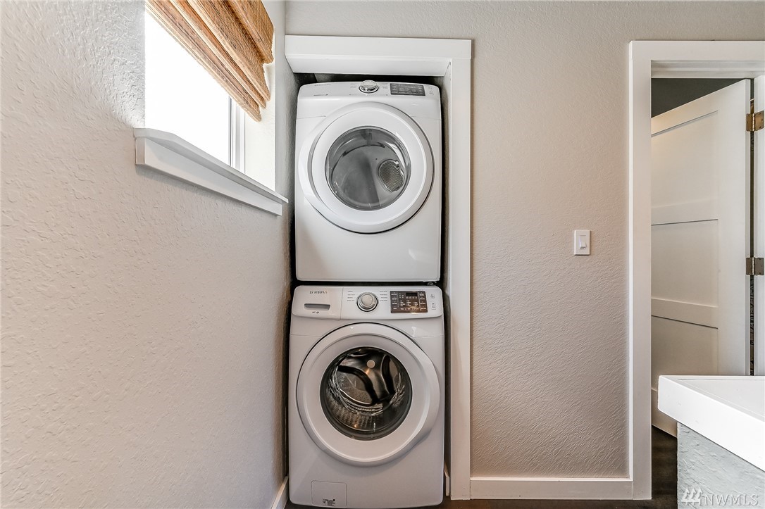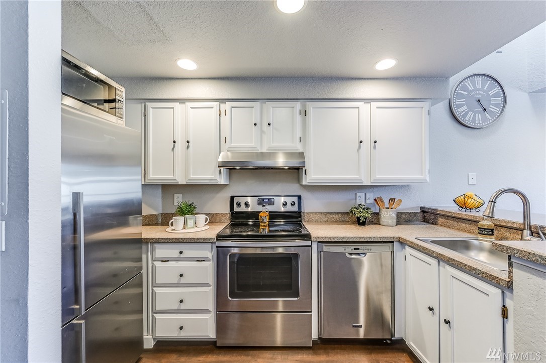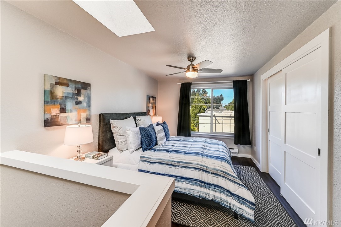 This light and bright 1 bed/ 1 bath unit is perfectly located within minutes of downtown Seattle. You will love the location and stylish floorplan of this 2 level home! Features include: Kitchen w/stainless appliances + pantry, vinyl plank flooring throughout, a master suite area w/ a full bath w/subway tile, large closet, wainscot & modern lighting. Includes a new full size washer & dryer. Secure entrance, assigned secure parking & a large secure storage locker. Walk out your door to the Interurban Trail, or Bitter Lake Park for recreation. On bus line and close to upcoming light rail. No Rental Cap and Low Dues make this a great place to call home.