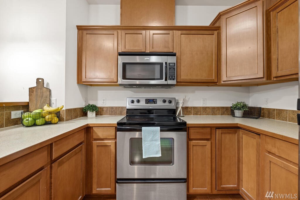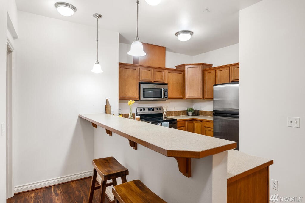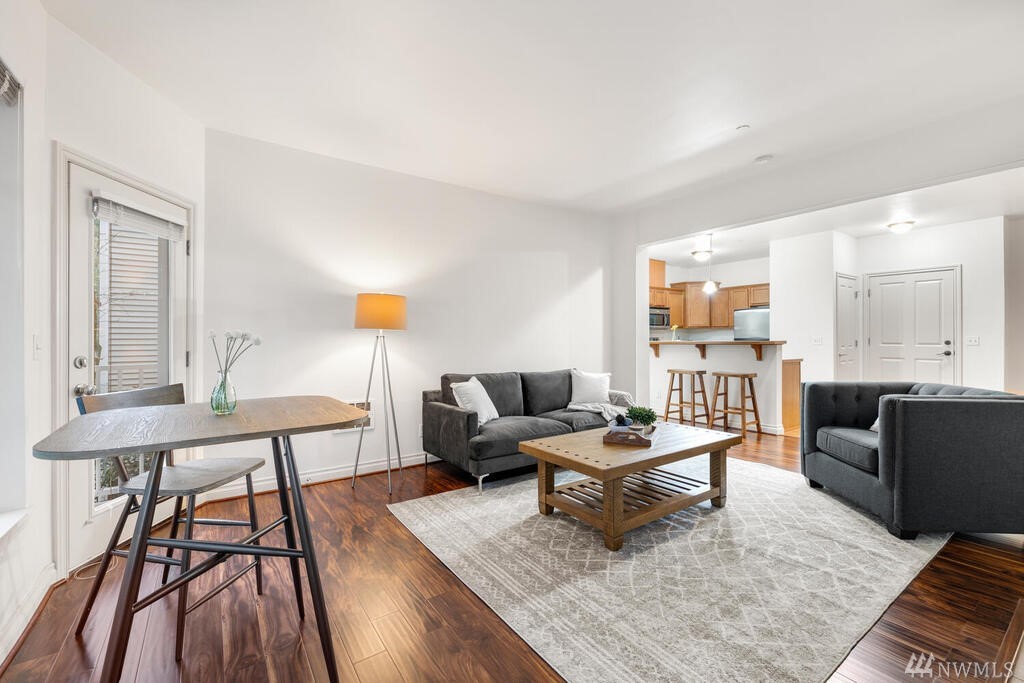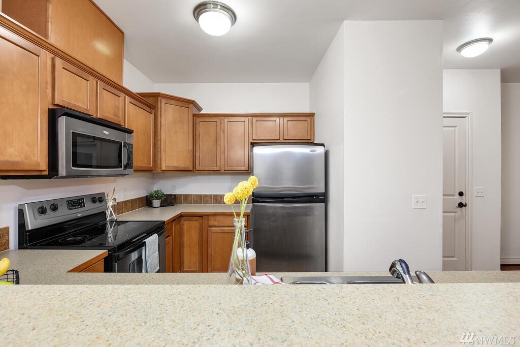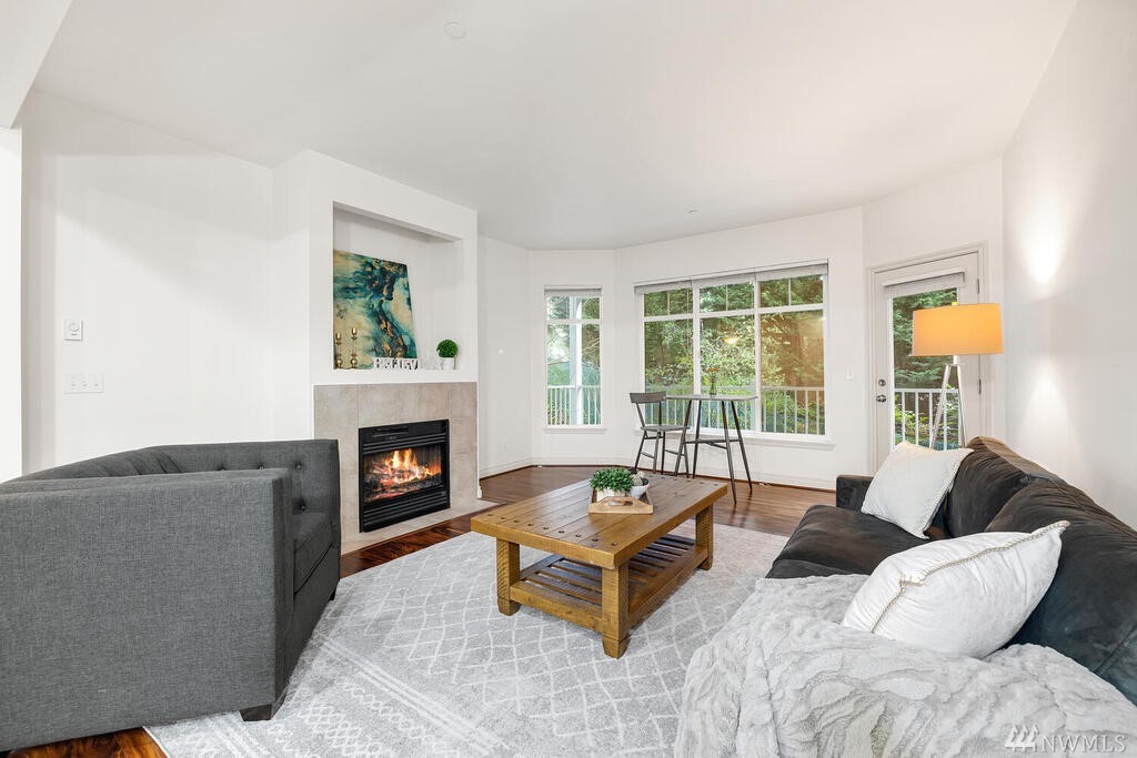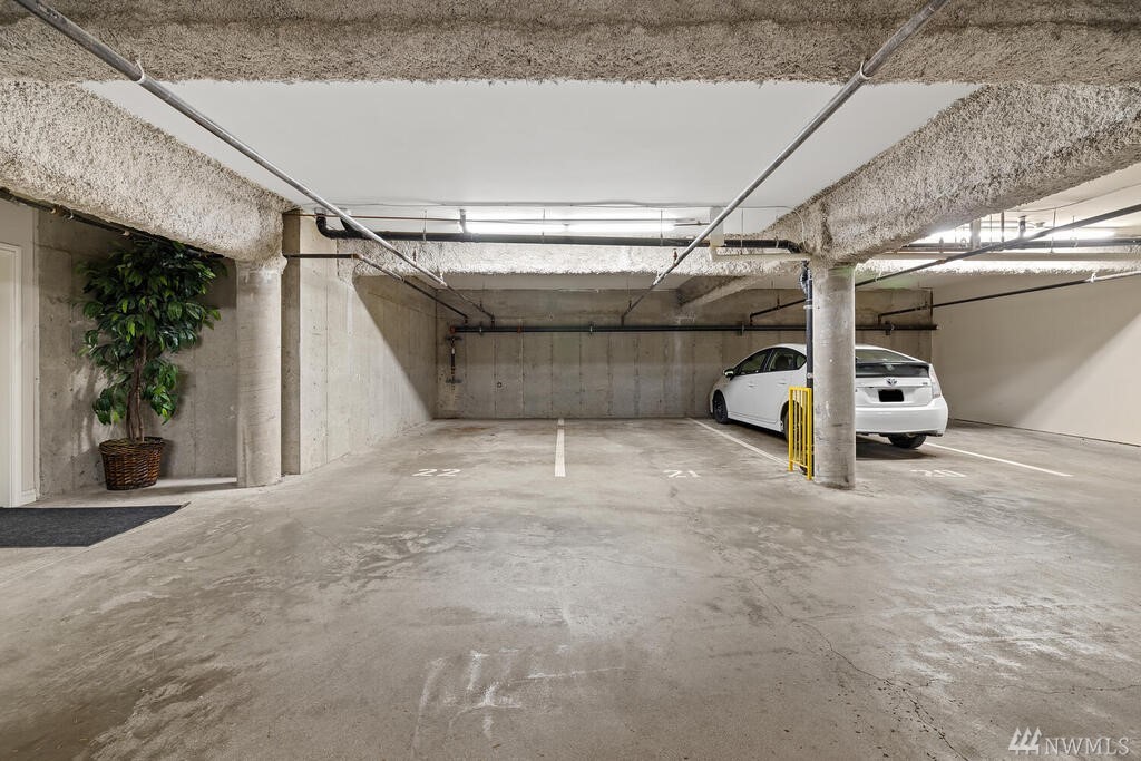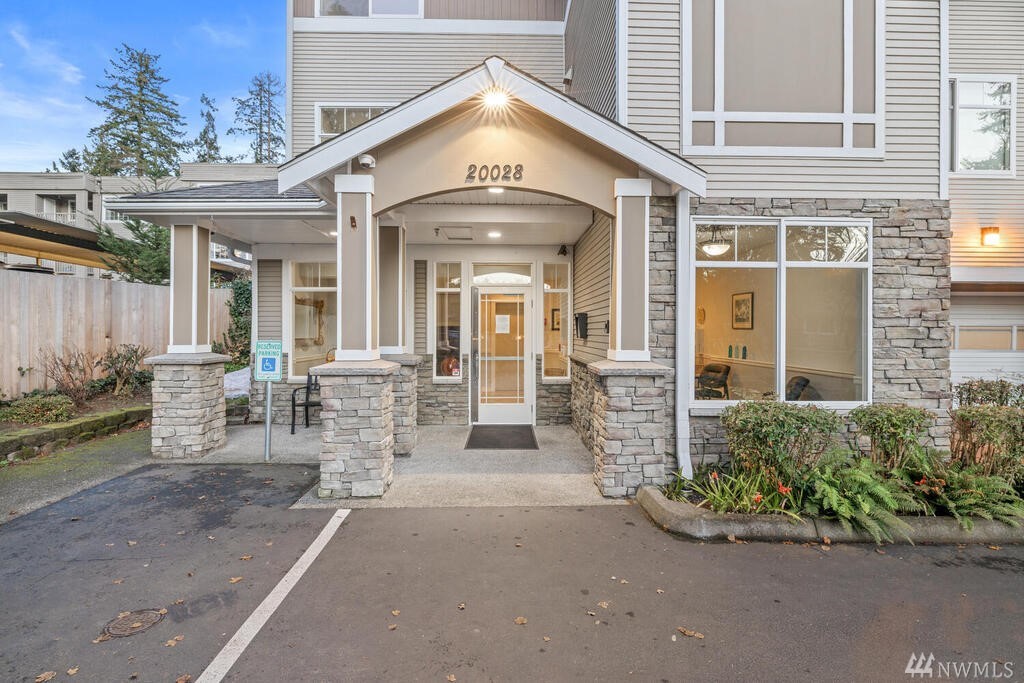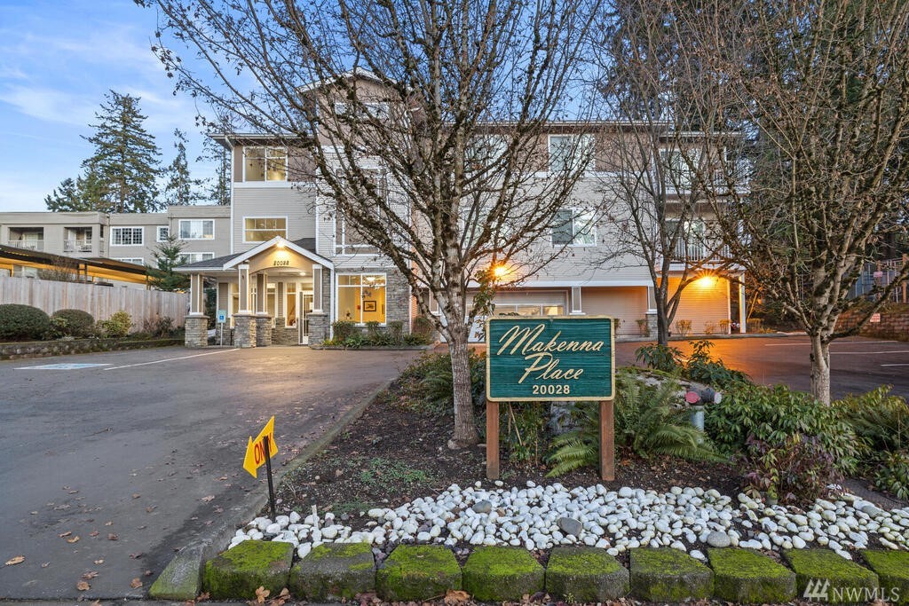 Conveniently located 2 bed 2 bath condo at Makenna Place! Meticulously maintained unit with soaring ceilings, private balcony and a great layout. Stainless steel kitchen appliances with a handy breakfast bar for increased counter space. Versatile living room can accommodate many different layouts. End unit with easy access to the garage. Secured building with common garage which includes two reserved parking spaces and an additional storage unit located on the same floor as the unit. Located minutes from I-5, Costco and all amenities Shoreline and Lake Forest Park has to offer. HOA is managed in-house and very well run. Currently under rental cap and 2021 HOA dues did not increase!