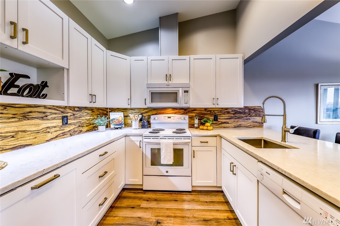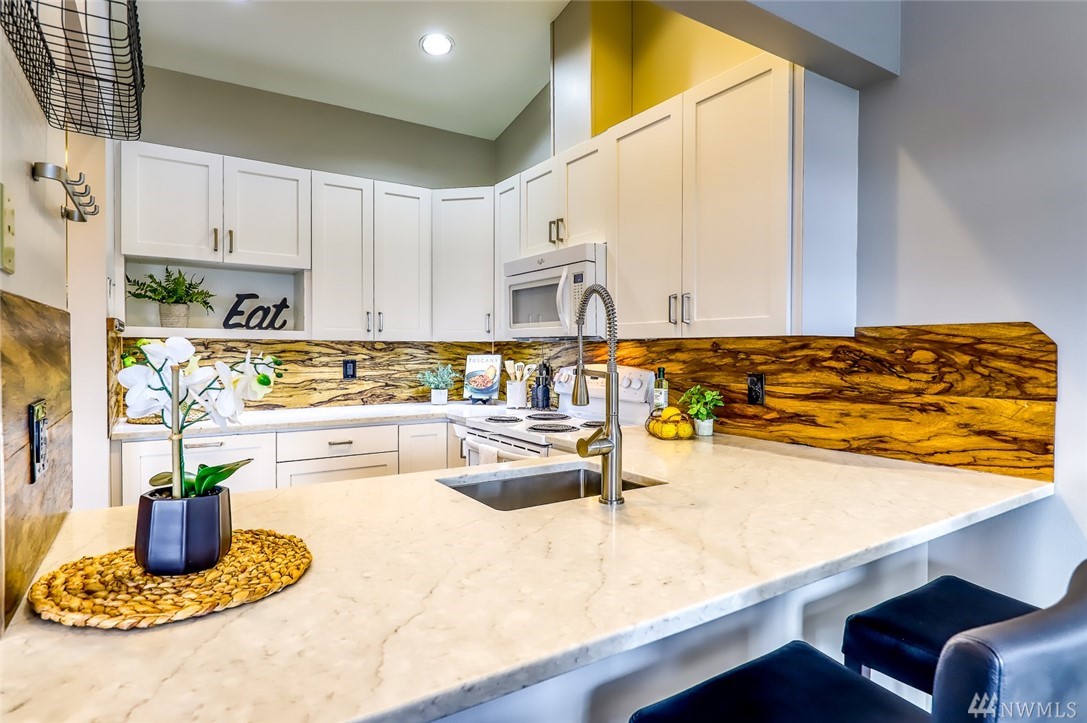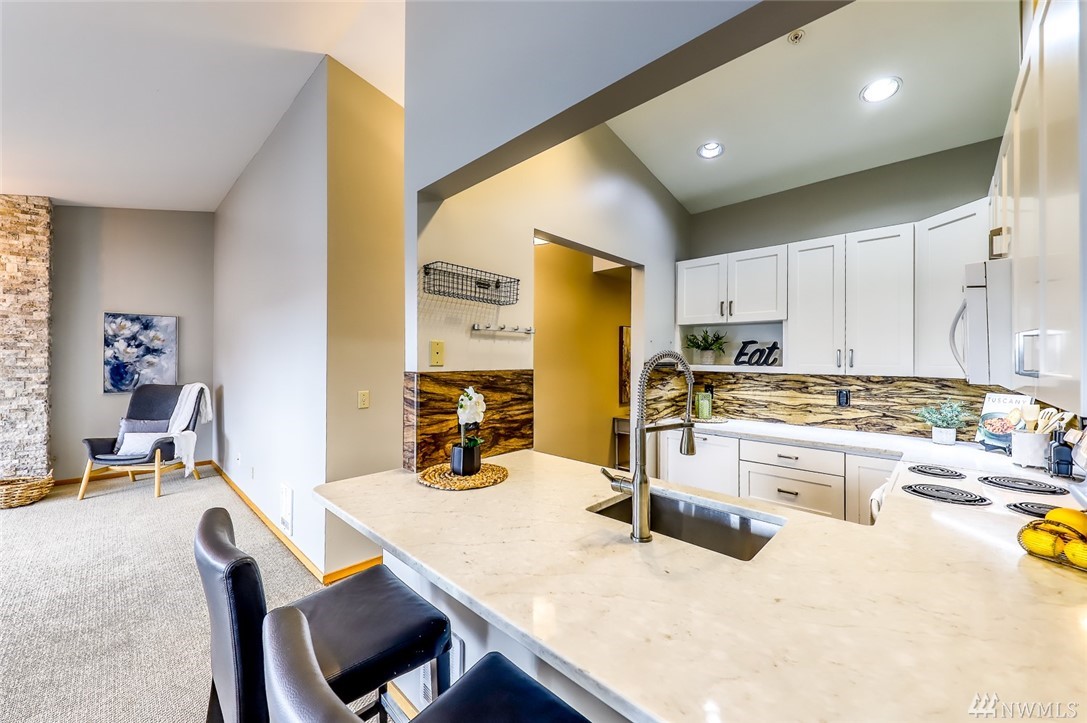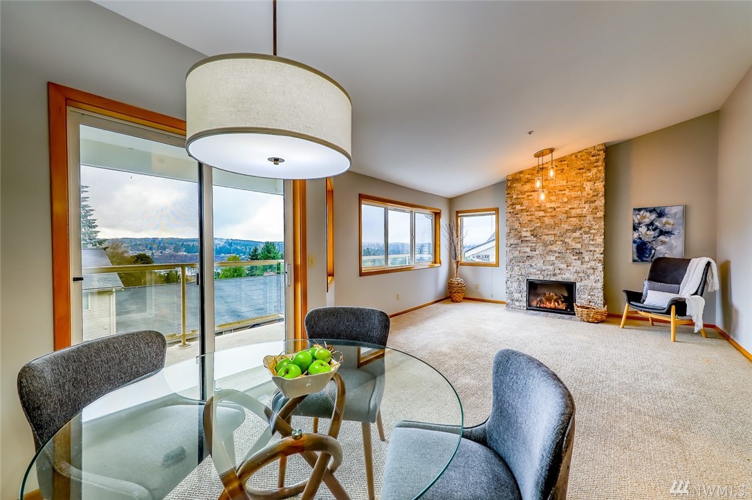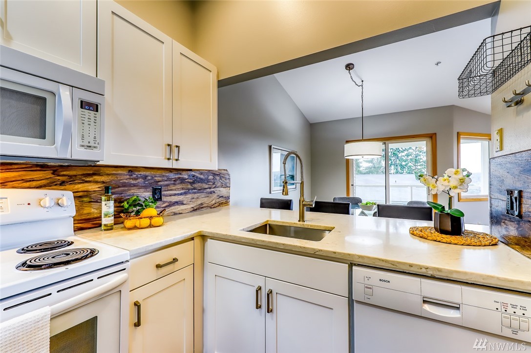 BEAUTIFUL CONDO with views of the Olympics & Appletree Cove! You will love the light & the sights from this tastefully updated 3-bed/2-bath condo just minutes to town & ferries! Amenities include an updated kitchen w/bar seating, new cabinets, new quartz countertops, custom-milled backsplash, new sink & fixture, Bosch dishwasher, fabulous under-counter fridge plus a separate freezer unit. Updates also include new laminate flooring, forced-convection fireplace w/beautiful floor-to-ceiling stone surround & updated dimmable lighting in most areas. You'll also find California closet systems throughout, updated bathroom flooring & too much more to mention. Single-car garage plus carport parking is also yours. Welcome home!