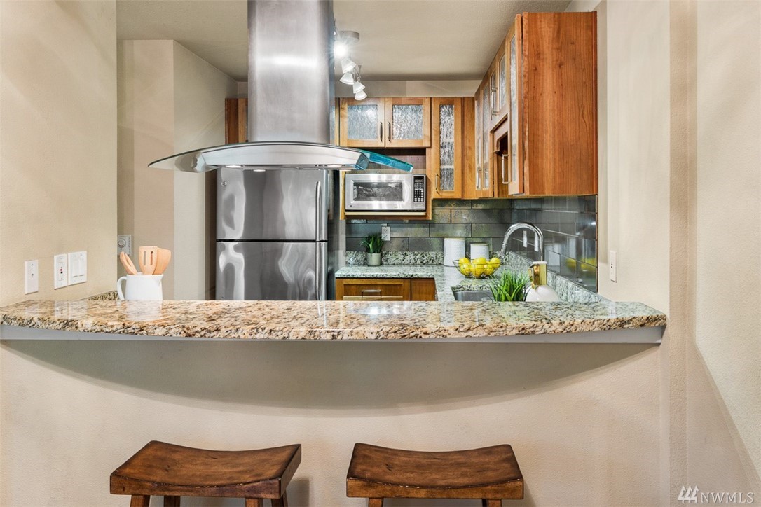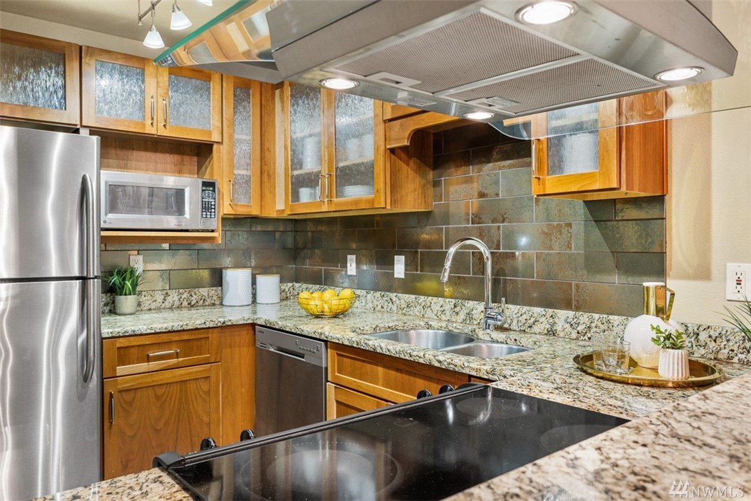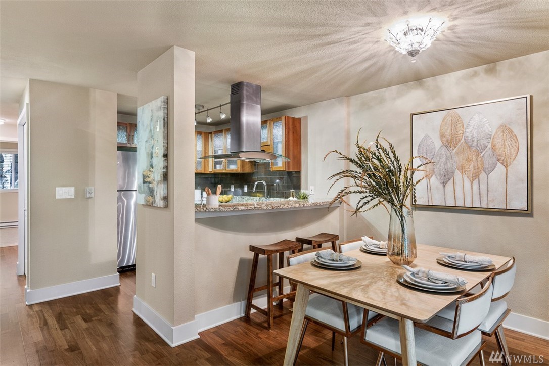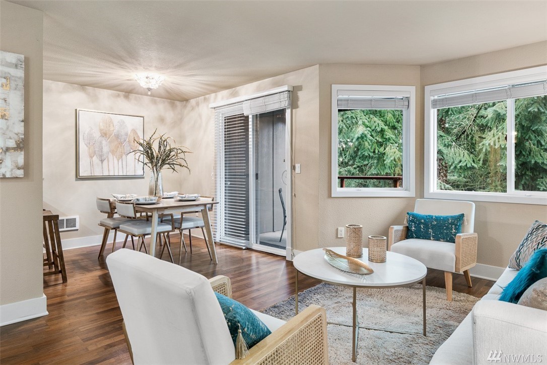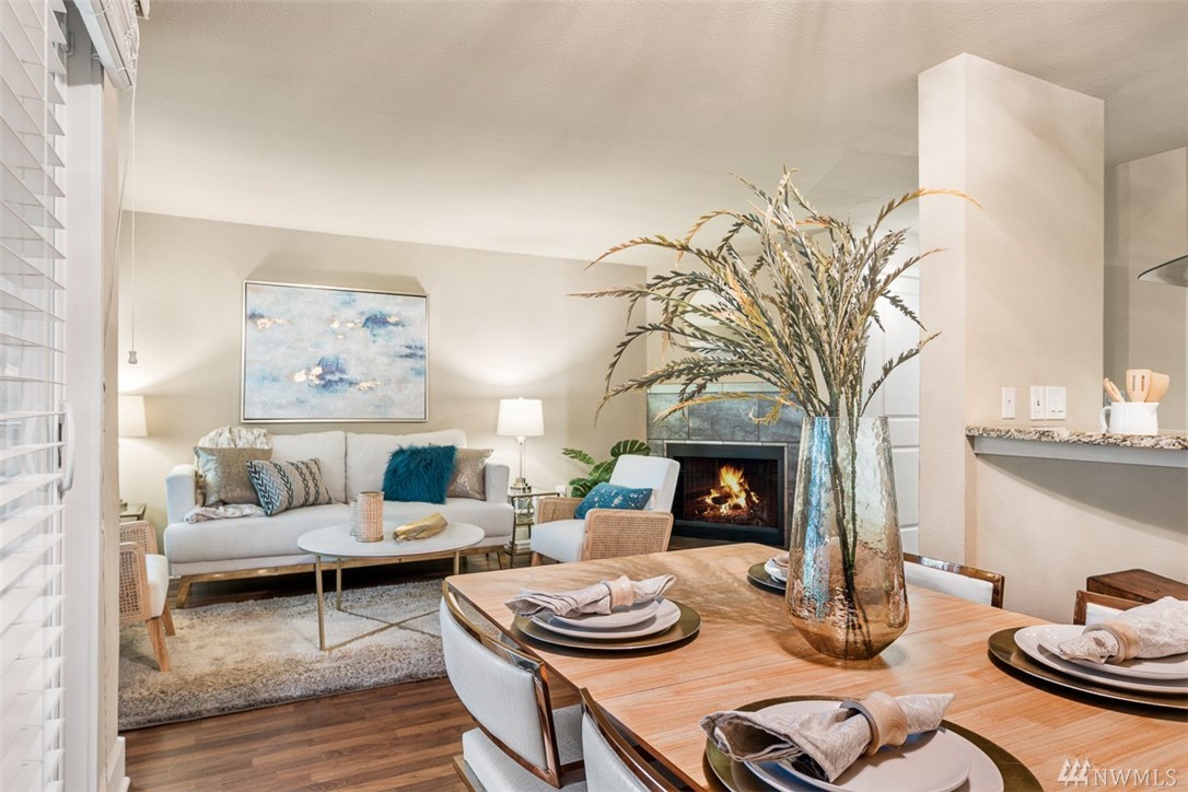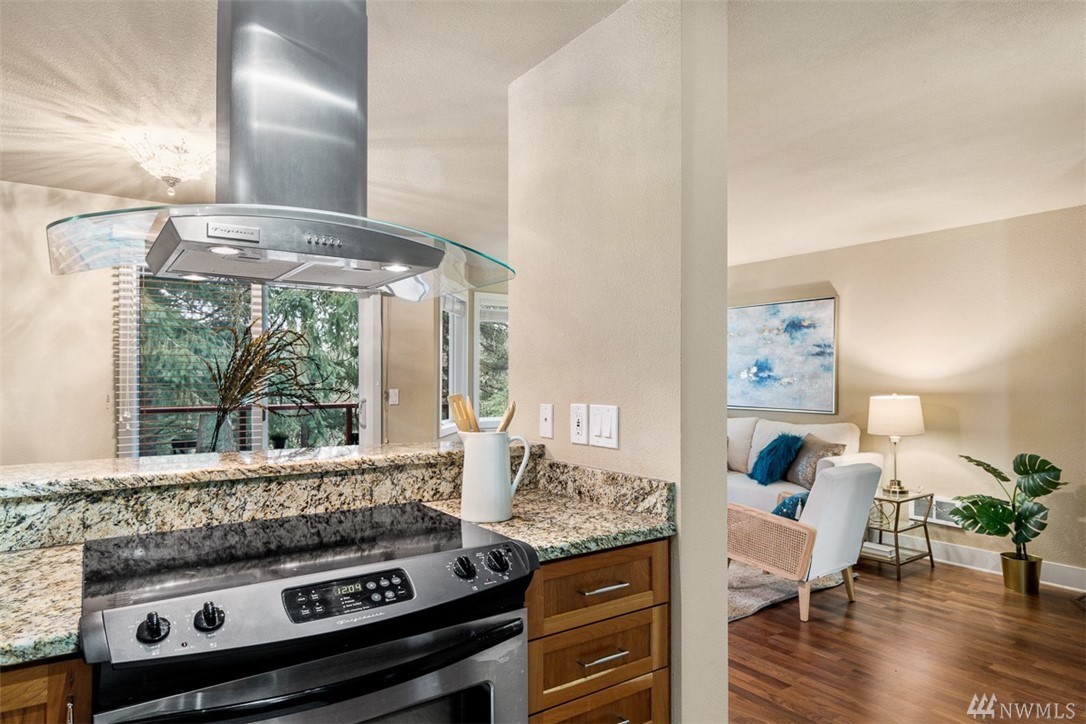 Immaculate & beautifully maintained 1BR end home, serene & private & no stairs. Gorgeous wood flooring through-out main living area with stunning kitchen, ss applcs & slab granite cntrtops. Wonderful open living area w/FP & cov'd deck for optimum entertaining. Lovely bath w/tile floors & slab granite. Gracious masterbdrm w/views of the lush green grounds. Outstanding loctn - just steps to the Cross Kirkland Corridor for walking, jogging, biking, min to 520 & 405, shopping, dining & more! The perfect 1st or 2nd home for an incredible price & value! Hurry!